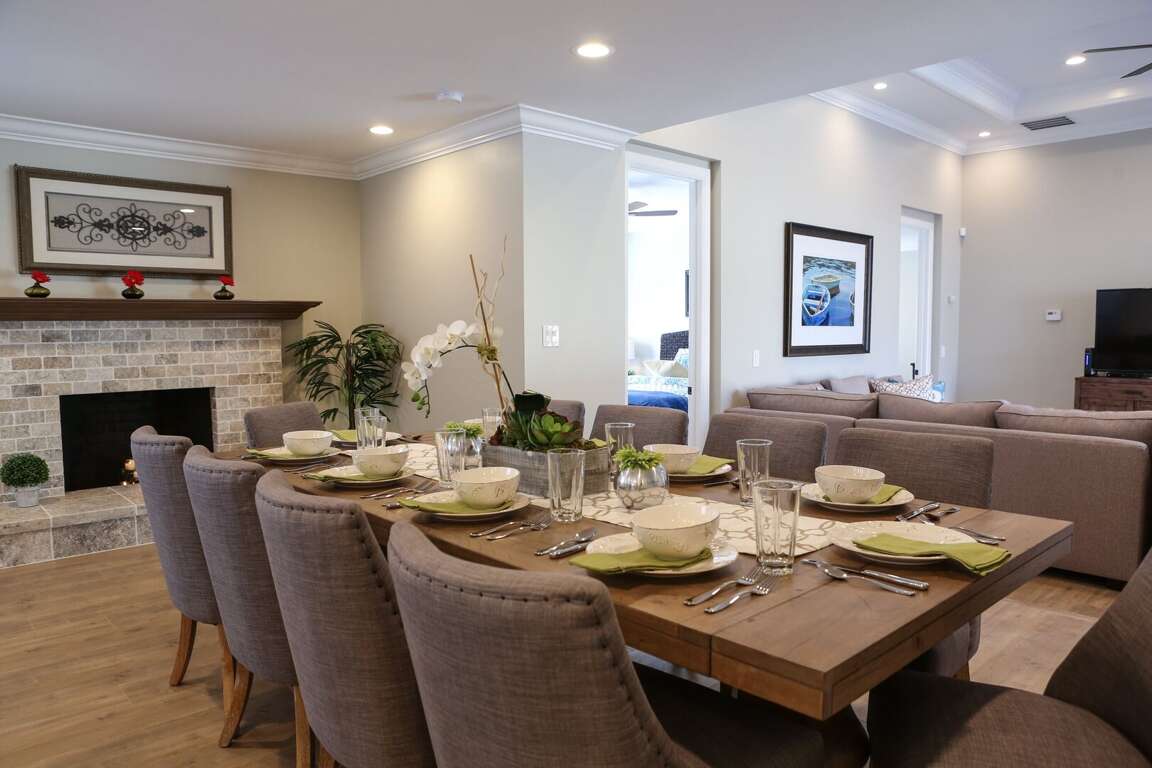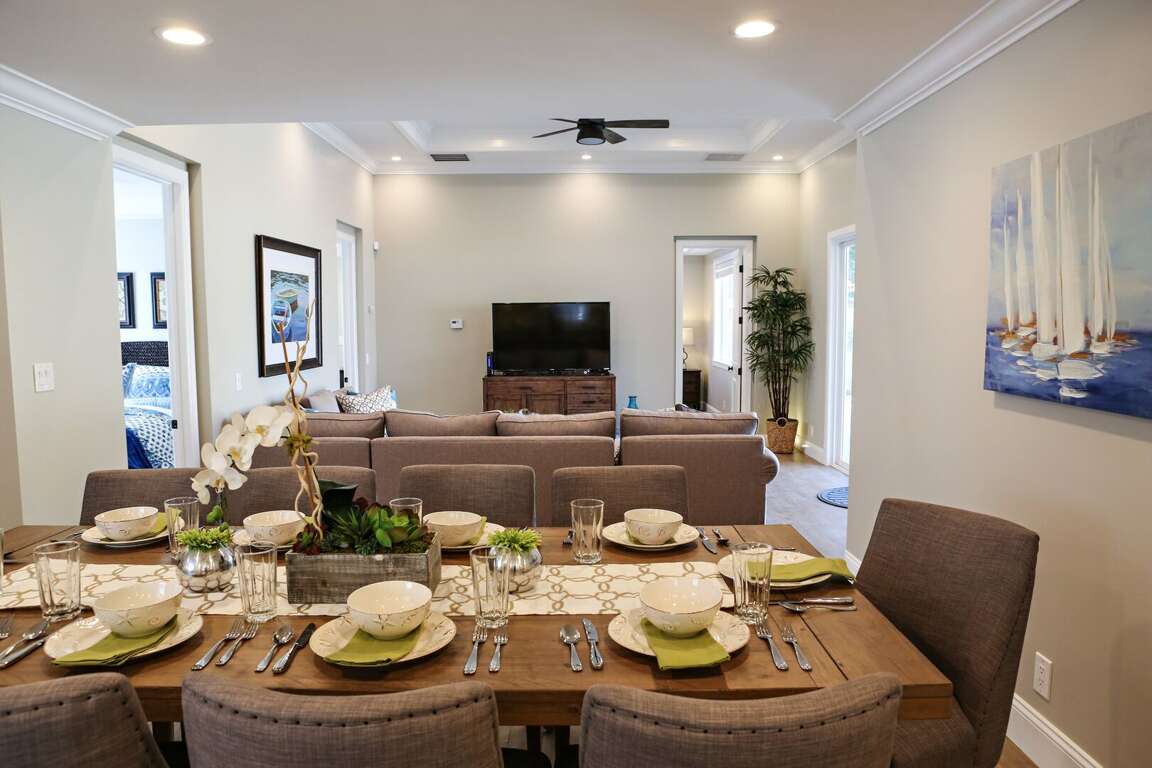 The main living space is open concept, with a kitchen upgraded with granite countertops and custom-paneled cabinetry, as well as stainless steel appliances, including a stove/oven, refrigerator, and other appliances. The dining room comfortably seats 10, with additional seating at the breakfast bar and kitchen countertop. The family room has a large sectional with plenty of seating. The sectional can sleep two people in a king size. Relax in our sparkling Jacuzzi in the rear yard. We will monitor your temperature remotely so that it's on and at the correct temperature when you arrive. Our outdoor seating includes a natural-gas BBQ grill.