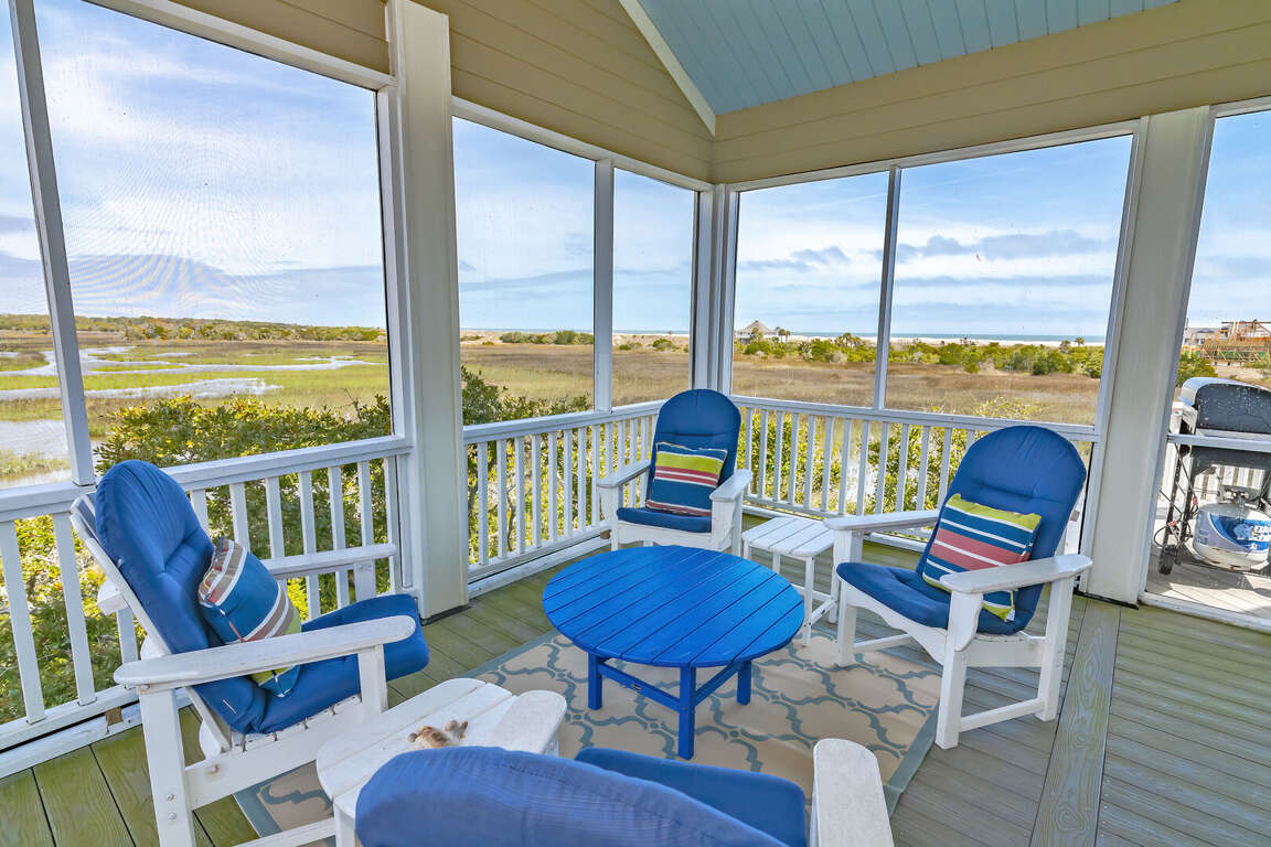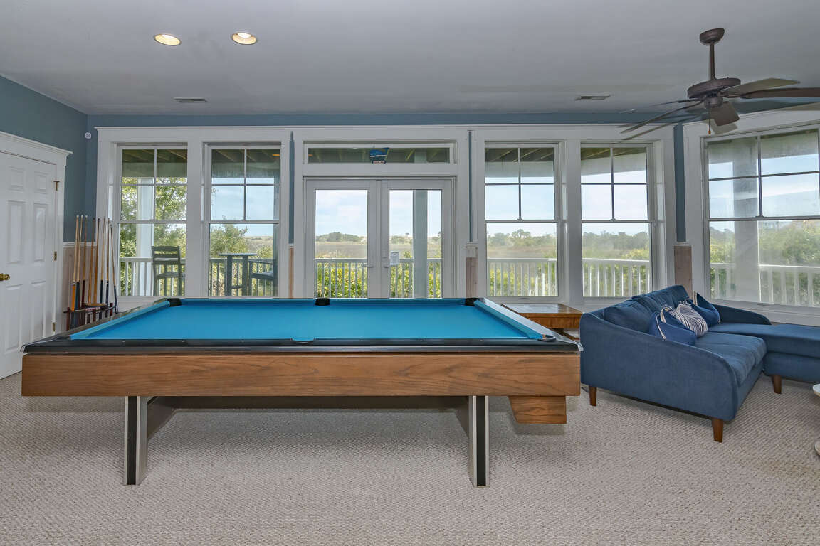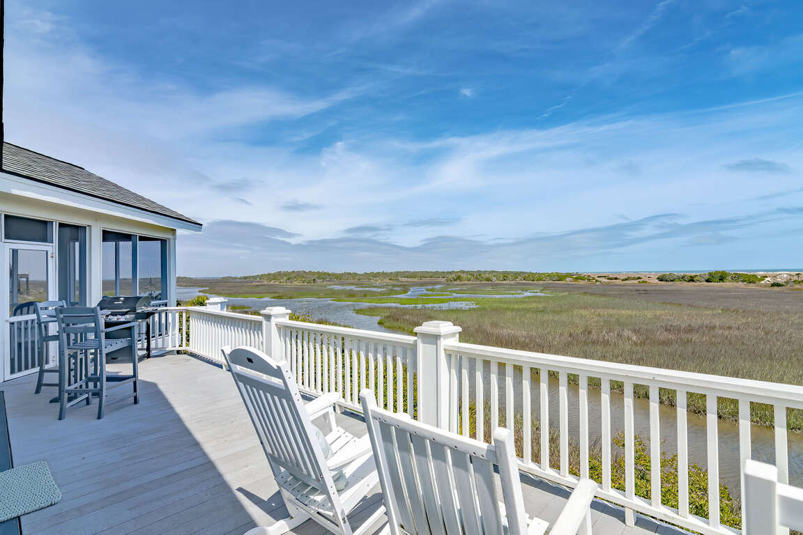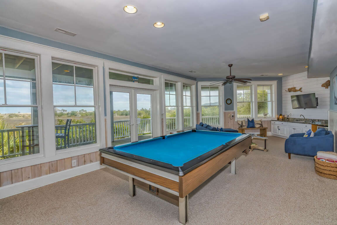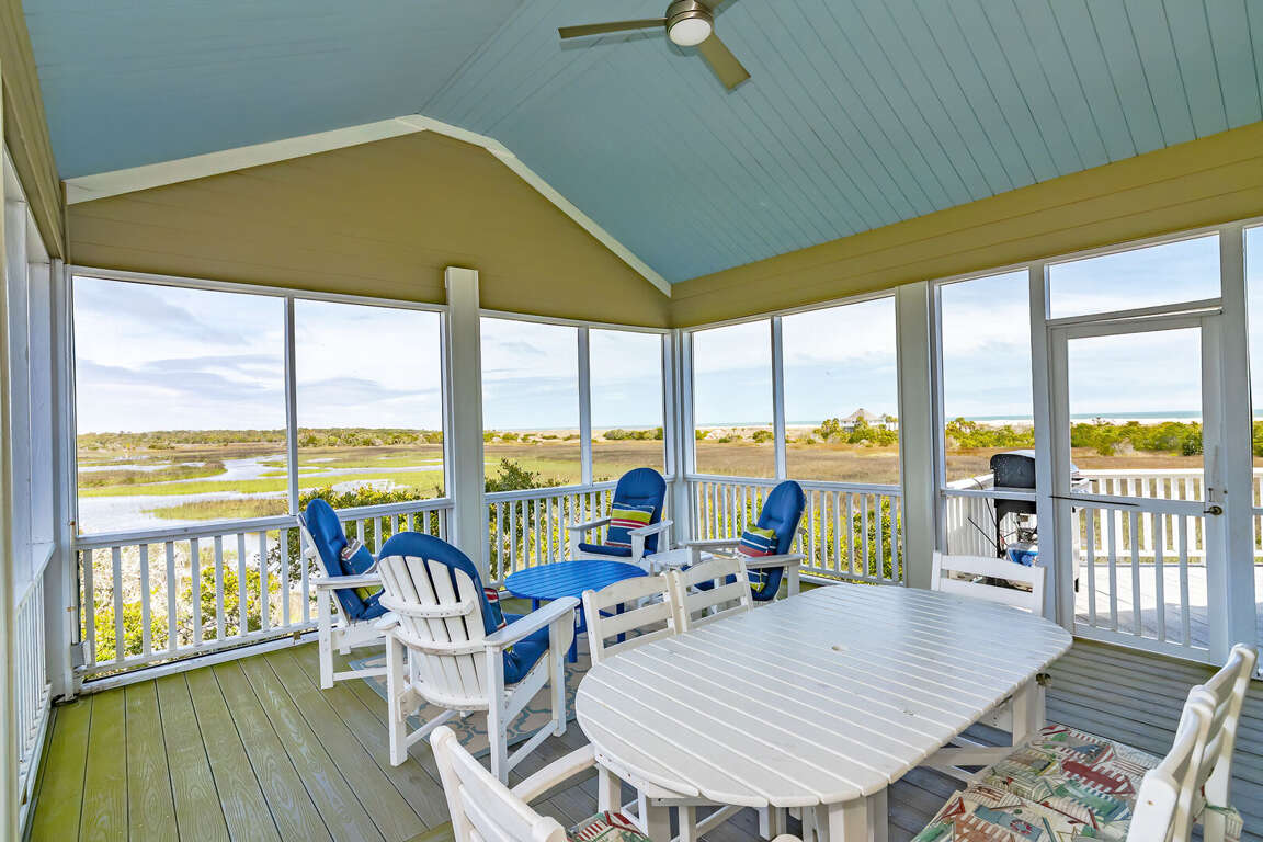 Sea Urchins is uniquely located on a narrow strip between Bald Head Creek and Cape Creek. It borders Bald Head Island’s 10,000+ acre Bird and Wildlife Sanctuary, Middle Island, which is one of the most peaceful and beautiful areas on the island. You can enjoy spectacular panoramic views from both the front and back of your house, which allows you to see the ocean, marsh, sunrise, and sunset. Paradise surrounds your home! This sprawling, 3,000+ square foot retreat is perfect for entertaining. This two-story retreat, measuring 3,000+ sq. The house has two decks that run the length of it. A screened porch with a dining table and an upper deck allow you to take in the stunning views. The upper level has an open floor plan that includes the main living area with comfortable seating and large-screen TV. The well-equipped kitchen features stainless appliances, granite countertops, and a breakfast bar. The large dining table is located between the living and kitchen areas. It offers plenty of seating. One of the master suites is located on the upper floor. It has a king-sized bed, a full bathroom, and access to the deck that overlooks stunning views of the sea and marsh. The bunk room can sleep four people and is ideal for children. It also boasts a private, full-size bathroom. Lower floor features a recreation area, which was recently updated and has a pool table and a wet bar. There is also a second living room with oversized TV. High speed internet access and smart TVs make it possible to watch your favorite Netflix and Prime videos. This floor also includes a queen bedroom with an en suite and a second master bedroom with private deck. There are two laundry rooms. The house is situated on a 1-acre lot, which provides privacy and peace. It is only 0.2 miles walk or a quick golf cart ride to Middle Island's private beach access onto the beautiful East Beach. For your comfort and enjoyment, there are beach chairs, beach towels and two 4-seater golf cars. Bald Head Island Club memberships, including golf, and Shoals Club memberships, are available for purchase separately. Sea Urchins is your new BHI tradition! 4 Bedrooms