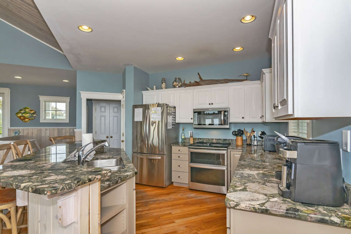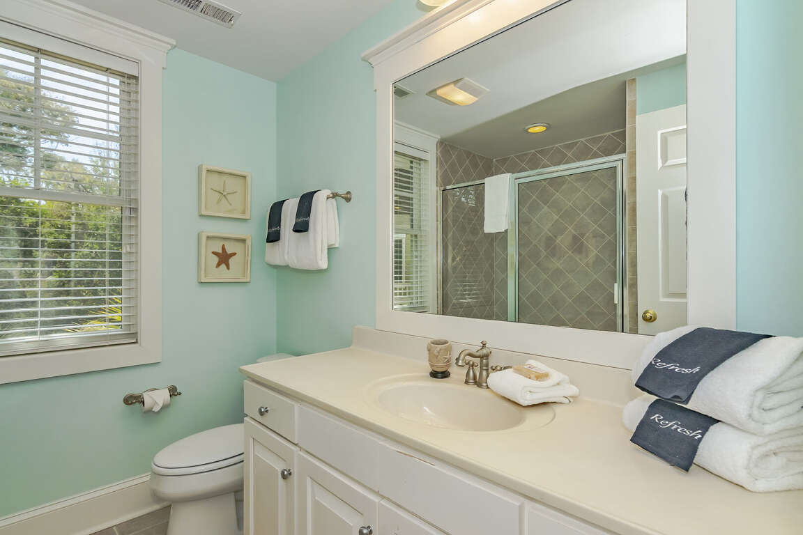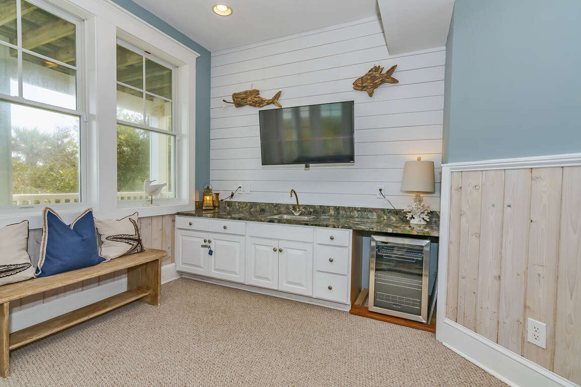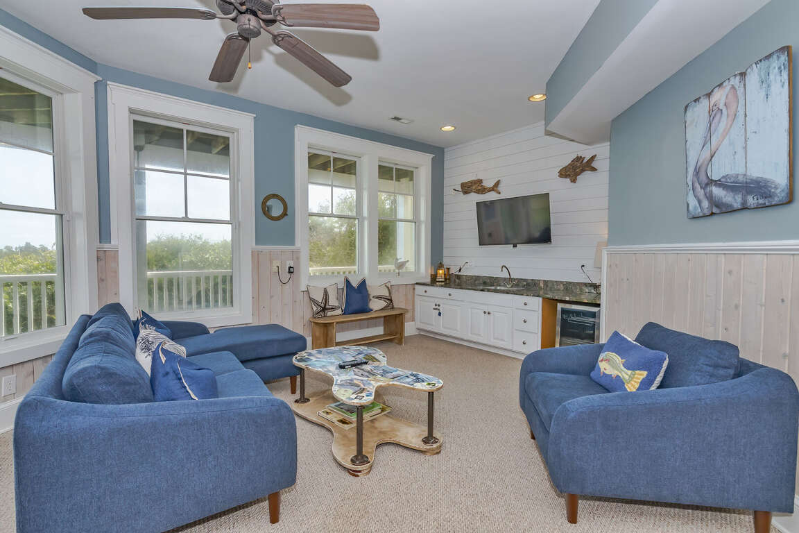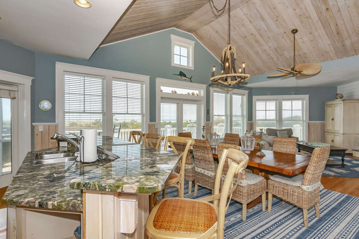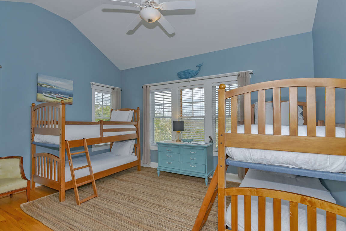Sea Urchins is uniquely located on a narrow strip between Bald Head Creek and Cape Creek. It borders Bald Head Island’s 10,000+ acre Bird and Wildlife Sanctuary, Middle Island, which is one of the most peaceful and beautiful areas on the island. You can enjoy spectacular panoramic views from both the front and back of your house, which allows you to see the ocean, marsh, sunrise, and sunset. Paradise surrounds your home! This sprawling, 3,000+ square foot retreat is perfect for entertaining. This two-story retreat, measuring 3,000+ sq. The house has two decks that run the length of it. A screened porch with a dining table and an upper deck allow you to take in the stunning views. The upper level has an open floor plan that includes the main living area with comfortable seating and large-screen TV. The well-equipped kitchen features stainless appliances, granite countertops, and a breakfast bar. The large dining table is located between the living and kitchen areas. It offers plenty of seating. One of the master suites is located on the upper floor. It has a king-sized bed, a full bathroom, and access to the deck that overlooks stunning views of the sea and marsh. The bunk room can sleep four people and is ideal for children. It also boasts a private, full-size bathroom. Lower floor features a recreation area, which was recently updated and has a pool table and a wet bar. There is also a second living room with oversized TV. High speed internet access and smart TVs make it possible to watch your favorite Netflix and Prime videos. This floor also includes a queen bedroom with an en suite and a second master bedroom with private deck. There are two laundry rooms. The house is situated on a 1-acre lot, which provides privacy and peace. It is only 0.2 miles walk or a quick golf cart ride to Middle Island's private beach access onto the beautiful East Beach. For your comfort and enjoyment, there are beach chairs, beach towels and two 4-seater golf cars. Bald Head Island Club memberships, including golf, and Shoals Club memberships, are available for purchase separately. Sea Urchins is your new BHI tradition! 4 Bedrooms
