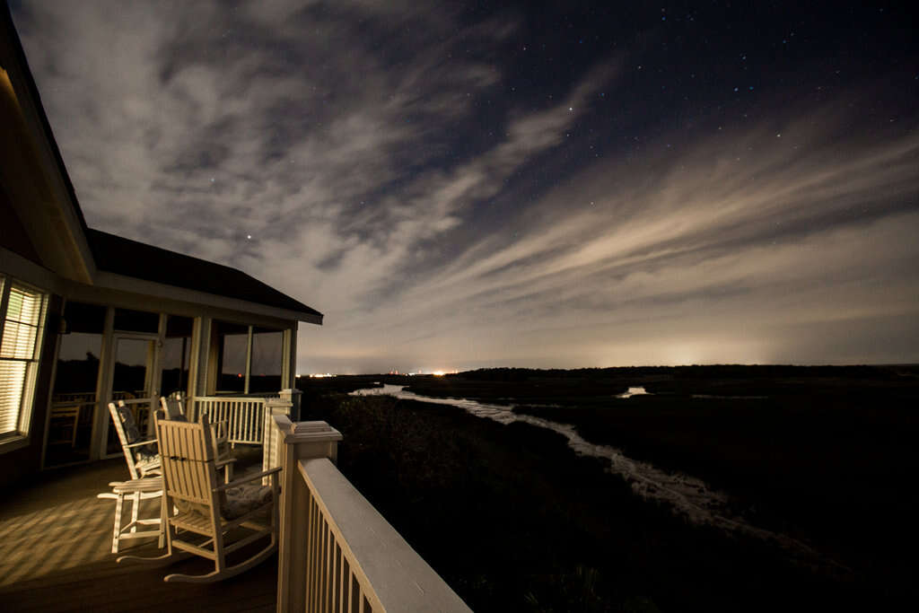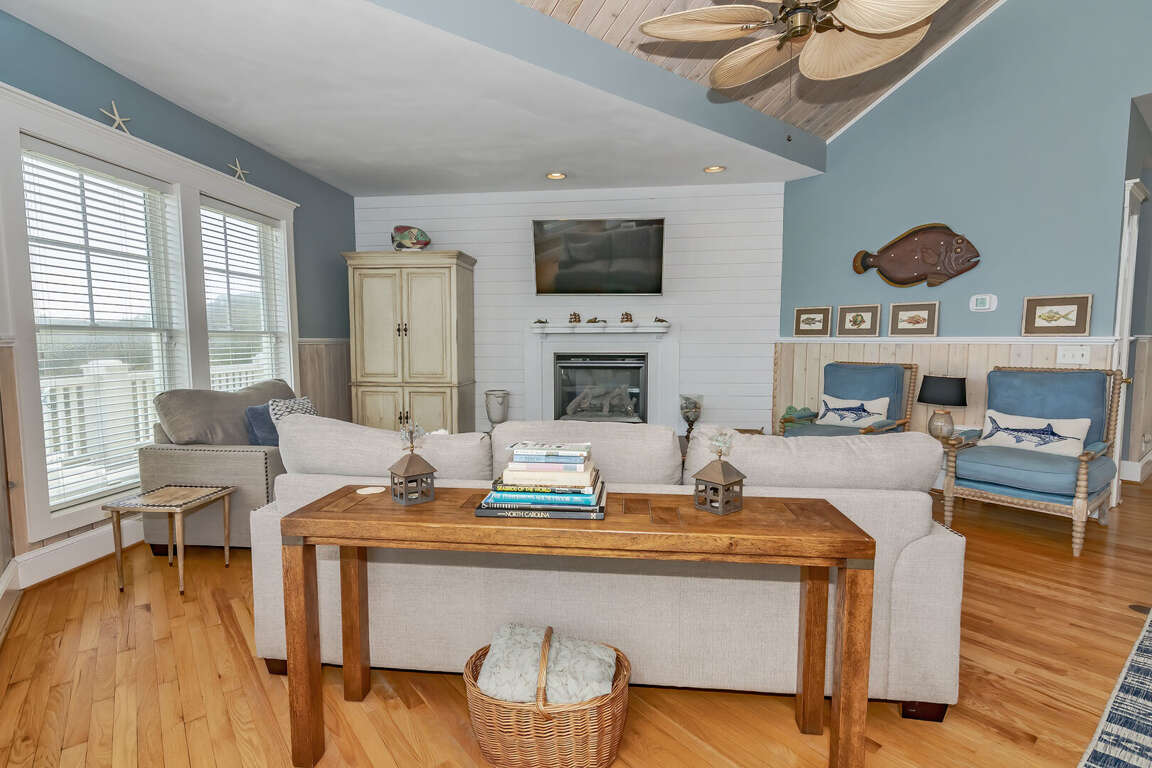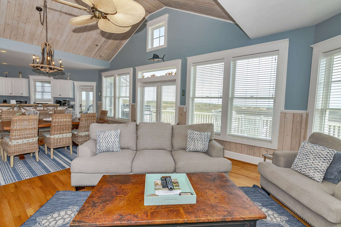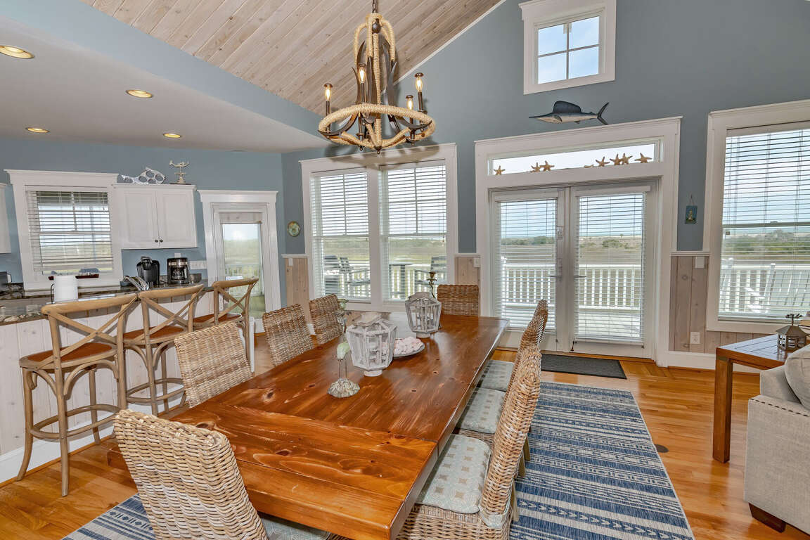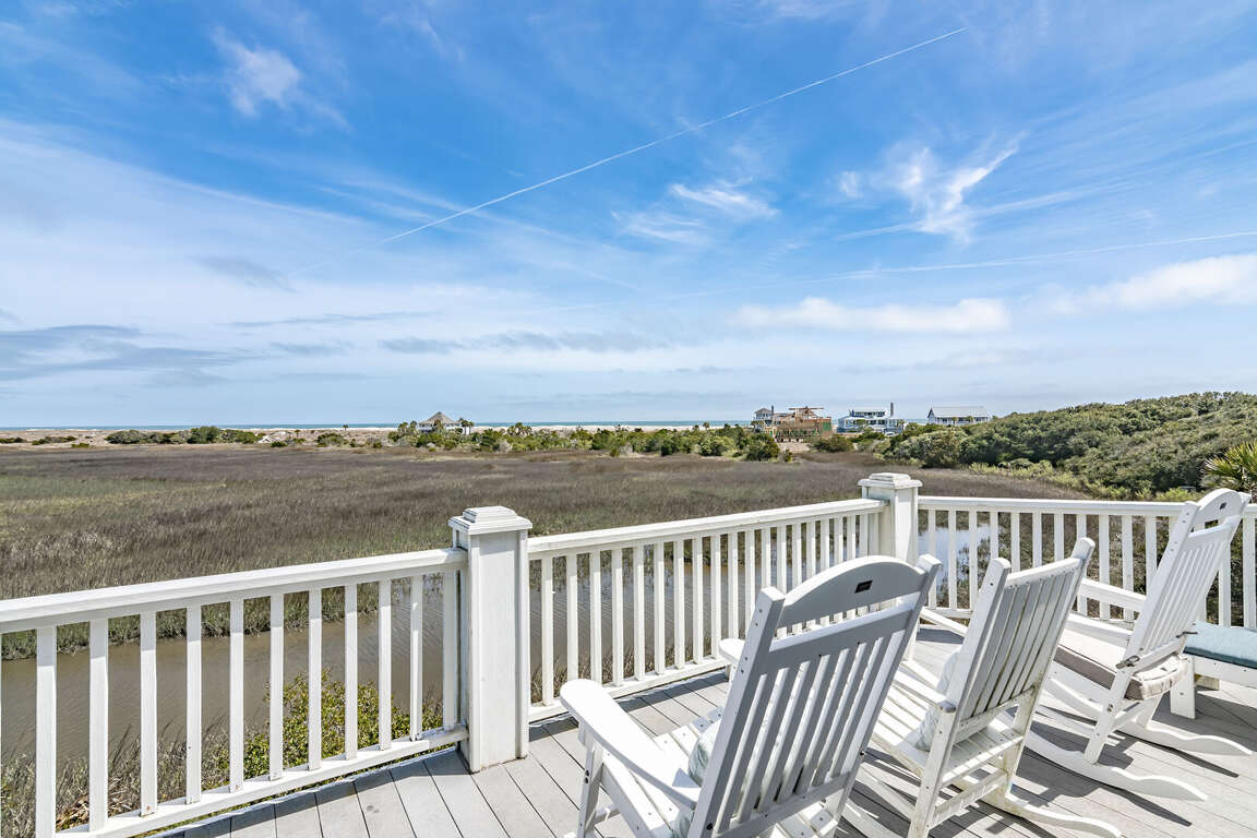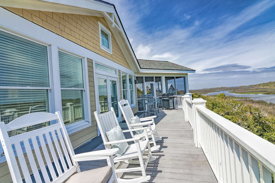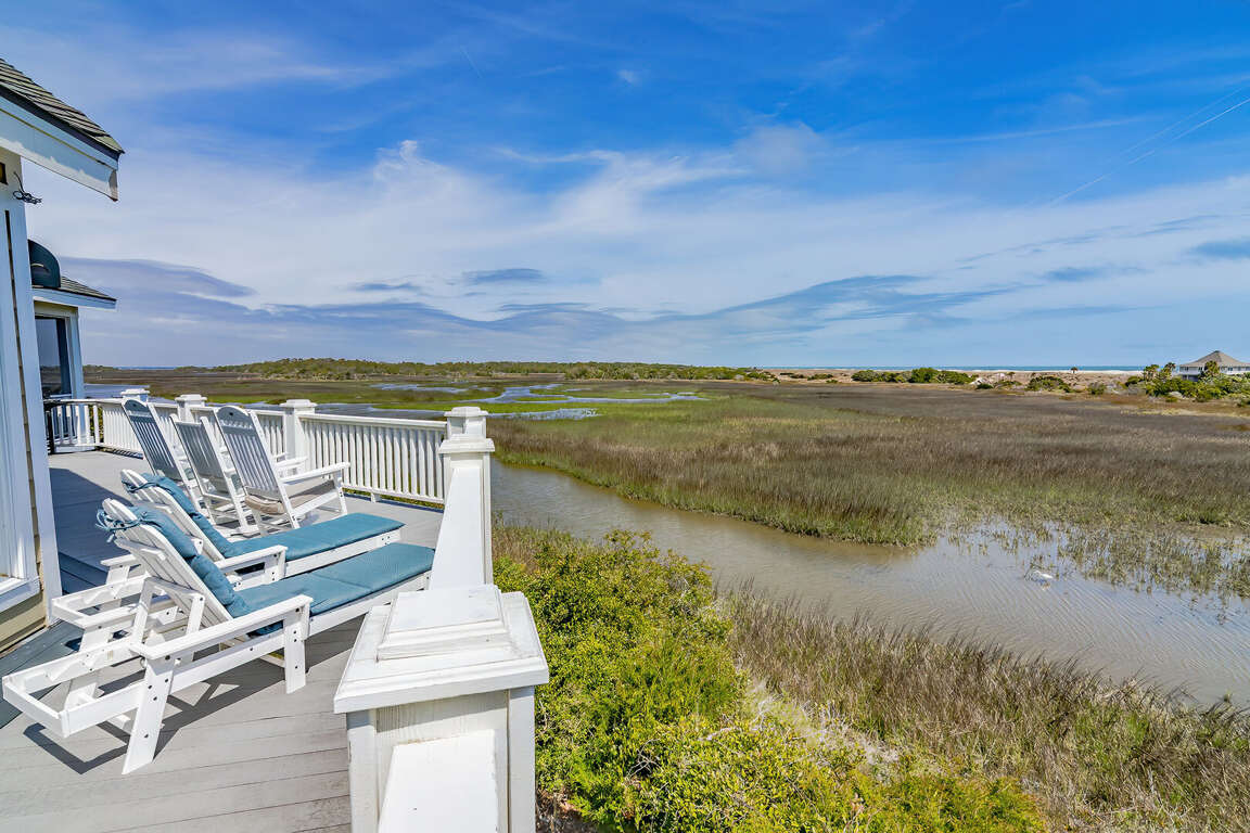 Located in the peaceful setting between Bald Head Creek and Cape Creek, this luxurious vacation rental in Bald Head Island, NC offers a serene retreat with panoramic views of the ocean, marsh, sunrise, and sunset. The interior design of the 3,000+ square foot retreat features a well-thought-out layout with four bedrooms, four full bathrooms, and two half bathrooms. The two-story house boasts decks running the length of it, providing ample outdoor spaces to enjoy the breathtaking views. The upper floor impresses with an open floor plan, the main living area, and a well-equipped kitchen, while the lower floor offers a recreation area, a second living room, and cozy bedrooms. This vacation home perfectly blends comfort with stunning outdoor vistas.