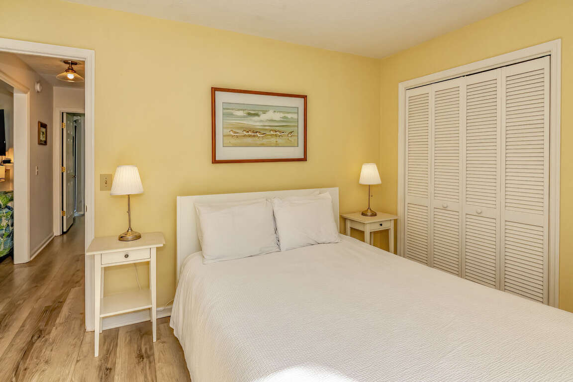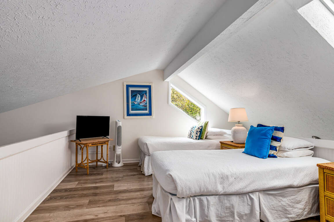 The condo has two bedrooms. The loft can be used for a bedroom that can sleep 2 people or as a TV or game room. There is a master suite with a private bath, and a guest room with a full bath in the hall. The master bedroom and guest room both have queen beds. Two twin beds in loft. Fully equipped kitchen for cooking at home. Both decks have tables and chairs. Flat screen TVs in the living room and loft. The dining table seats 6 people, but there are also 4 seats at the kitchen bar. Golf cart for 4 peoples. Garage has beach chairs, boogie boards, boogie bikes, beach toys and adult and children's bicycles.