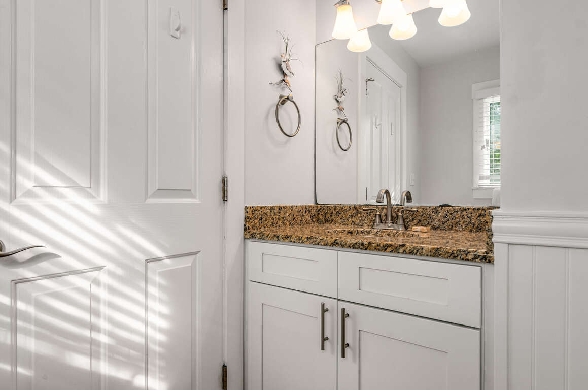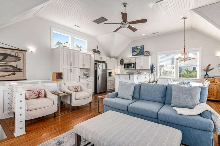 "Balvenie", located in Flora's Bluff, is on South Beach. We are directly across the street from the beach, with direct access to the beach just steps away. The living room, dining area and kitchen are located upstairs. We have a king-sized master bedroom downstairs, along with two additional bedrooms. The second bedroom is a queen-sized room, and the third bedroom/nook is a twin with a trundle. Both rooms share the same bathroom.