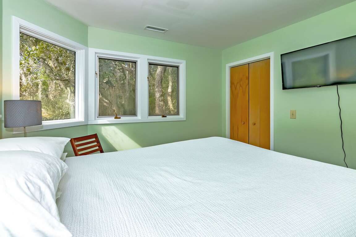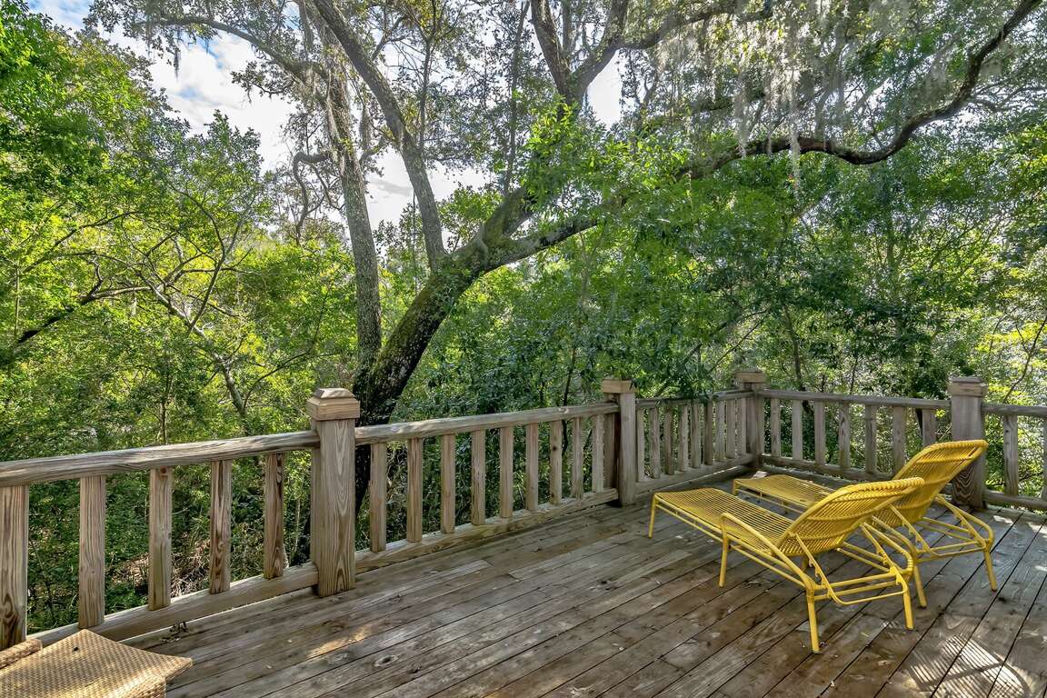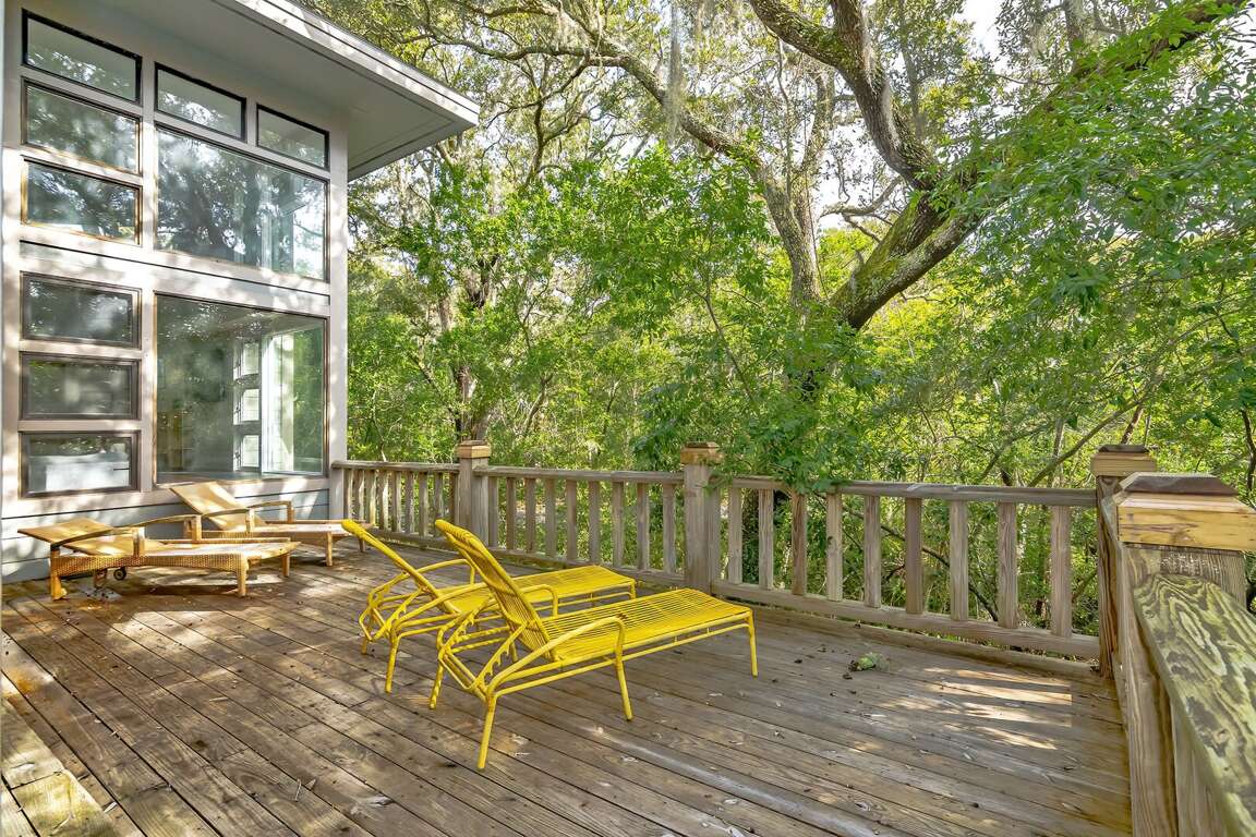 "Bay Breeze", a three-bedroom / two-bathroom home, is located in the Maritime Forest off North Bald Head Wynd. This home is nestled around beautiful Live Oaks, giving you the feeling of being in a tree house. The large, expansive window lets in plenty of light. The open floor plan is perfect for family gatherings. The first floor contains the garage and entrance. The main living area is located on the second floor, within the tops the trees. Please note that there are no blinds on these windows. The kitchen is very well-stocked and well-maintained. The master king suite is upstairs, along with two other bedrooms and a shared bathroom. The second bedroom has a queen bed and the third bedroom has two twin beds. We have several large decks outside. There is a large outdoor shower downstairs and plenty of space for grilling. A nice screened-in porch is located upstairs, off the living room. It has an outdoor dining area with a hammock. A sun-bathing deck is located directly off the screened in porch.