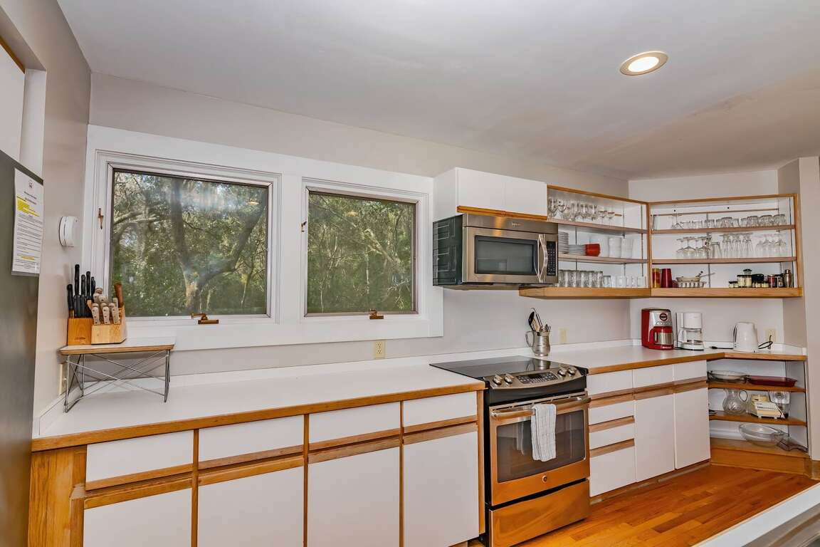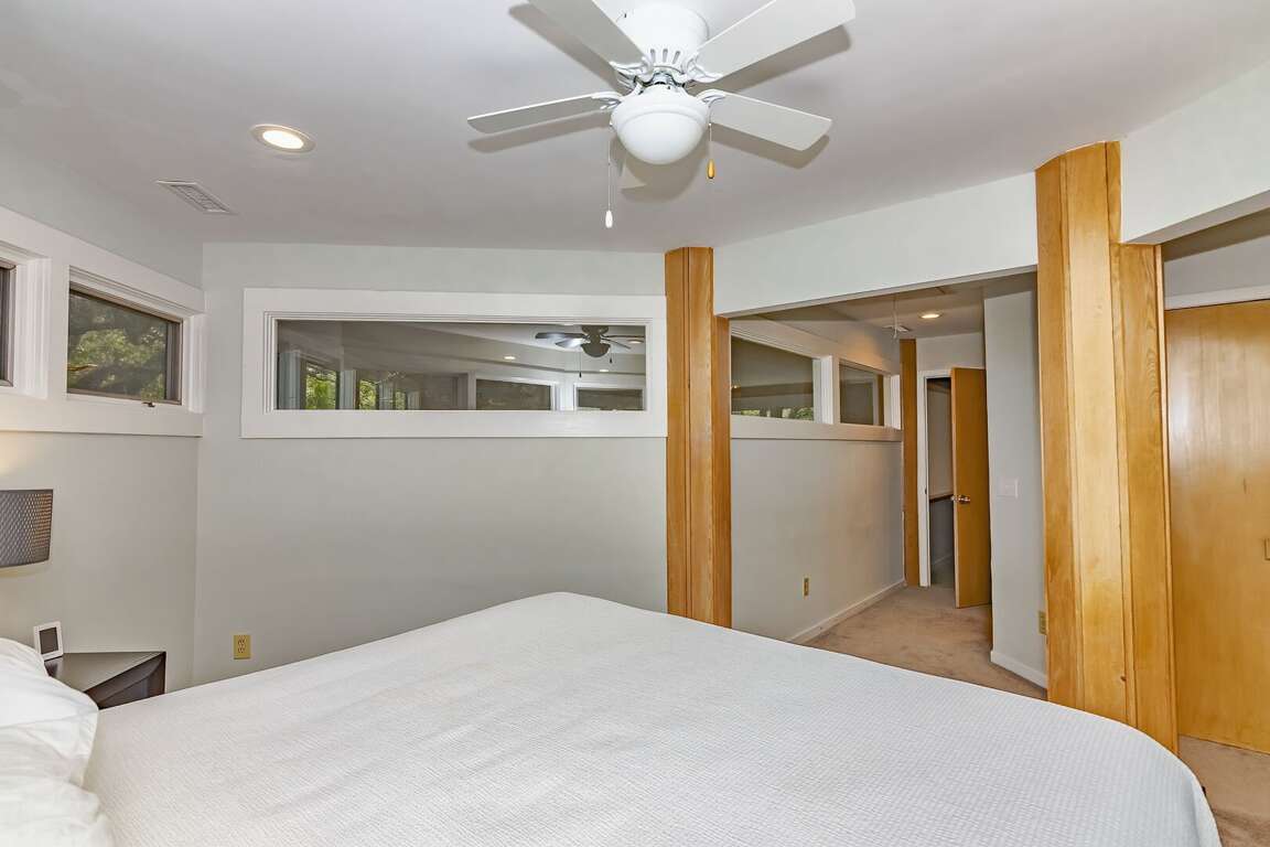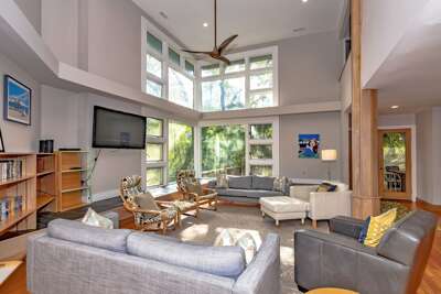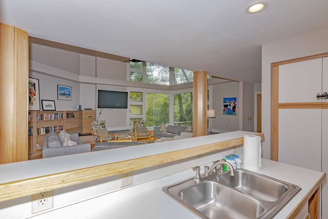 The interior of Bay Breeze House boasts modern amenities and a spacious layout, perfect for comfortable and relaxing family gatherings. The house is tastefully decorated with modern decor, creating a stylish and inviting atmosphere throughout. The living room features comfortable furnishings, providing a cozy space for unwinding after a day of outdoor activities. Large, expansive windows allow natural light to fill the rooms, enhancing the bright and airy feel of the house. The well-stocked kitchen is equipped with everything needed to prepare delicious meals for family and friends. With a master king suite upstairs, a second bedroom with a queen bed, and a third bedroom with two twin beds, Bay Breeze House offers ample sleeping arrangements for up to six guests.