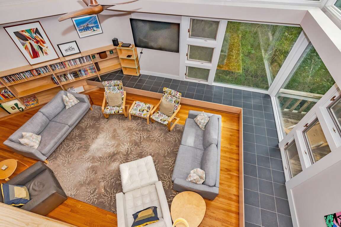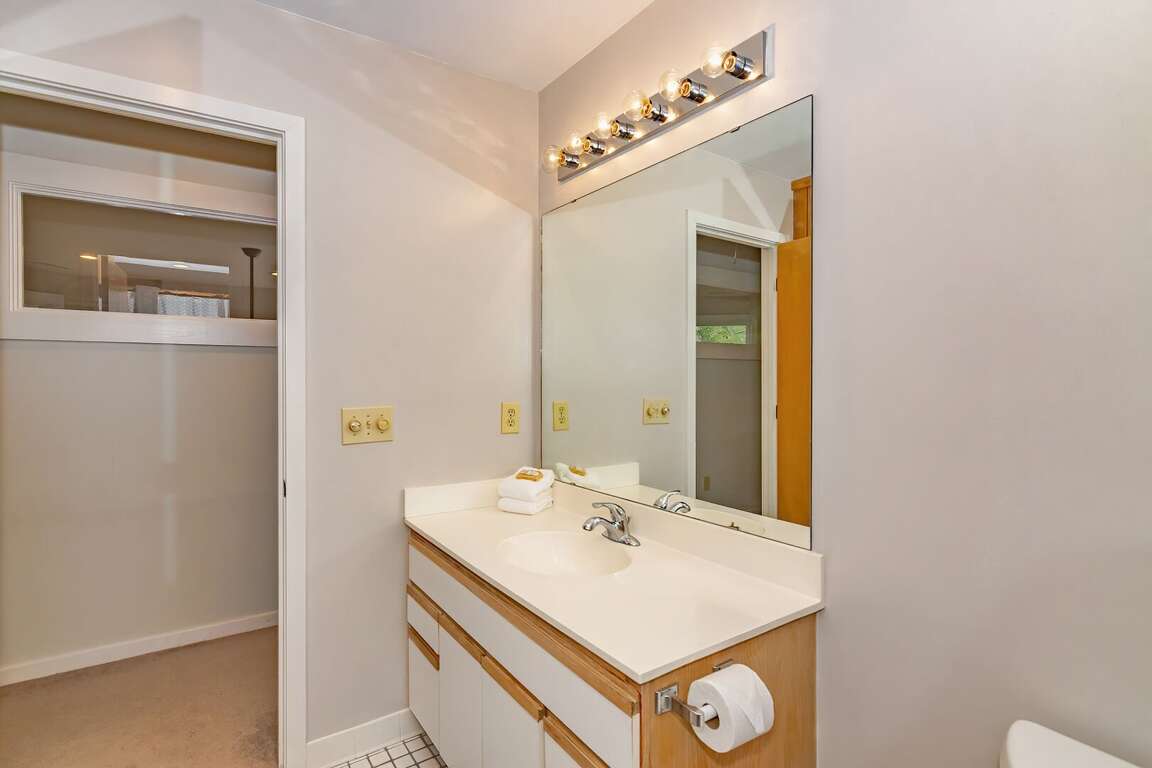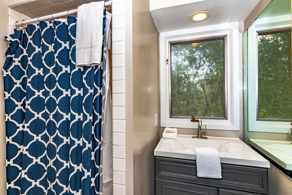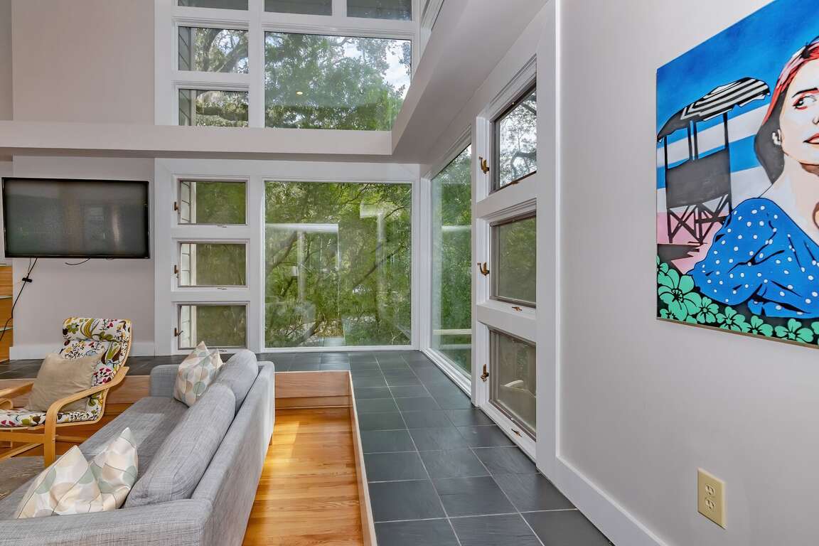 The interior of Bay Breeze House boasts modern amenities and a spacious layout, perfect for comfortable and relaxing family gatherings. The house is tastefully decorated with modern decor, creating a stylish and inviting atmosphere throughout. The living room features comfortable furnishings, providing a cozy space for unwinding after a day of outdoor activities. Large, expansive windows allow natural light to fill the rooms, enhancing the bright and airy feel of the house. The well-stocked kitchen is equipped with everything needed to prepare delicious meals for family and friends. With a master king suite upstairs, a second bedroom with a queen bed, and a third bedroom with two twin beds, Bay Breeze House offers ample sleeping arrangements for up to six guests.