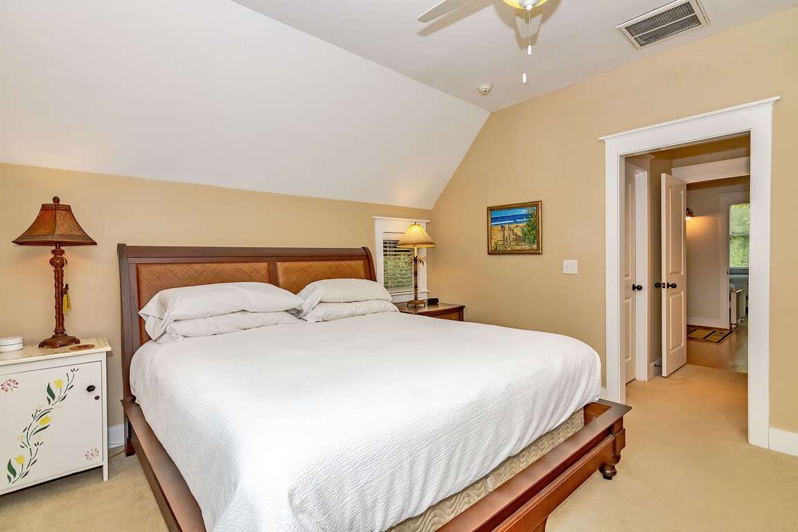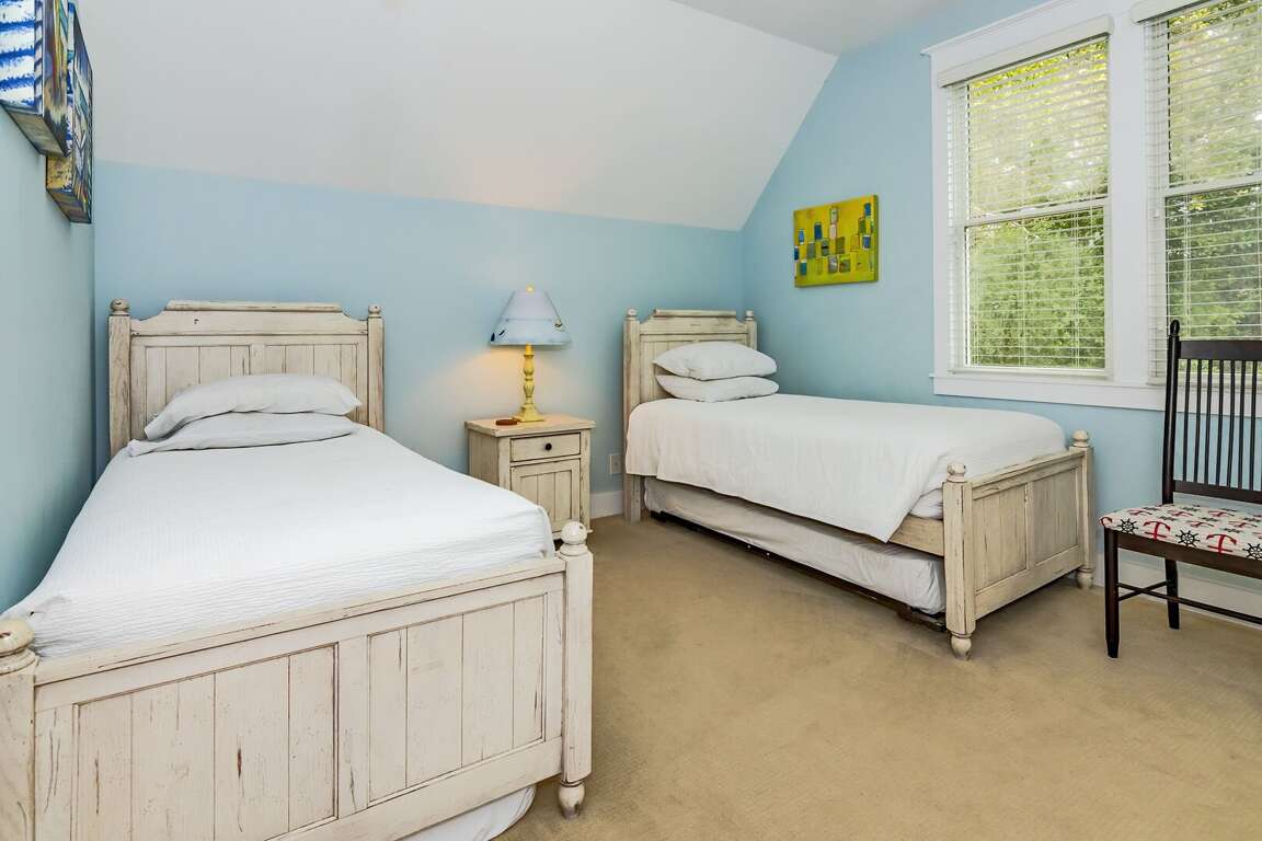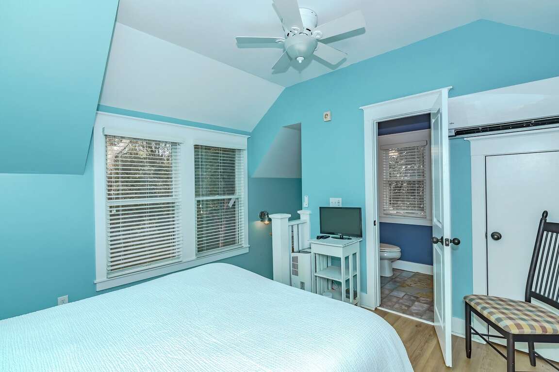 Two spacious bedrooms are located upstairs, each with its own private bathroom. The first bedroom has a king-size bed, while the second bedroom has two twins with a trundle. The detached crofter, which has a queen-sized bed and a full bath, offers guests privacy.
