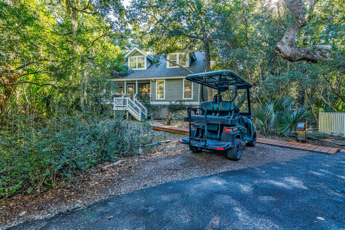 Come and enjoy the serenity in our cottage! It is nestled in the maritime forest, offering privacy and convenience to all the island amenities. The community pool is available for your enjoyment, and it's only a 2-minute golf cart ride from the beach. The master bedroom and guest bedroom are downstairs, and there is an additional private room upstairs. The kitchen was recently updated with new appliances. We have a wonderful sunroom, screened-in porch, and a wrap-around deck that are perfect for outdoor entertaining. We have two golf carts that can accommodate four passengers. A Lifestyle Temporary Membership to the BHI Club is also available. This home is pet-friendly. Please note that there is a non-refundable $300 plus tax pet charge.