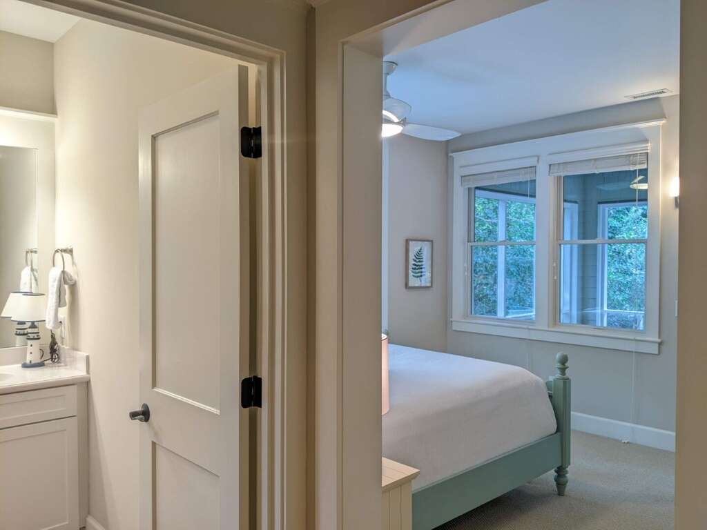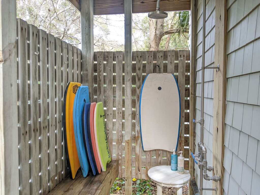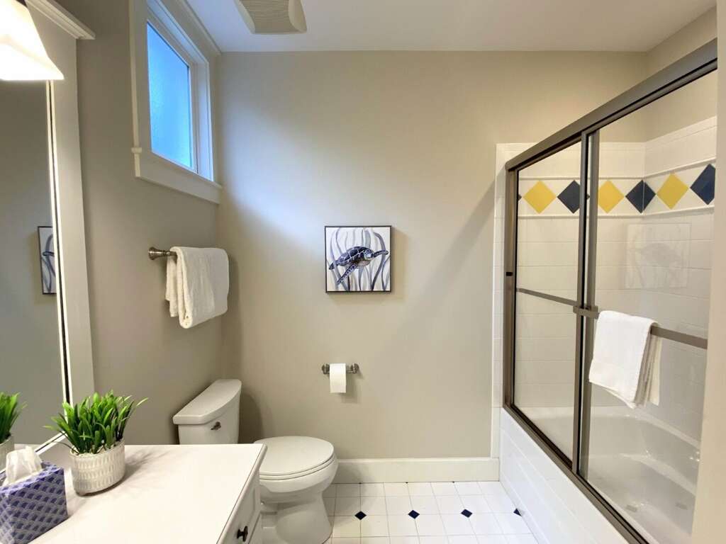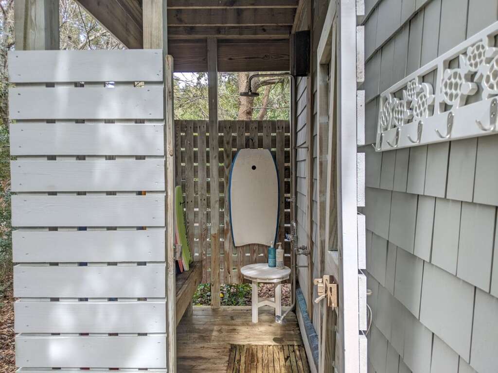 Happy Honu is a charming home with five bedrooms and 5.5 bathrooms located in Cape Fear Station. The name is a reference to the Hawaiian green turtle, which is known as a majestic connection between man, land, and sea. This reversed floor plan design features three bedrooms on the lower level: a spacious master bedroom with a private bath and king-sized bed. The second bedroom downstairs has a queen-sized bed and its own private bathroom. The third bedroom features a double bed, twin bunkbeds with a pull-out queen and an attached bathroom. The main, lower level also has a large deck for lounging and a spacious screened-in porch that is accessible from both the master bedroom and the queen bedroom. The upstairs features a large great-room, a very spacious and well-stocked kitchen, a dining room with eight seats at the table (plus five additional seats at the counter), a half bathroom and a large master bedroom with a king size bed and its private bathroom. The upper deck, off the living area, is a favorite spot for guests to relax on the outdoor couch and seating area or eat at the welcoming eight-seat table. Enjoy the covered area for family dinners and morning coffee. The private guest crofter located above the garage has a queen bed, a bath, and a small deck to relax on.
