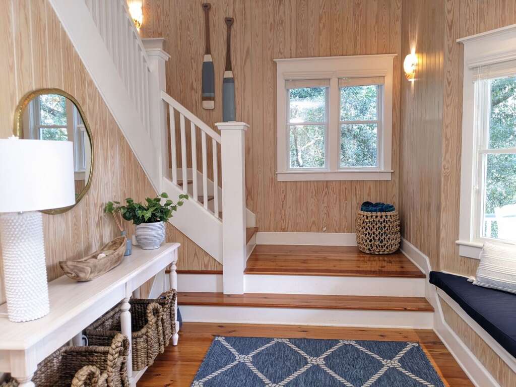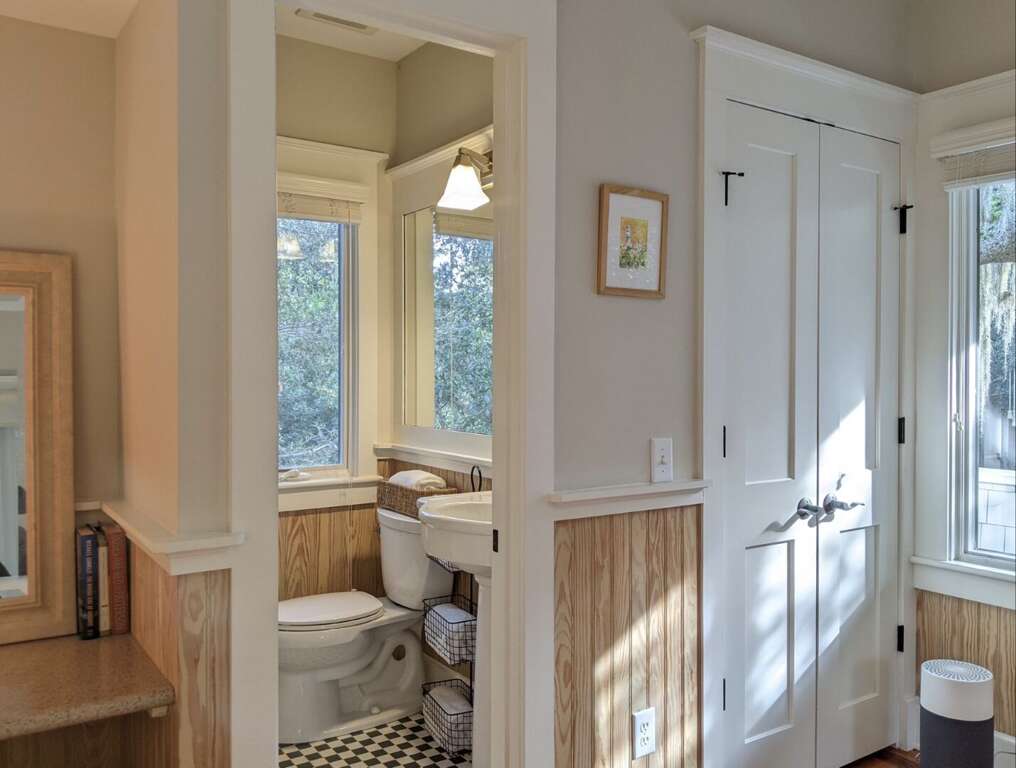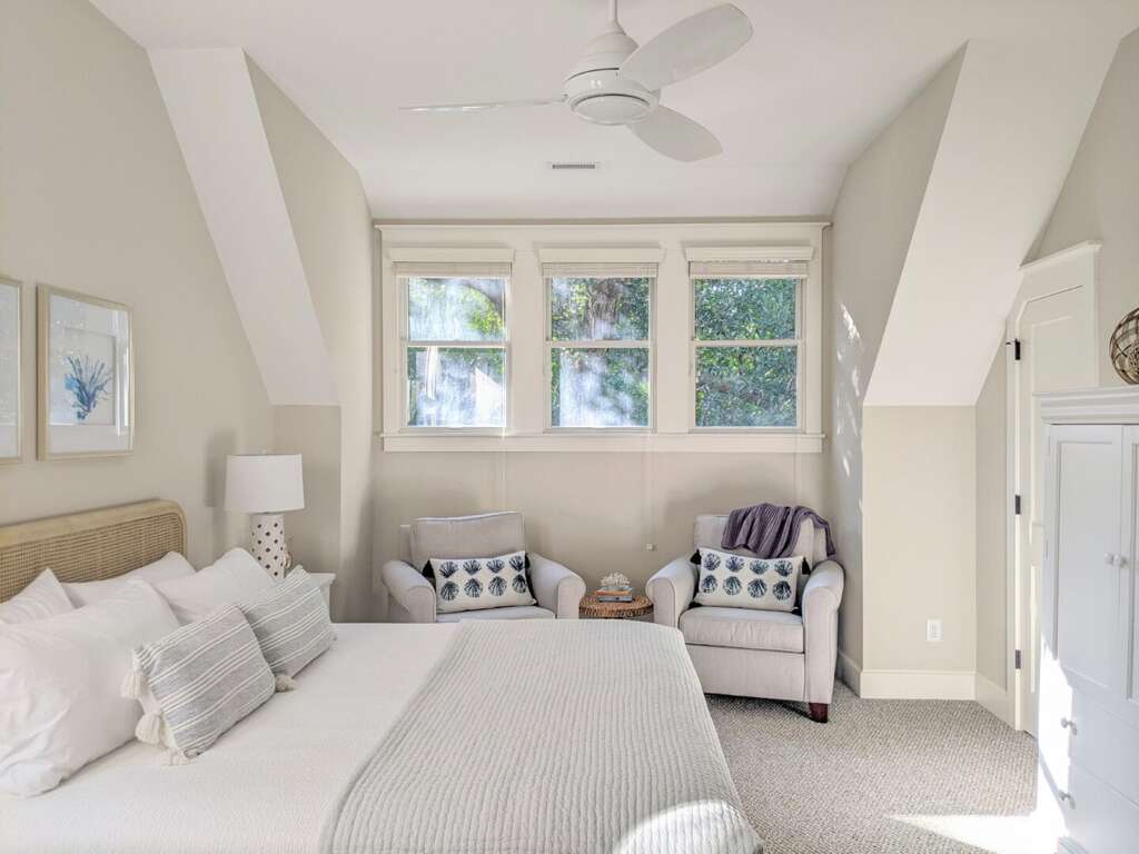 How does a luxurious 5-bedroom vacation rental on Bald Head Island sound for your next getaway? This stunning property offers a reverse floor plan design, providing breathtaking nature views from the comfort of your living space. With 5 full bathrooms and 1 half bathroom, a large lounging deck, and a screened-in porch, this rental caters to your relaxation needs. Additionally, the private guest crofter above the garage adds a unique touch to your stay, allowing for extra privacy and space for guests. Whether you're enjoying the tranquility of the outdoors or the comfort of the indoors, this vacation rental is designed to enhance your experience on Bald Head Island.