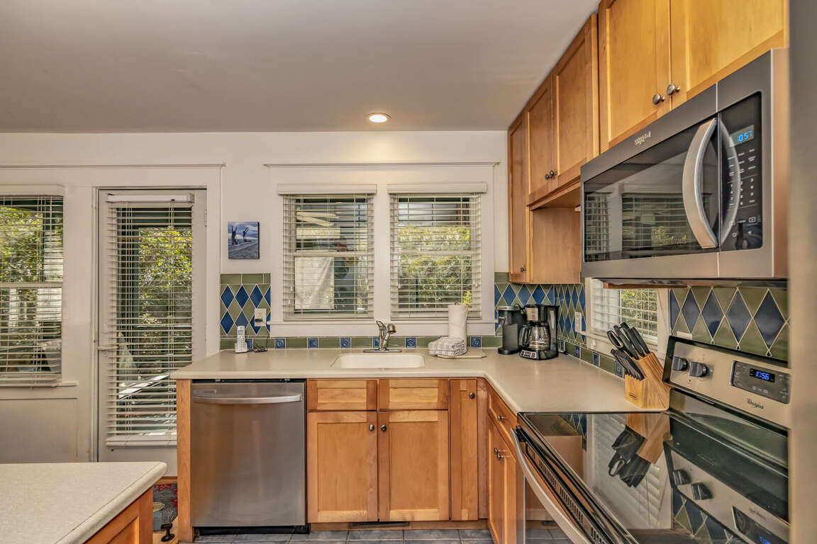 A welcoming kitchen with stainless-steel appliances is connected to a comfortable dining area that seats 6 people (including a built-in window seat).