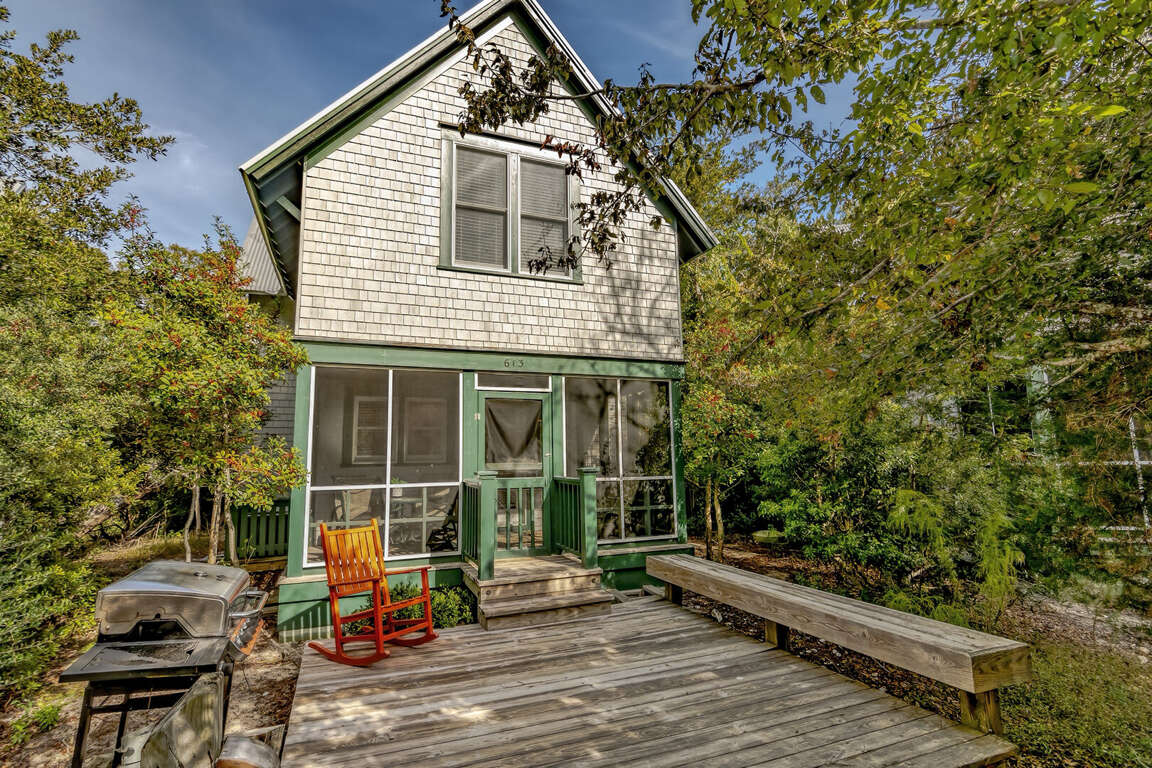 The tranquil surroundings of the Maritime Forest in Bald Head Island provide an idyllic backdrop for the impressive features of the 3-bedroom vacation home on 613 Kinnakeet Way.