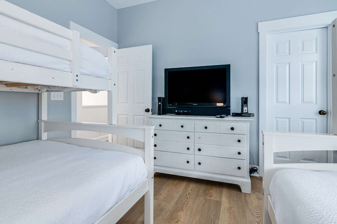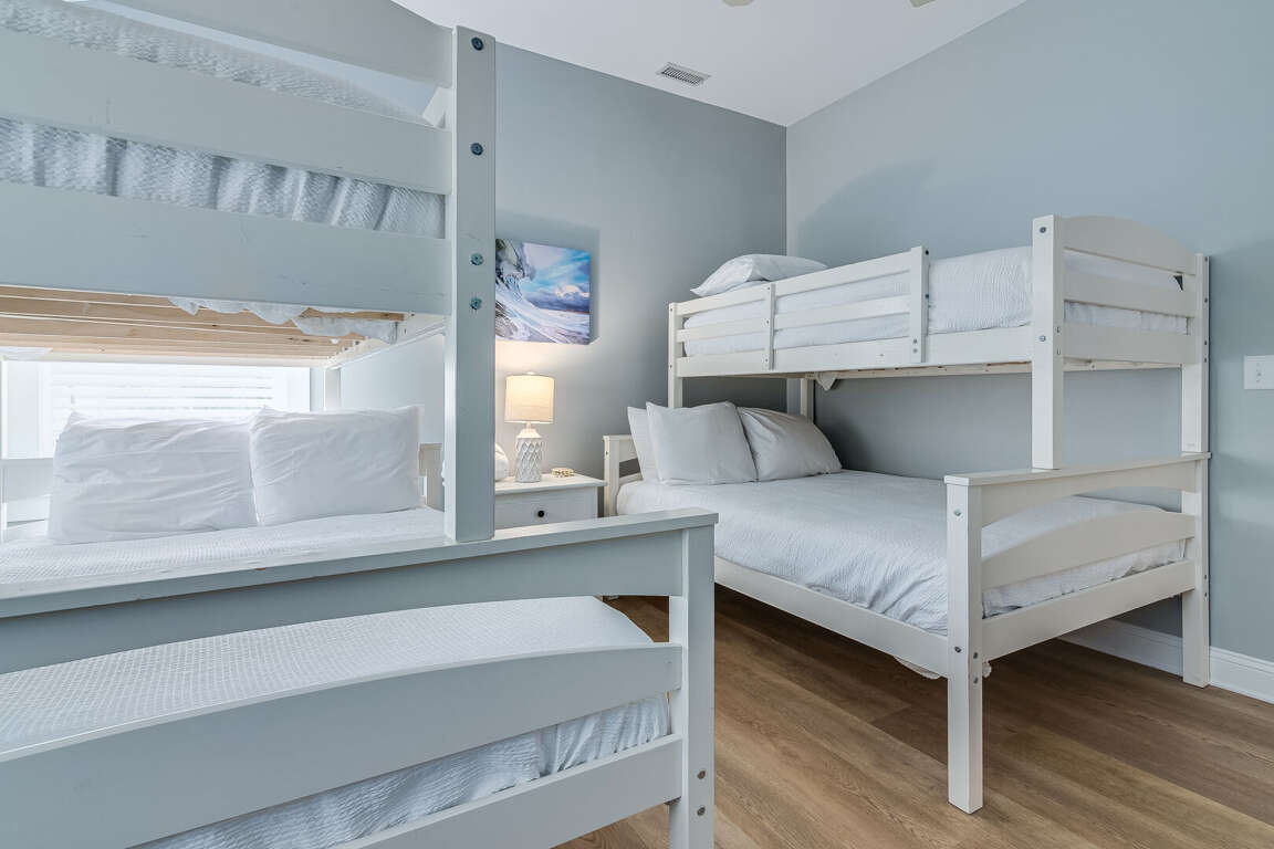 A private community gazebo and wildlife overlook provide the perfect setting for an evening of grilling. This unit includes two golf carts with four seats for travel. Beach chairs, skimboards, and boogie boards will make your stay at the beach complete. Two master suites upstairs have full private bathrooms. One has a king-sized bed, and the other has 2 twin/full bunks. Every bedroom and the family room have their own TVs for your entertainment.