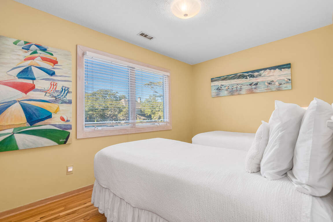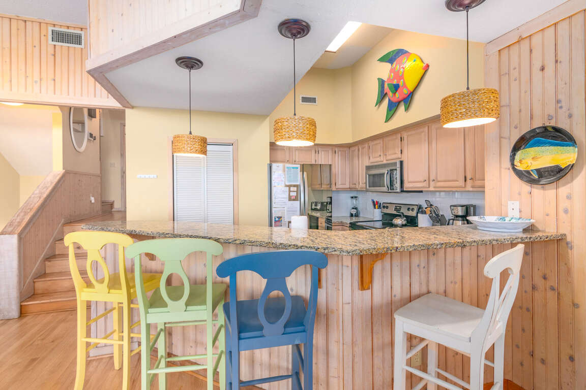 This is a great place to stay. I loved having coffee on the deck while enjoying the marsh view. The view was truly gorgeous and it has two good carts to get you to the beach. Also three kayaks! Upstairs bathroom was very pretty with nice tile work. Some slight issues: no trash cans in the upstairs bedroom bathroom combo. Also furniture not arranged well in upstairs bedrooms. Dresser at foot of bed made it hard to get to the closet. Would suggest putting dresser in closet or against different wall. Then mount the tv on the wall to save space. Also no light in the pantry made it hard to find things. But would definitely stay here again!!