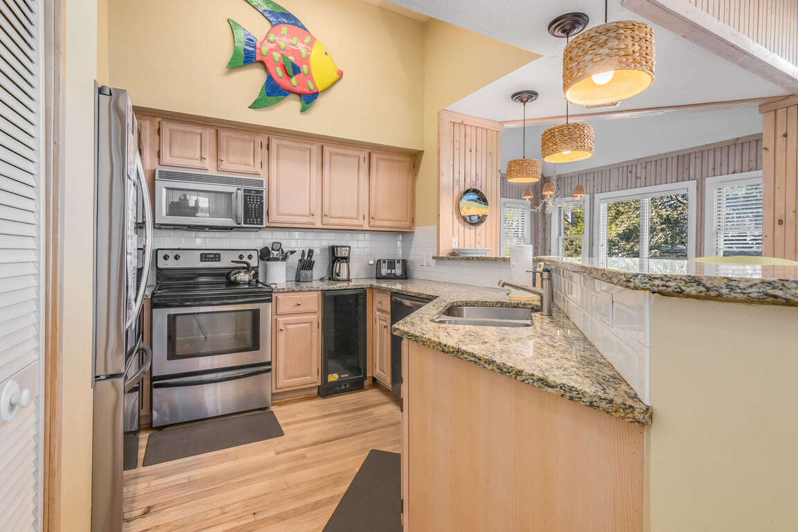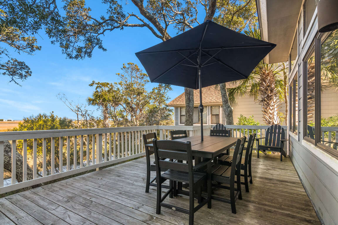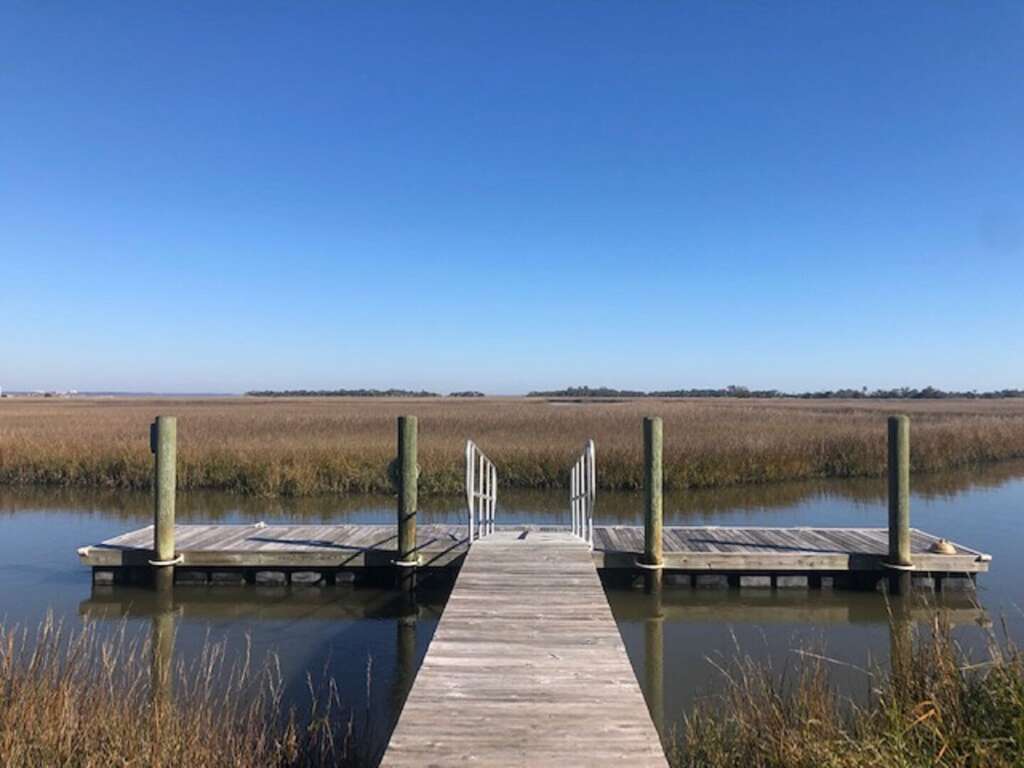 The living room and deck offer a stunning view of the marsh, wildlife, and acres of marshland. Views of Bald Head creek all the way up to Cape Fear River. The private neighborhood dock is connected to the house by a boardwalk. From there, you can kayak, canoe, fish, and crab with your kids. The kitchen is updated with stainless steel appliances and granite counter tops. New deck (2016) with wrought-iron table, 6 chairs, and umbrella facing the marsh. In 2018, new hardwood flooring was installed throughout the house.