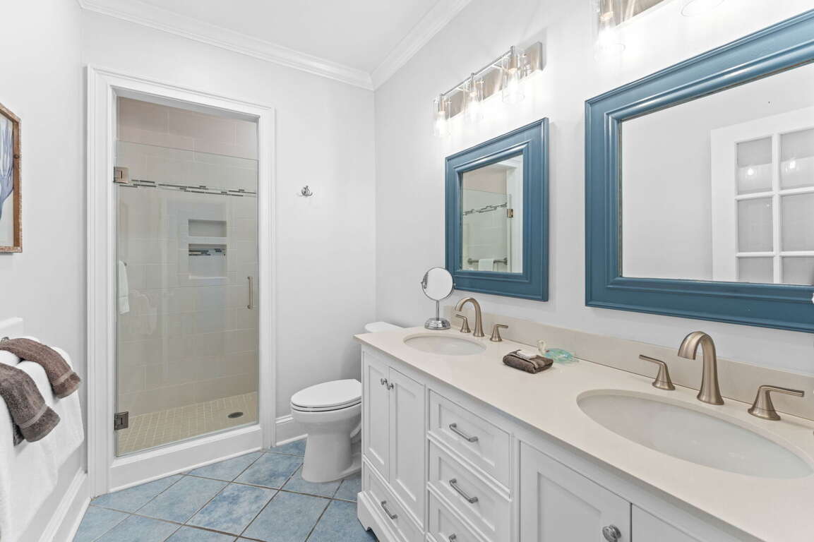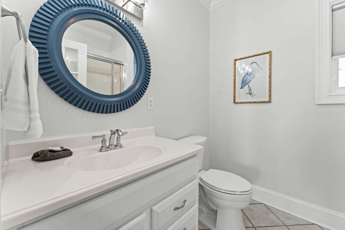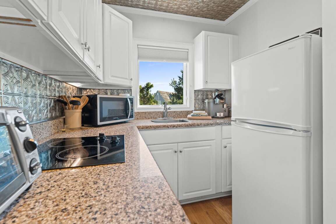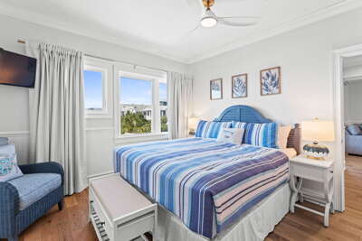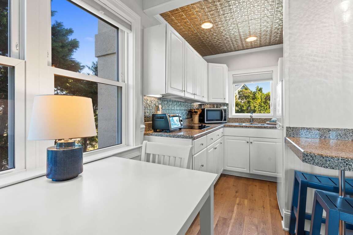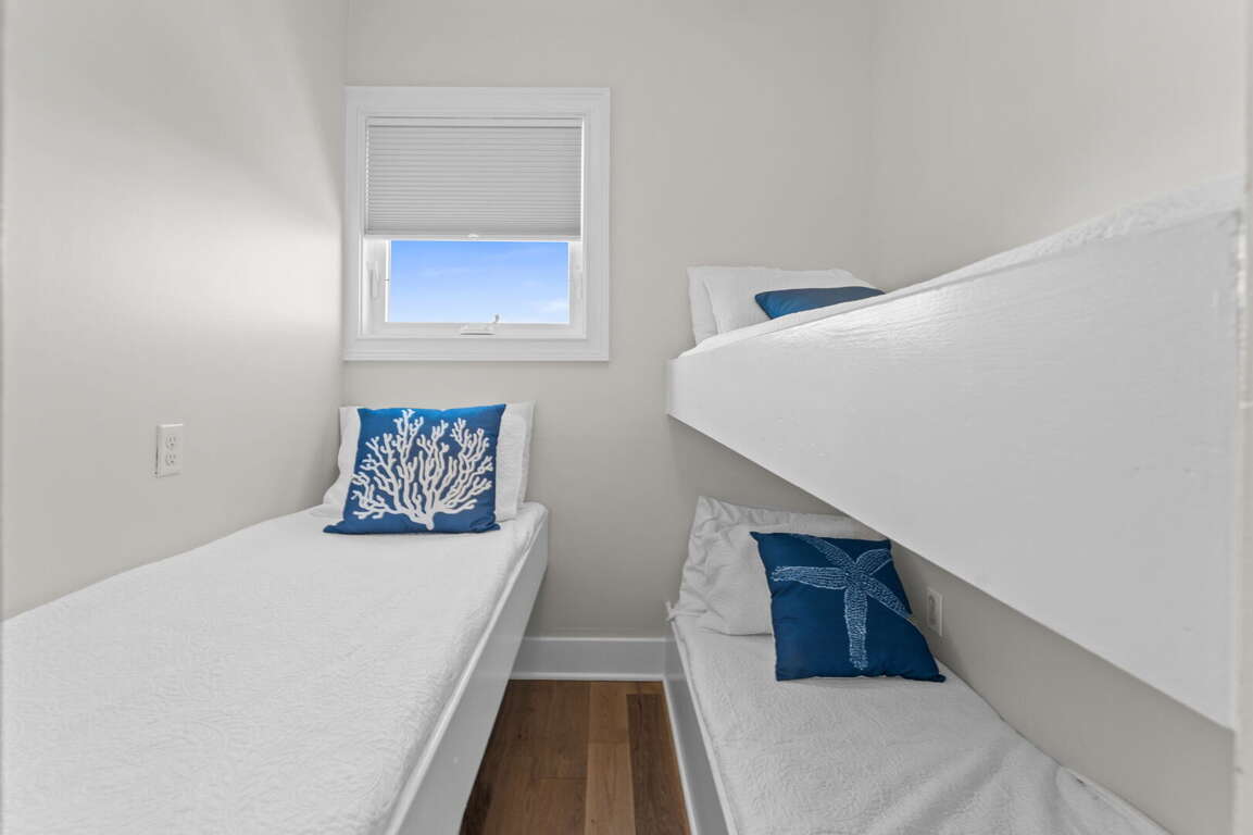 This 2nd floor suite offers stunning views of the harbor, marshes and ocean. Enjoy the private furnished porch off the living room with incredible views of Harbor Marina, Cape Fear River and Ocean beyond. The living room features a comfortable loveseat and sofa combo. Enjoy the wall-mounted smart flat screen television with cable and complimentary high-speed wi-fi to stream and browse. The queen-size sleeper sofa provides additional sleeping comfort, and a full bathroom is just steps away. The granite kitchen includes a full-size fridge, microwave and stovetop. The cabinets are fully stocked for quick and easy meals or culinary adventures. You can tidy up while enjoying the Marsh. If you are an early riser, you will love the sunrise through the rear kitchen window. The Bunk Room, with its three bunk beds, is suitable for all ages. The King Master Bedroom offers a stunning view of the Harbor, Cape Fear River and Oak Island Lighthouse. Step out onto the covered porch and enjoy the Harbor Marina up close. The Master Bathroom features a double vanity and a spacious tile shower. What else can you ask for? Restaurants, bars and West Beach, as well as Old Baldy are all within a short stroll. A 4-person golf car is included in your stay for island adventures.