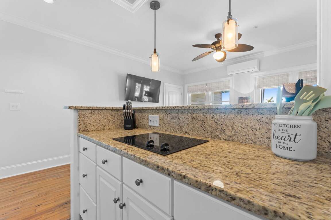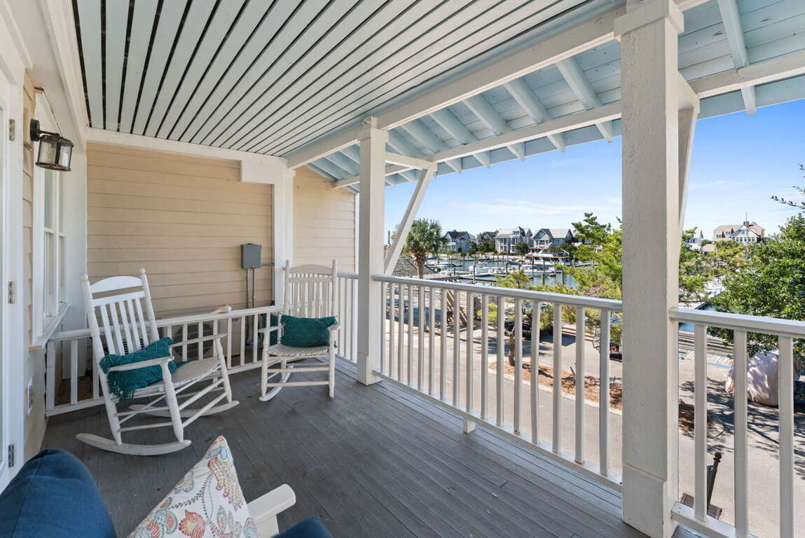 The second-floor Cape Fear suite is one of The Marsh Harbour's "crown jewels". The Living Room/Dining Room features a fully-stocked kitchen with granite counters, a full-size fridge, microwave, stovetop, toaster, Keurig and drip coffee makers, a large stainless-steel basin, dimmable pendant lights, and more. You're now on Island Time! Find the blender under the counter, and whip up your favorite frozen concoctions. This suite is stunningly decorated with custom furniture, a large Smart TV mounted on the wall with cable and DVD player. You can browse and stream at high speed with the included internet. The sectional sofa is equipped with a twin pullout, ensuring comfort for a sleeper who has been on an adventure. The master bedroom has a king bed, plenty of space for your vacation clothes and a full bathroom. No detail was overlooked. The Cape Fear Suite's private 30-foot covered porch, with dining and rocking chair overlooking the marina, is a delightful feature. The French doors in the bedroom and living room provide a great place to enjoy the sunsets on Bald Head Island or to simply rock and watch the activity along the Harbor, River and Ocean Beyond. This suite offers stunning views from every angle. Restaurants, bars and West Beach are all within a short stroll. Island Adventures offers a 4-person golf cart at no extra cost.