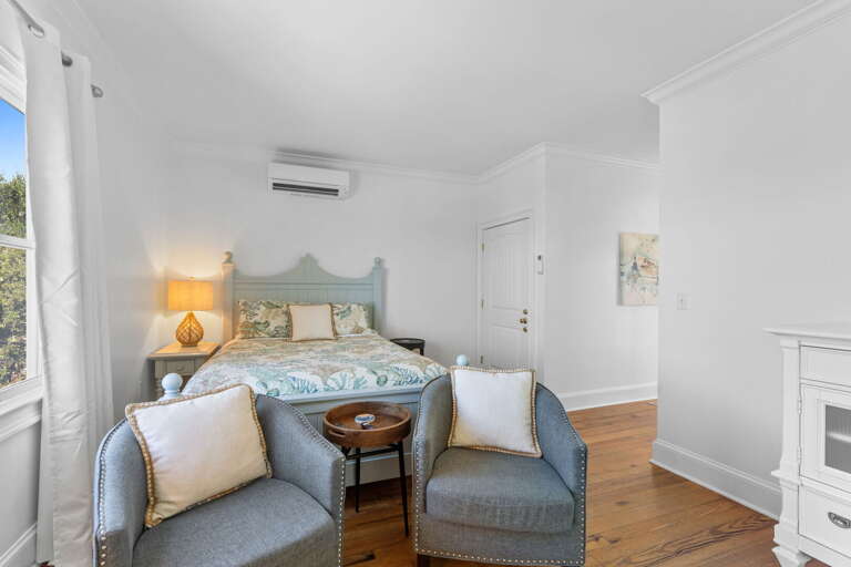 Perched on the second floor, the Ocean Vista Condo at Marsh Harbour Inn offers a private corner suite with breathtaking views of the surrounding scenery on Bald Head Island, North Carolina. The room decor exudes coastal charm, with nautical accents and soothing hues that create a tranquil ambiance. Step out onto the balcony for a front-row seat to spectacular sunset viewing, where hues of pink, orange, and gold paint the sky over the ocean. This cozy retreat is the perfect place to unwind and bask in the beauty of nature. Whether sipping a morning coffee or enjoying an evening cocktail, the balcony provides a serene space to connect with the island's natural splendor.
