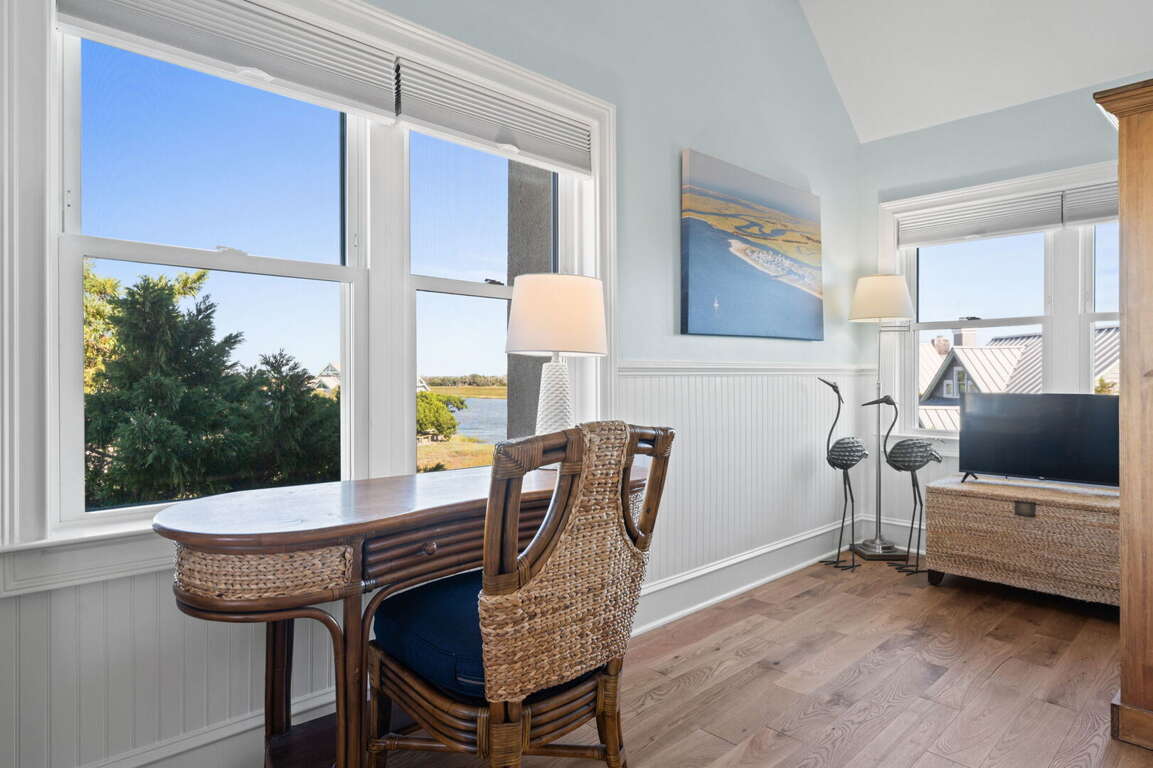 This beautiful suite on the third floor with vaulted-ceilings offers some of the best views in the Island. The living room has large windows that showcase the harbor, Cape Fear River and marsh. You'll be on Island time in no-time with the coastal cottage design! With a private Master Suite/Master Bath with views of the Harbour, and the Marshes, you'll have plenty space to spread out. A spacious deck with modern furnishings is located just off the living room. Enjoy the 180% views from this deck. A charming 2-person bunkbed room is located to the left of the living room, along with another full bathroom. The kitchen and living areas have recently been remodeled with great updates. A Queen Sleeper Sofa provides additional sleeping space for those who are tired of adventure. Enjoy the new counter-height dining set with bar seating for two, a full refrigerator and built-in microwave, as well as a stovetop, sink and cabinets stocked for your cooking pleasure. A new bar cart provides extra storage, and Keurig coffee is available. This suite features hardwood floors, beadboard, fine linens and ceiling fans. Enjoy the 50" wall mounted TV with cable and high-speed wi-fi at no extra cost. This suite is a special one and you will enjoy returning to it after a fun-filled day on the island. Restaurants, bars, Old Baldy, and West Beach can be reached by a pleasant walk. A 4-person golf car is included in your stay.