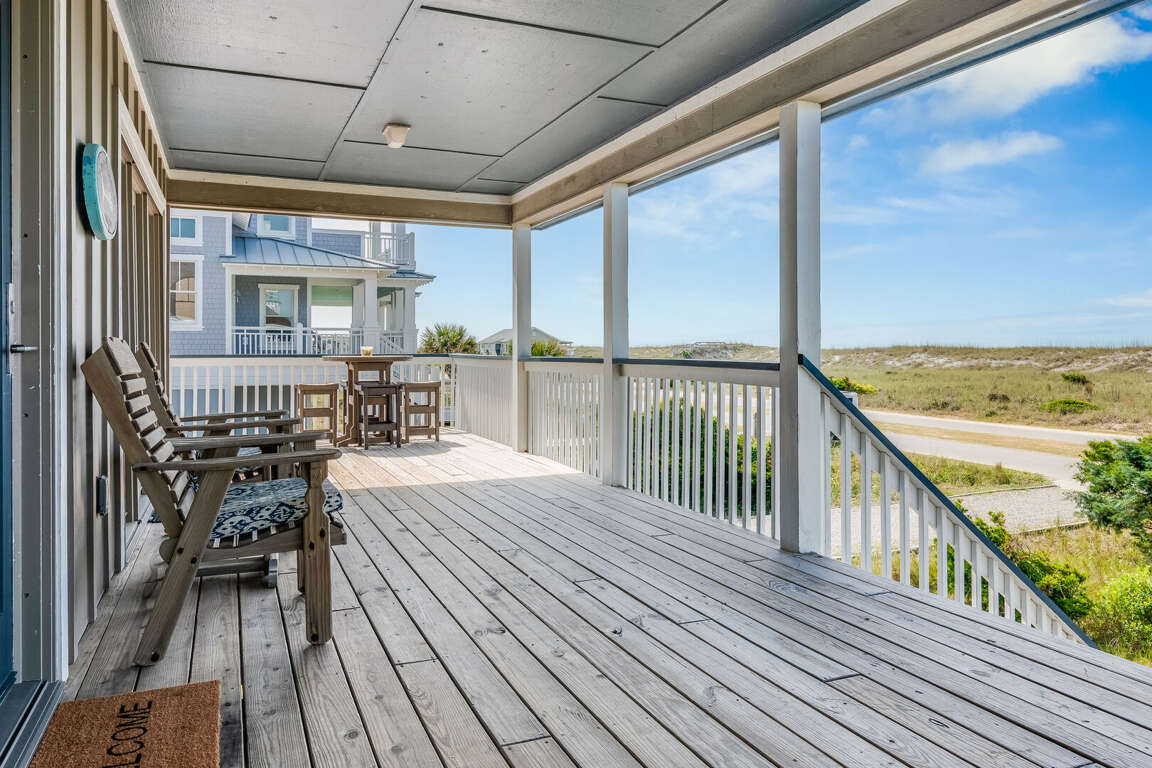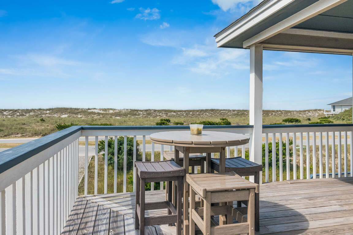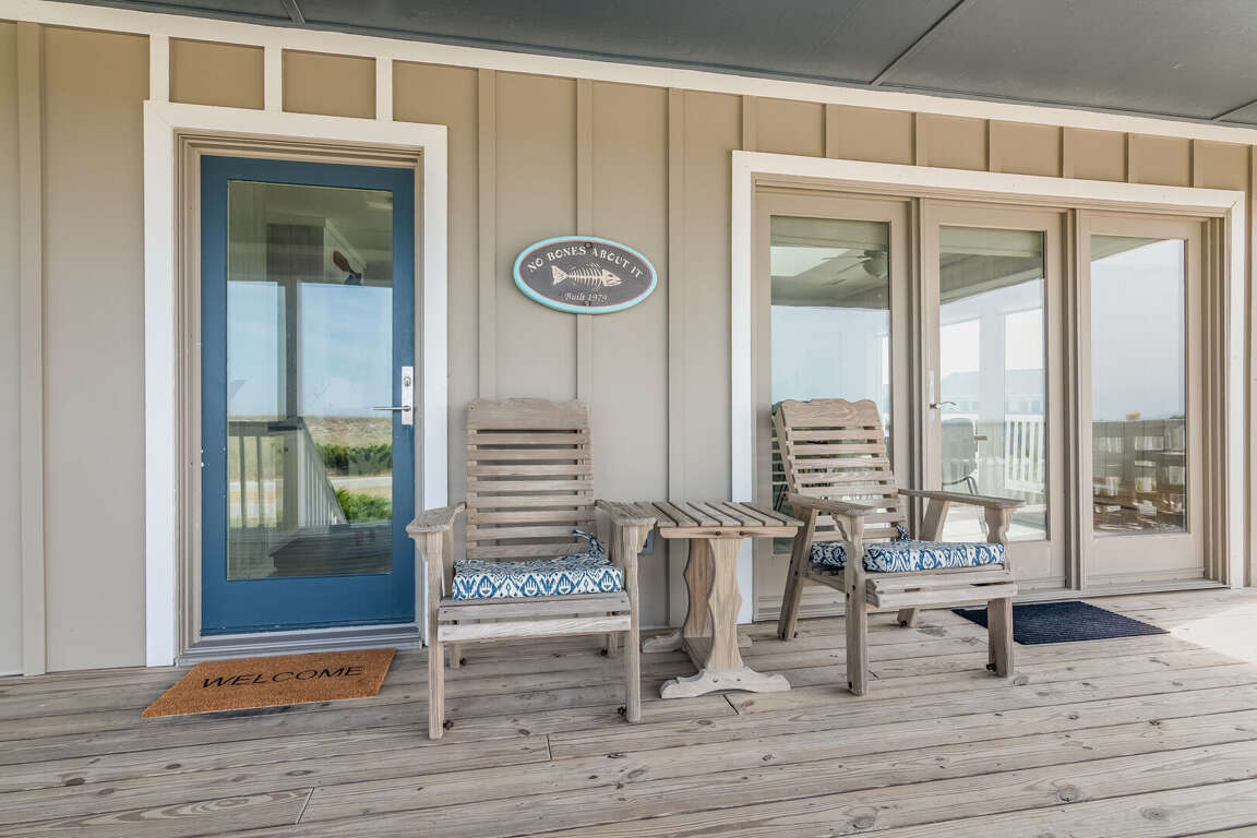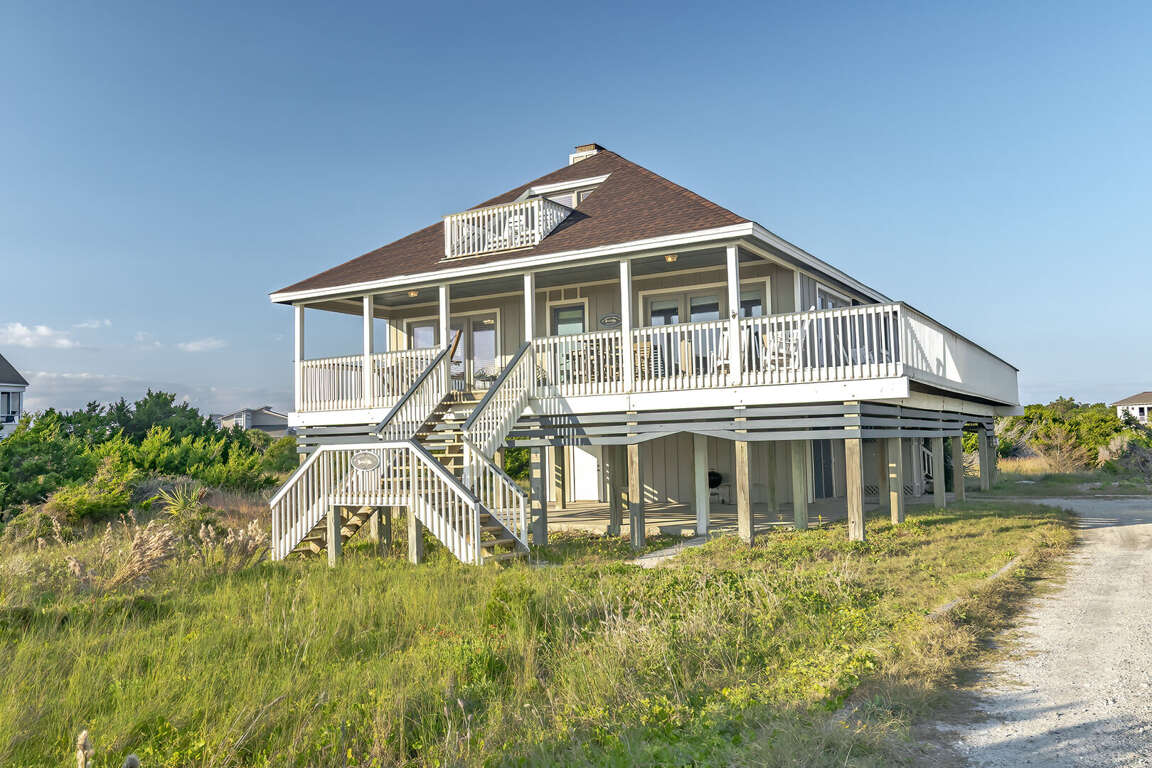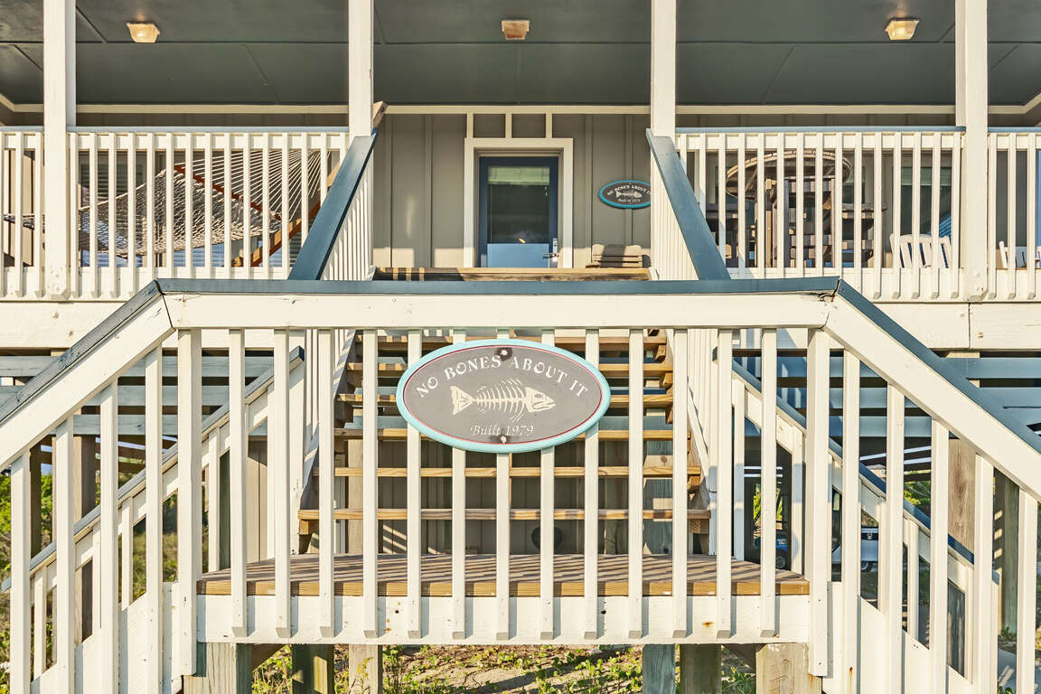 No Bones About It has one of best locations on the Island! The panoramic view, which is unobstructed, is simply breathtaking! Relax on our spacious porch and enjoy the sunset over the Atlantic Ocean. The first floor has a traditional layout with the living, dining, and kitchen areas. The kitchen is fully stocked, and the open space is perfect for family gatherings. The first floor has three bedrooms and three bathrooms. The first bedroom is equipped with a king-size bed, while the other two rooms have queen-size beds. In the last year, we have made many upgrades. We have a bedroom upstairs with a queen bed, two twin beds and a bathroom. This is the room that the kids love! Our home comes with wifi, beach equipment and two golf carts. Come and enjoy our little slice of paradise on Baldhead Island!
