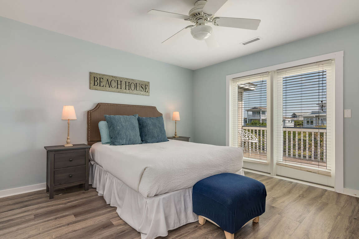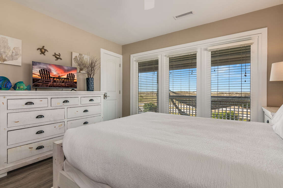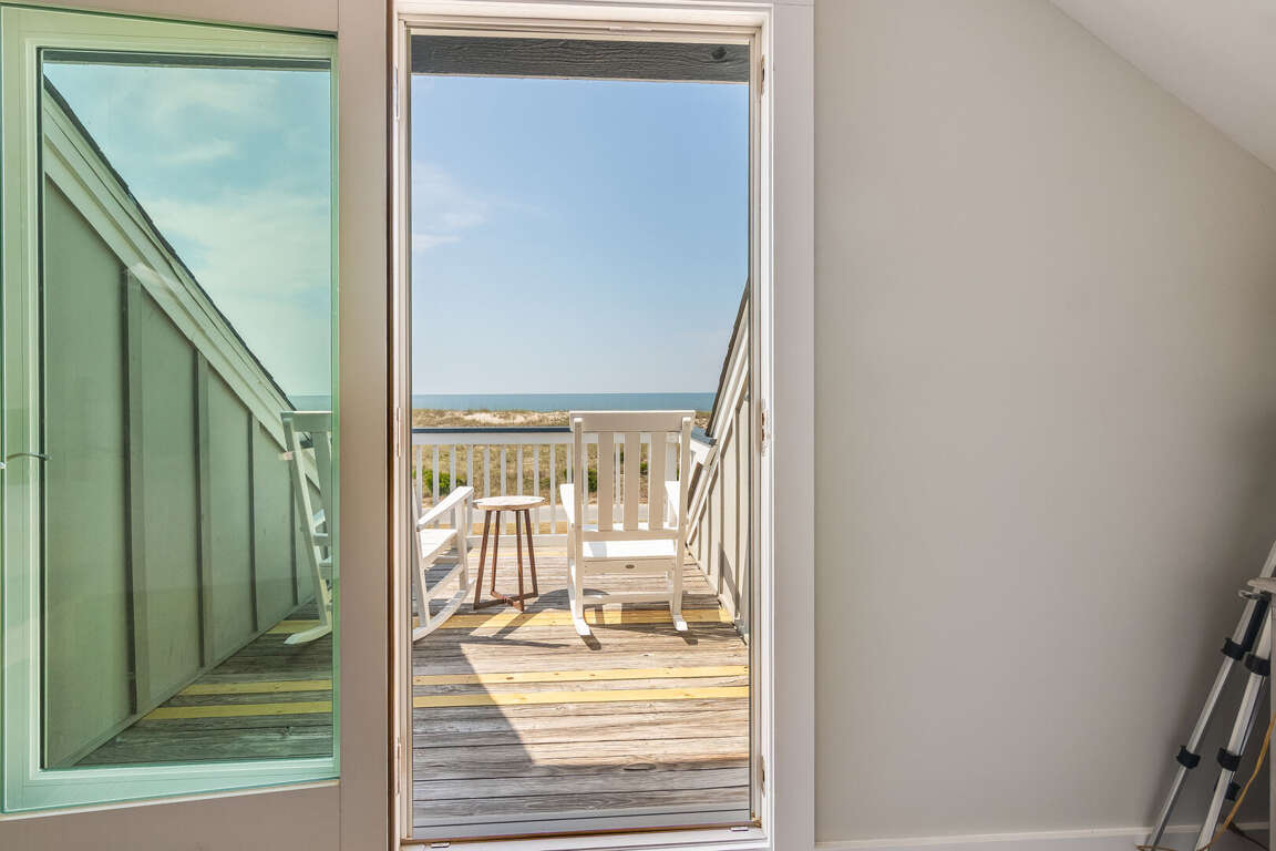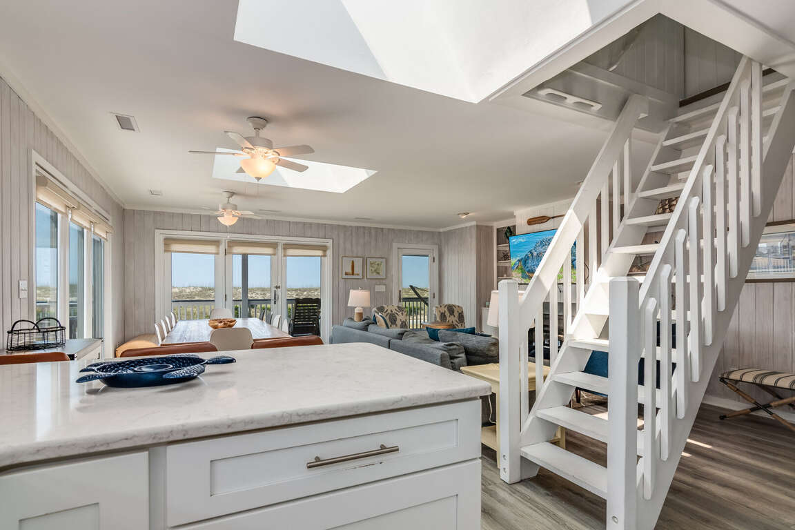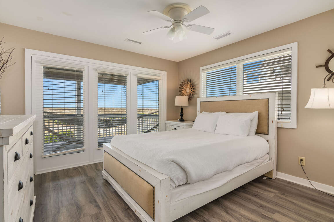 No Bones About It has one of best locations on the Island! The panoramic view, which is unobstructed, is simply breathtaking! Relax on our spacious porch and enjoy the sunset over the Atlantic Ocean. The first floor has a traditional layout with the living, dining, and kitchen areas. The kitchen is fully stocked, and the open space is perfect for family gatherings. The first floor has three bedrooms and three bathrooms. The first bedroom is equipped with a king-size bed, while the other two rooms have queen-size beds. In the last year, we have made many upgrades. We have a bedroom upstairs with a queen bed, two twin beds and a bathroom. This is the room that the kids love! Our home comes with wifi, beach equipment and two golf carts. Come and enjoy our little slice of paradise on Baldhead Island!