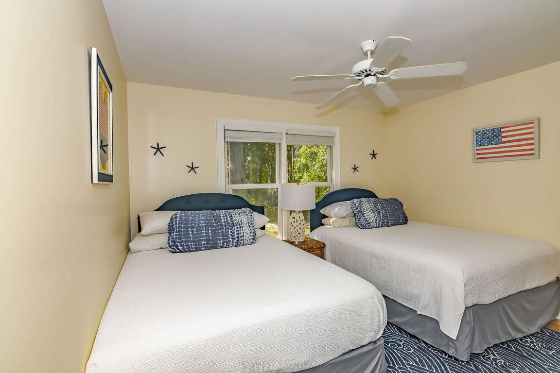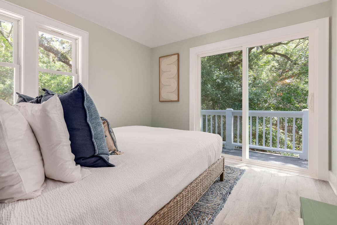 The well-appointed 3-bedroom vacation rental on Bald Head Island offers comfortable and inviting bedroom accommodations for guests seeking a relaxing and convenient retreat. The bedrooms are tastefully decorated, providing a cozy and serene atmosphere for a restful night's sleep. The sleeping arrangements cater to various preferences, ensuring everyone in the group can find their perfect spot to unwind. The property features a master king bedroom upstairs with a private balcony, a first bedroom downstairs with a queen-sized bed, and a second bedroom downstairs with two queen-sized beds. Additionally, there is a cute sleeping area with 2 twin beds in the master bathroom, providing a unique and charming space for a peaceful night's rest. With such thoughtfully designed bedroom decor and versatile sleeping arrangements, guests can truly experience freedom and relaxation during their stay.