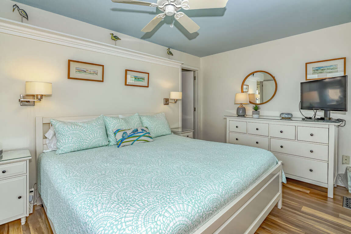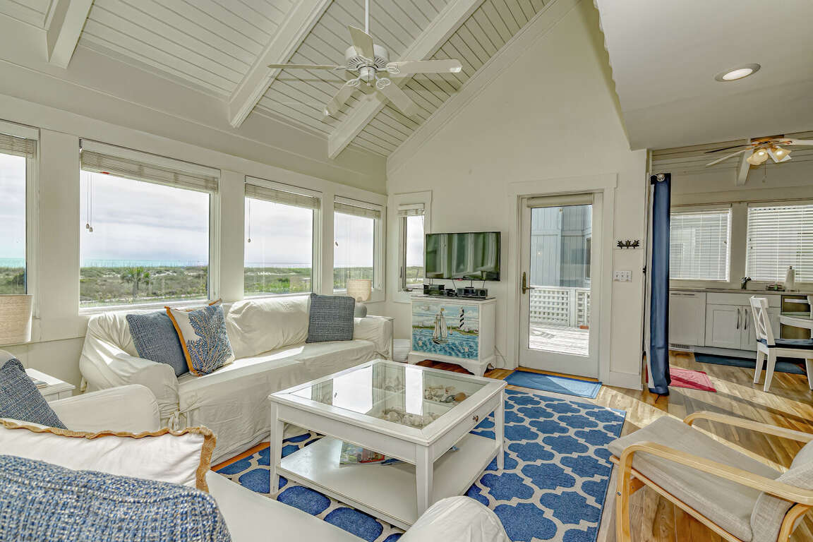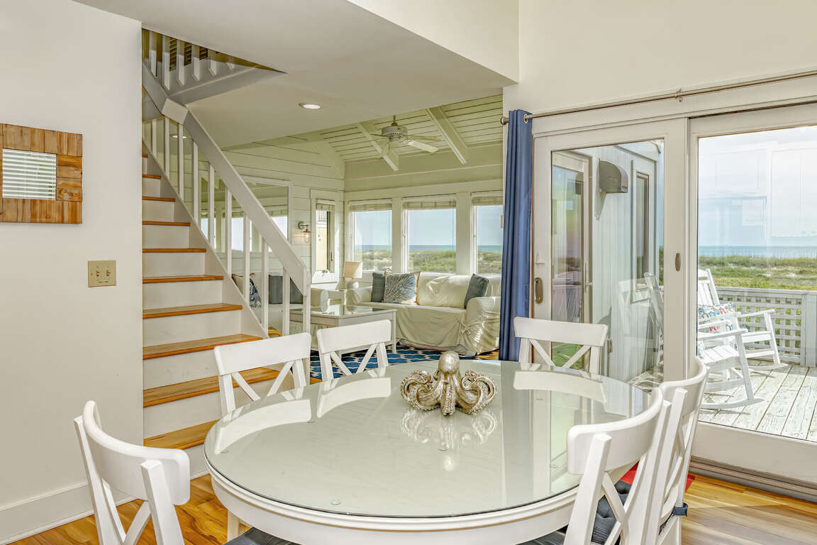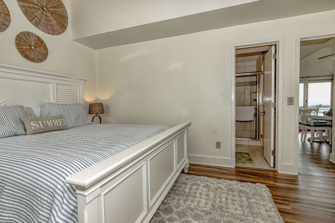 The living room, dining area and kitchen are all located on the first level. They overlook the beautiful Bald head beach. The kitchen has been completely remodeled and is fully stocked to meet all your cooking needs! The main floor also has the king master bedroom and the second bedroom. The 2nd bedroom features a king-sized bed and a shower.
