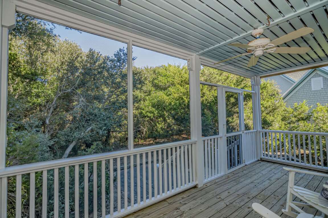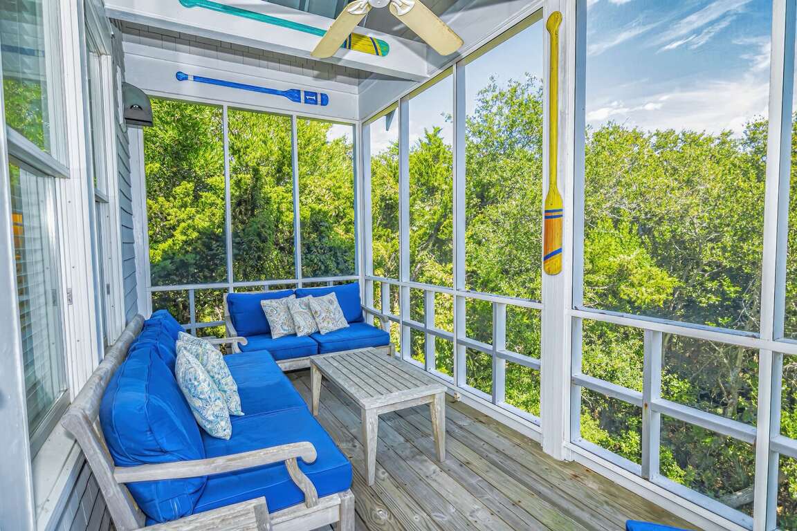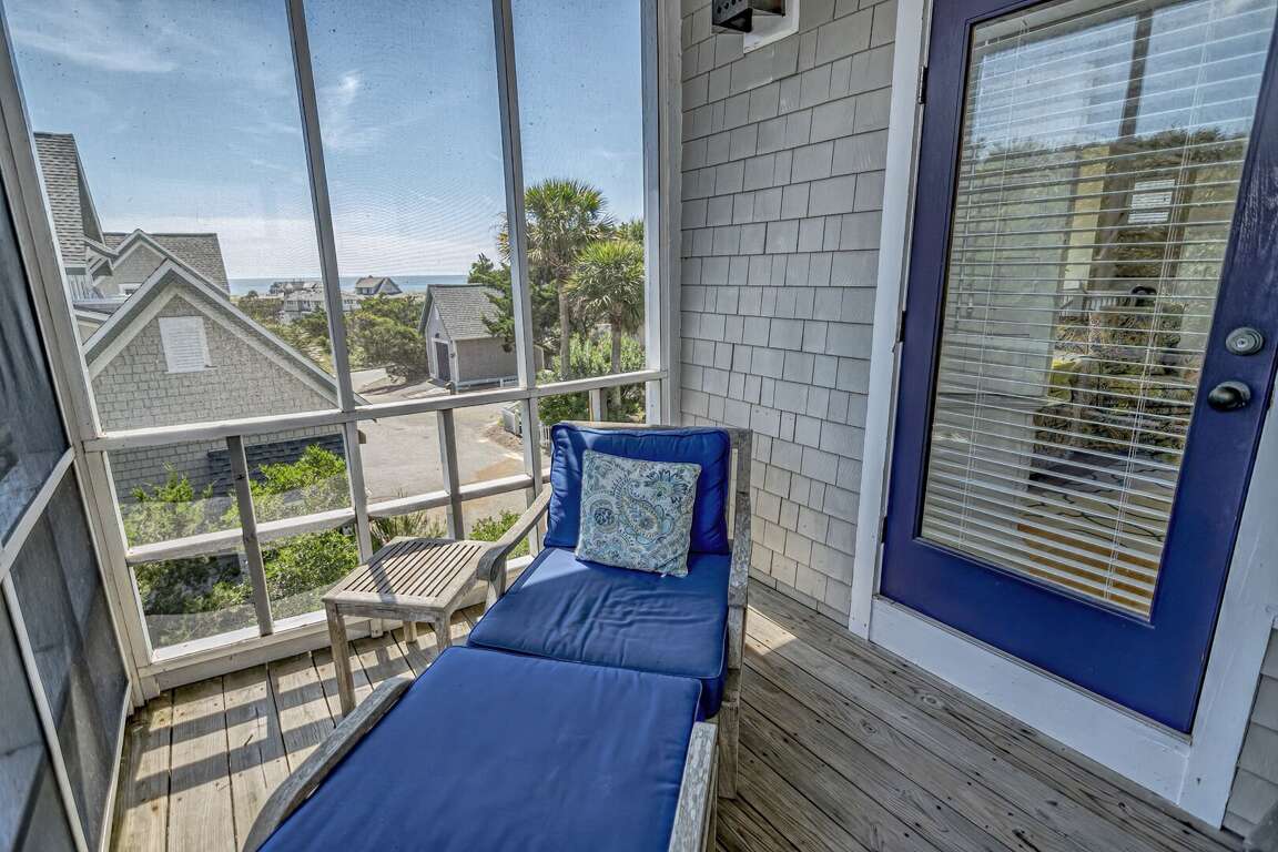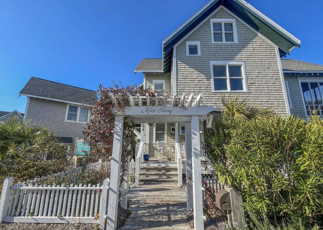 "Miles Away", located on the dunes at Bramble Reach, overlooks the Atlantic Ocean. This reverse floorplan home has 3 bedrooms with 3.5 bathrooms. The downstairs king master bedroom has a private screen-enclosed porch. The second bedroom has 2 twins with 2 trundles and a private bathroom. The main living area is upstairs, along with the dining area, kitchen, bar area, and half-bath. The living room has both an open porch and a screened-in porch. The private third-floor has a double bedroom and a bathroom.