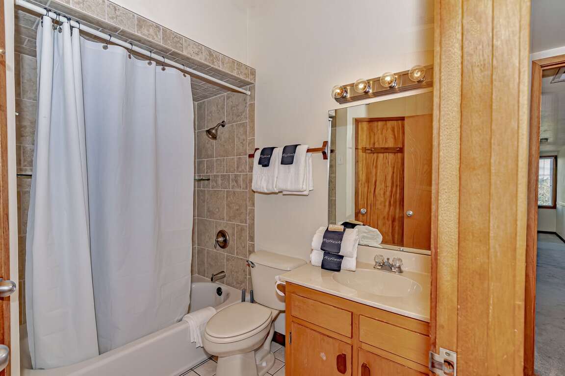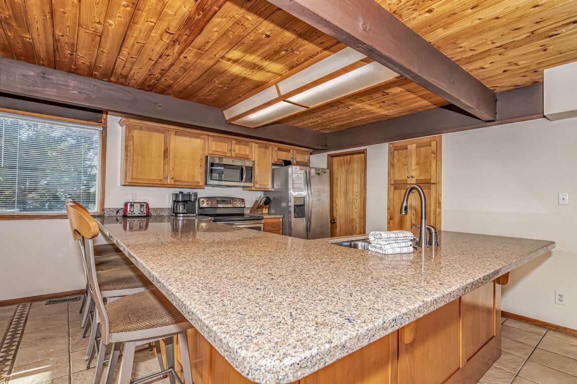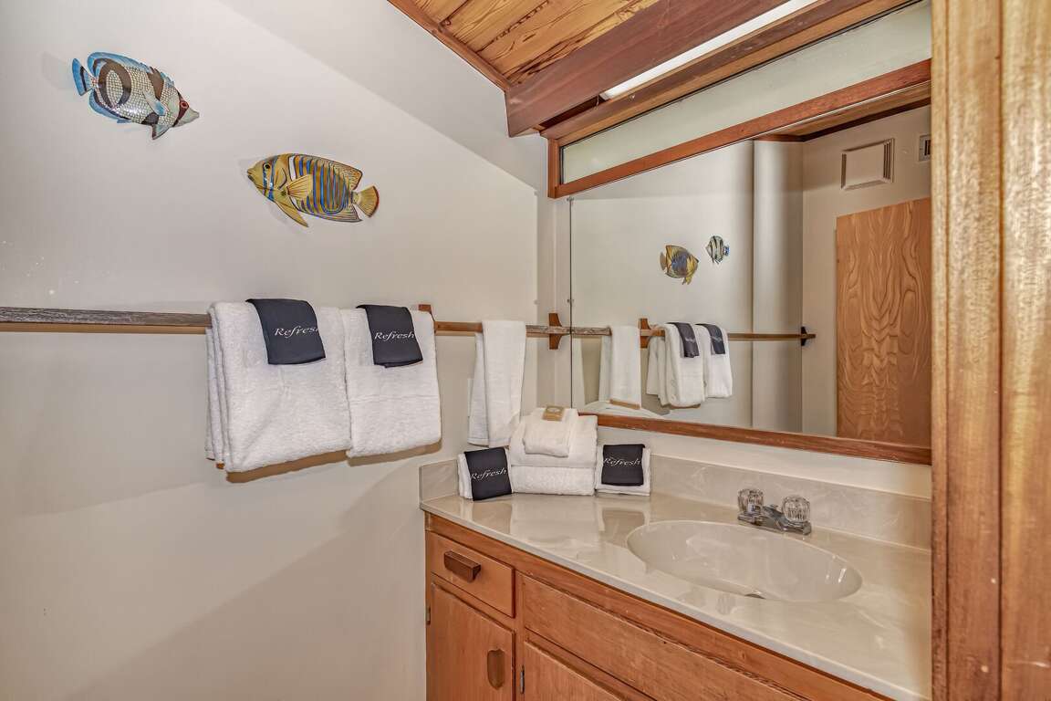 The spacious renovated kitchen with new stainless steel appliances and comfortable living space are perfect for large family gatherings. To see how large a group can fit in, check out the bed configurations. The bathrooms are the most distinctive feature. Each bedroom has a half-bathroom. There are two full baths and two showers. Although it might seem strange at first, renters love how well it works.