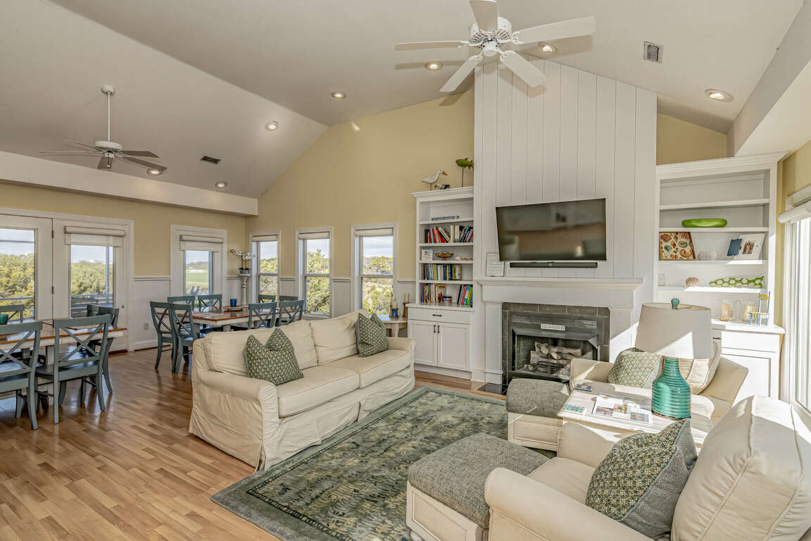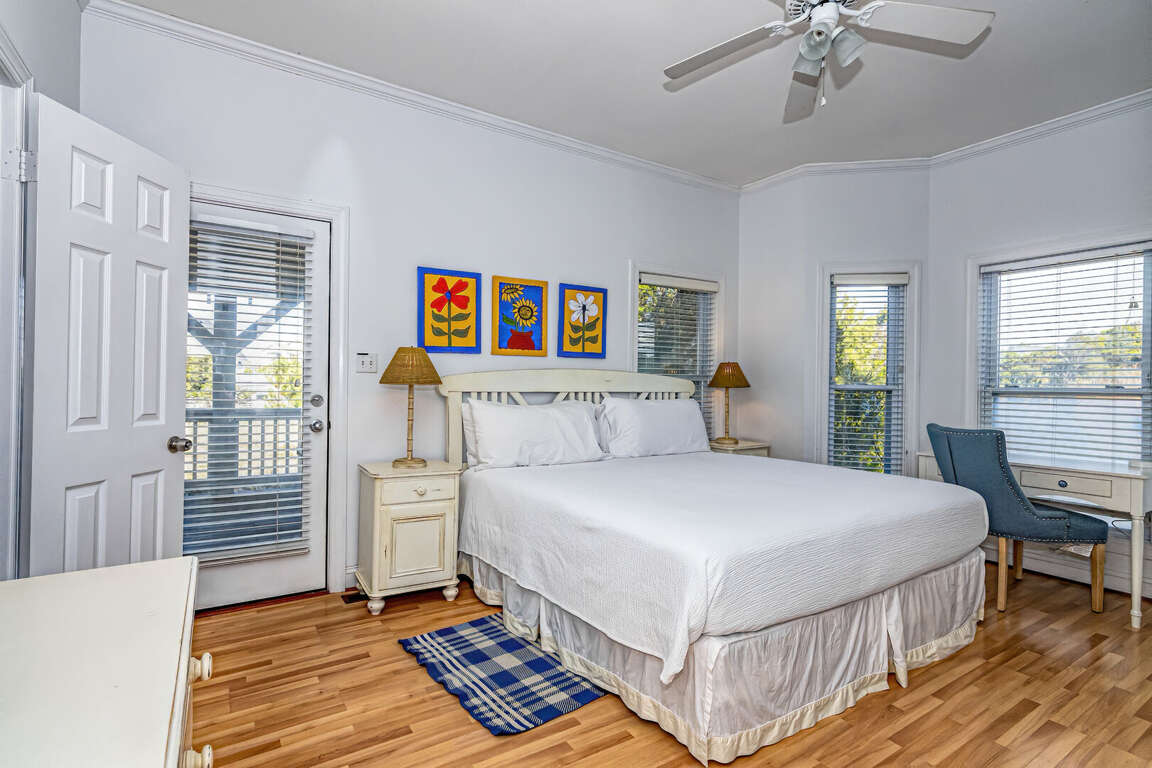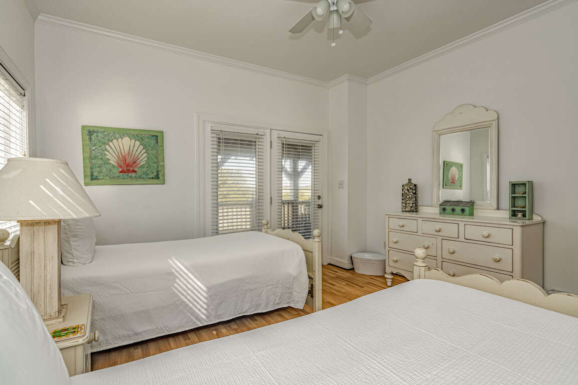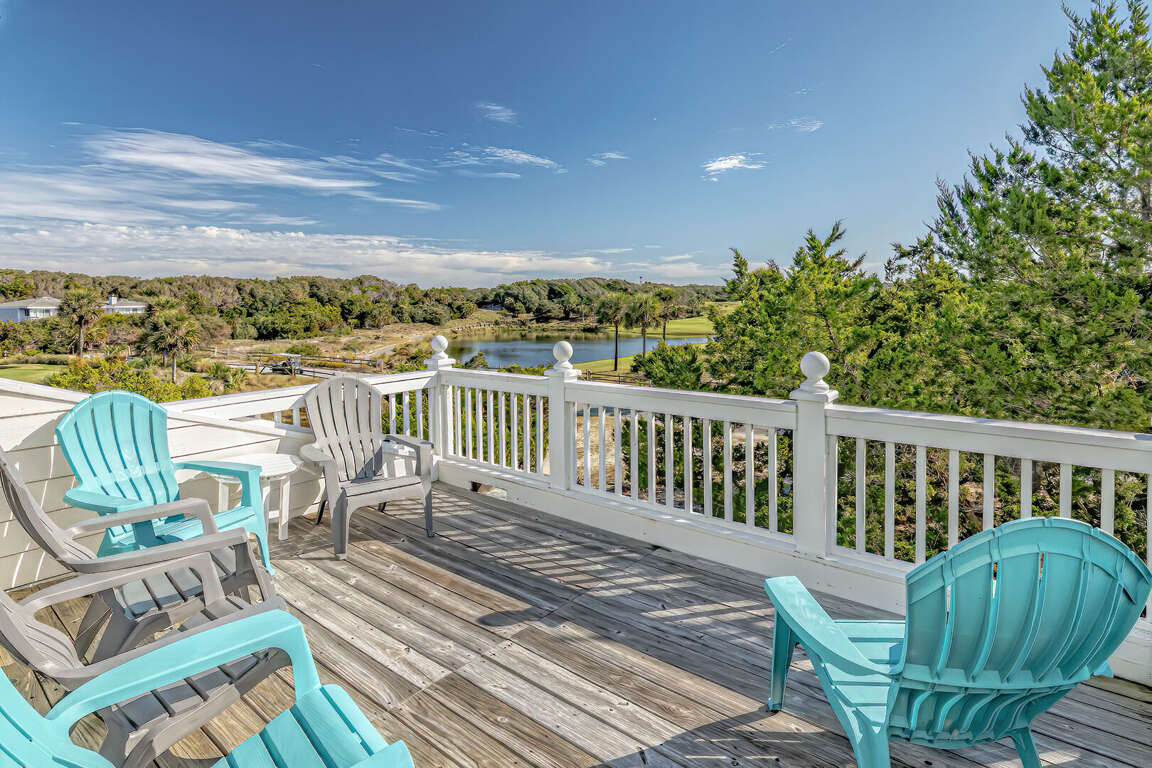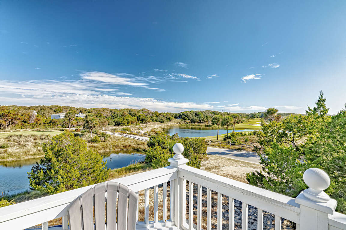 Flip Flops has a stunning view of the ocean and the signature par-3 hole of the golf club. It is the perfect place to start exploring the island with family and friends. The whimsical paintings and decor of the cottage, as well as its restful porches, will make your stay memorable. It is one of the larger homes on the island and has a unique feature, the crofter above the garage. This is the perfect hideaway for grandparents or in-laws, or anyone who wants to be alone. It has a small kitchenette with a microwave, coffee maker, sink and refrigerator. There is also a king-sized bed and a full bath. The decks and porches on the front and rear offer views in every direction. The kitchen has been expanded in recent years and is spacious. The dining table has 12 seats. There are also a dozen additional chairs on the porch just outside the front door. The covered rear porch downstairs has a swing, and half a dozen rockers. On the front porch, a group of chairs overlooks the 16th hole green. It's a great place to enjoy an afternoon cocktail. The ground floor porch features a swing, a love seat, and Adirondack chairs for a getaway haven. The downstairs master bedroom features a king-sized bed, an adjoining bathroom and access to the deck. The twin bedroom is also connected to the deck, and shares a hall bath with another twin room.