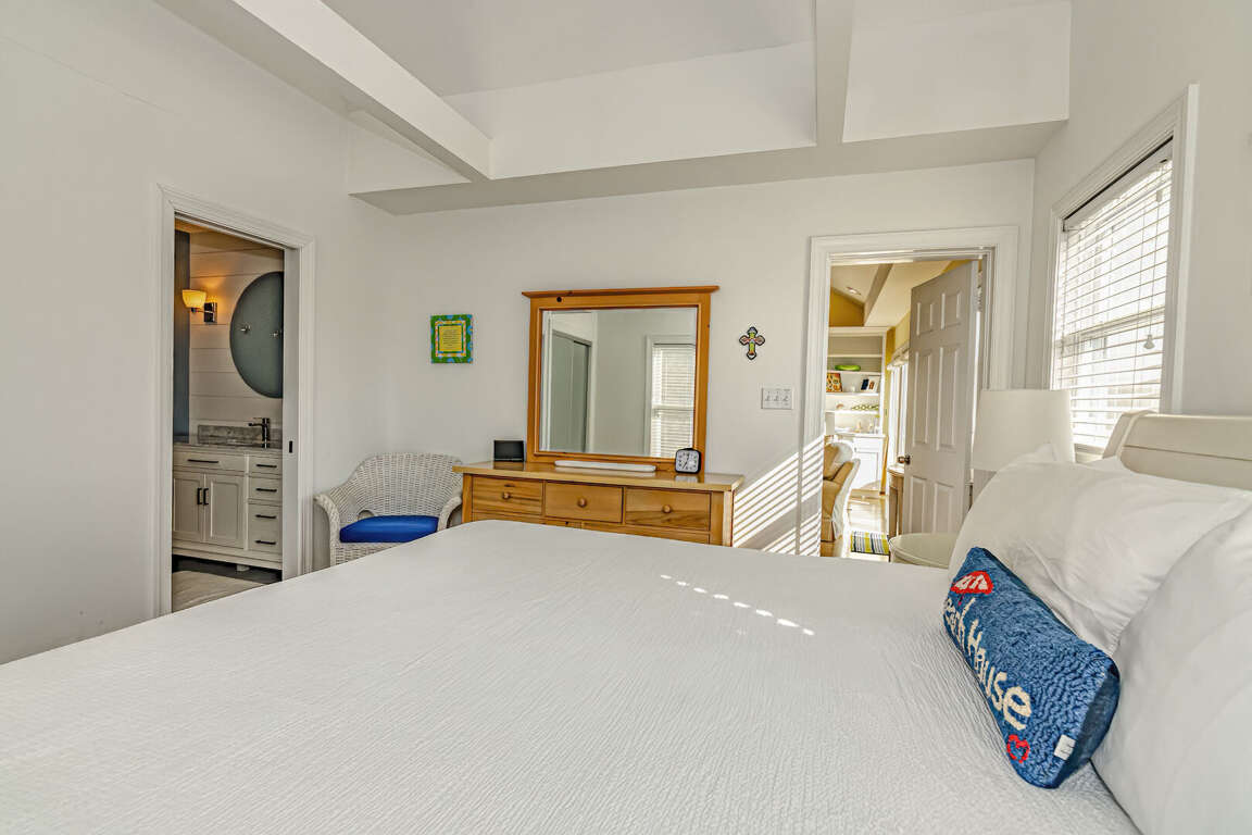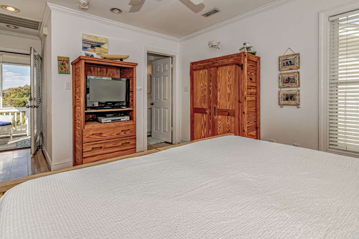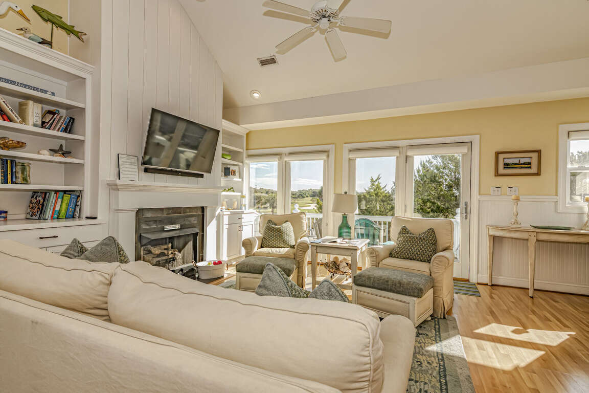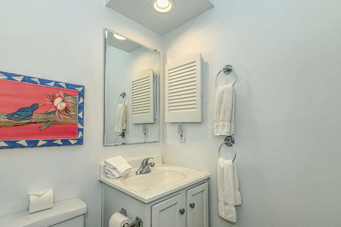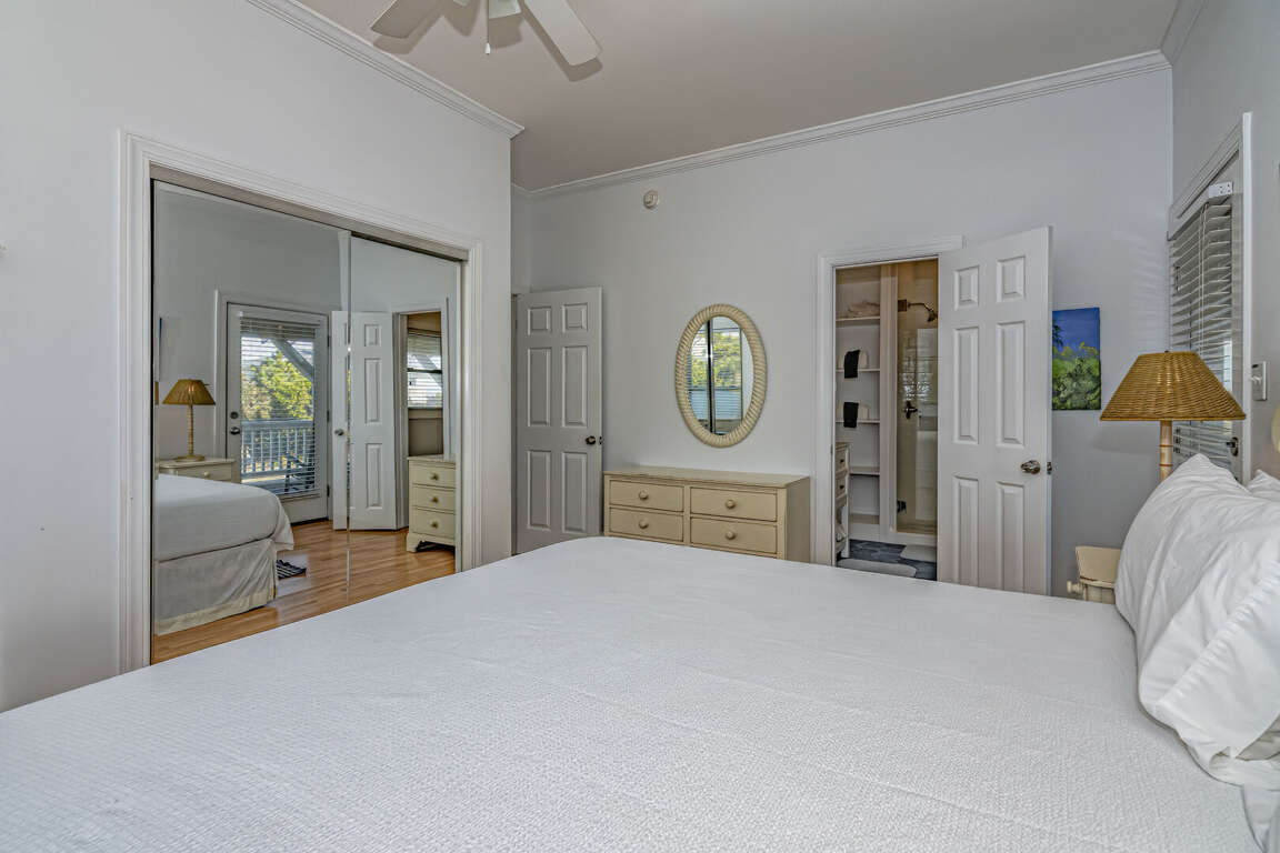 Flip Flops has a stunning view of the ocean and the signature par-3 hole of the golf club. It is the perfect place to start exploring the island with family and friends. The whimsical paintings and decor of the cottage, as well as its restful porches, will make your stay memorable. It is one of the larger homes on the island and has a unique feature, the crofter above the garage. This is the perfect hideaway for grandparents or in-laws, or anyone who wants to be alone. It has a small kitchenette with a microwave, coffee maker, sink and refrigerator. There is also a king-sized bed and a full bath. The decks and porches on the front and rear offer views in every direction. The kitchen has been expanded in recent years and is spacious. The dining table has 12 seats. There are also a dozen additional chairs on the porch just outside the front door. The covered rear porch downstairs has a swing, and half a dozen rockers. On the front porch, a group of chairs overlooks the 16th hole green. It's a great place to enjoy an afternoon cocktail. The ground floor porch features a swing, a love seat, and Adirondack chairs for a getaway haven. The downstairs master bedroom features a king-sized bed, an adjoining bathroom and access to the deck. The twin bedroom is also connected to the deck, and shares a hall bath with another twin room.