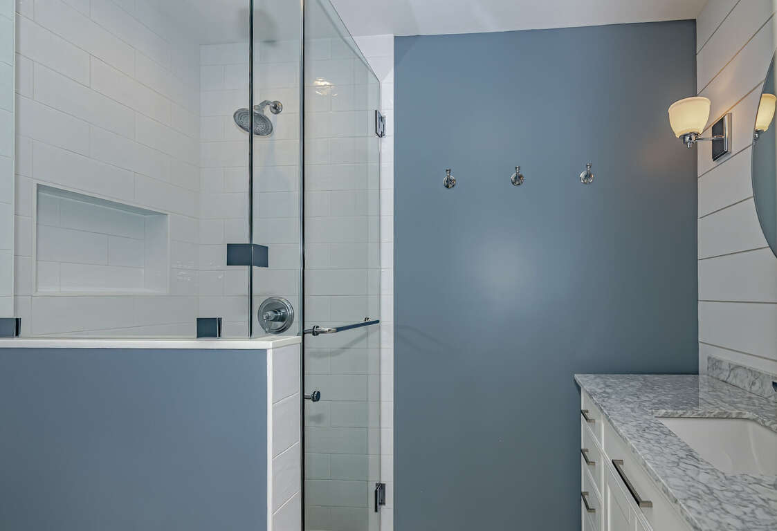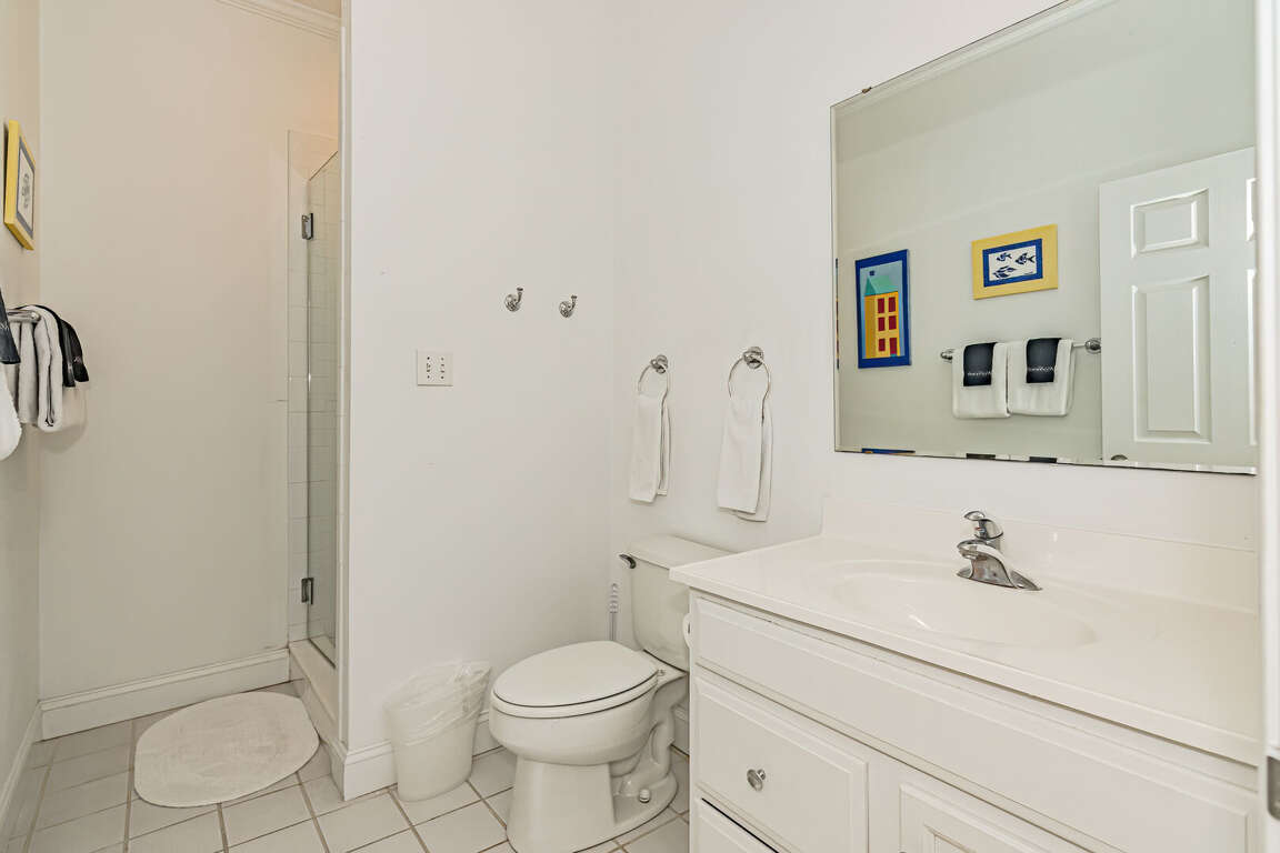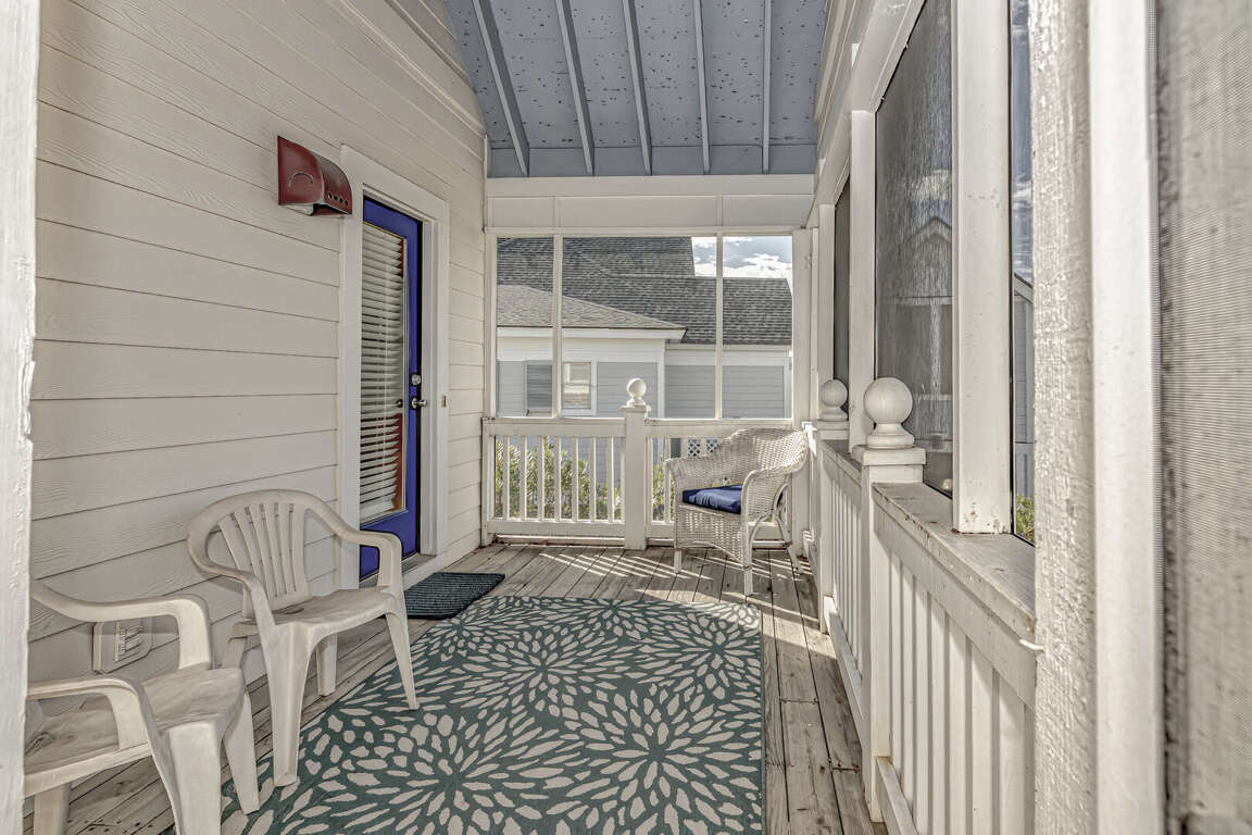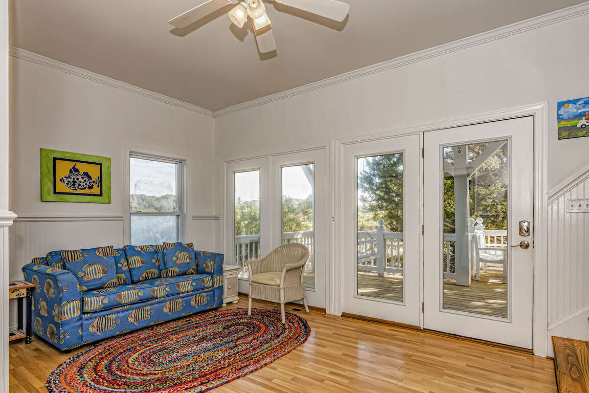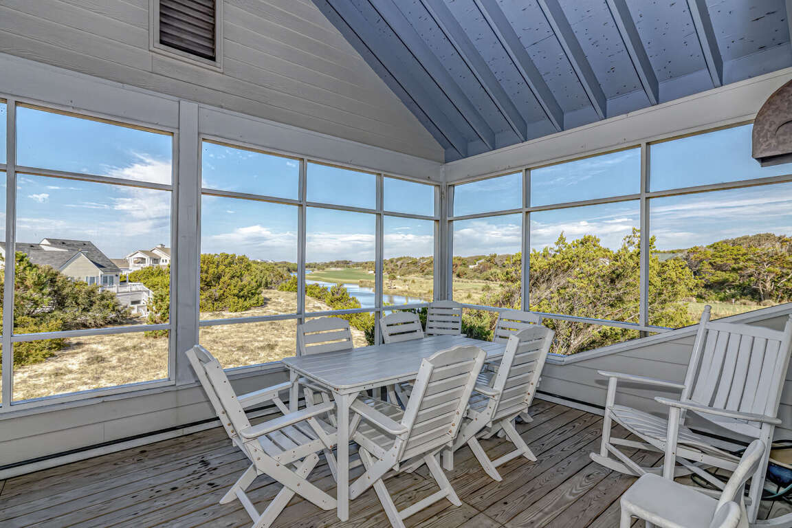 Flip Flops has a stunning view of the ocean and the signature par-3 hole of the golf club. It is the perfect place to start exploring the island with family and friends. The whimsical paintings and decor of the cottage, as well as its restful porches, will make your stay memorable. It is one of the larger homes on the island and has a unique feature, the crofter above the garage. This is the perfect hideaway for grandparents or in-laws, or anyone who wants to be alone. It has a small kitchenette with a microwave, coffee maker, sink and refrigerator. There is also a king-sized bed and a full bath. The decks and porches on the front and rear offer views in every direction. The kitchen has been expanded in recent years and is spacious. The dining table has 12 seats. There are also a dozen additional chairs on the porch just outside the front door. The covered rear porch downstairs has a swing, and half a dozen rockers. On the front porch, a group of chairs overlooks the 16th hole green. It's a great place to enjoy an afternoon cocktail. The ground floor porch features a swing, a love seat, and Adirondack chairs for a getaway haven. The downstairs master bedroom features a king-sized bed, an adjoining bathroom and access to the deck. The twin bedroom is also connected to the deck, and shares a hall bath with another twin room.