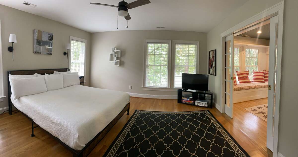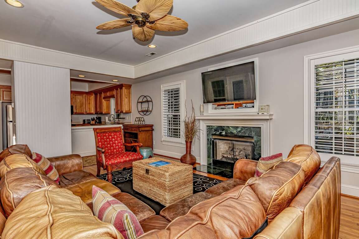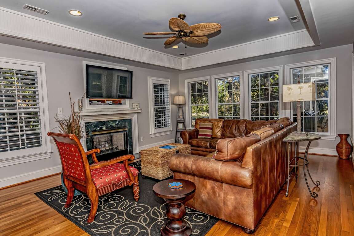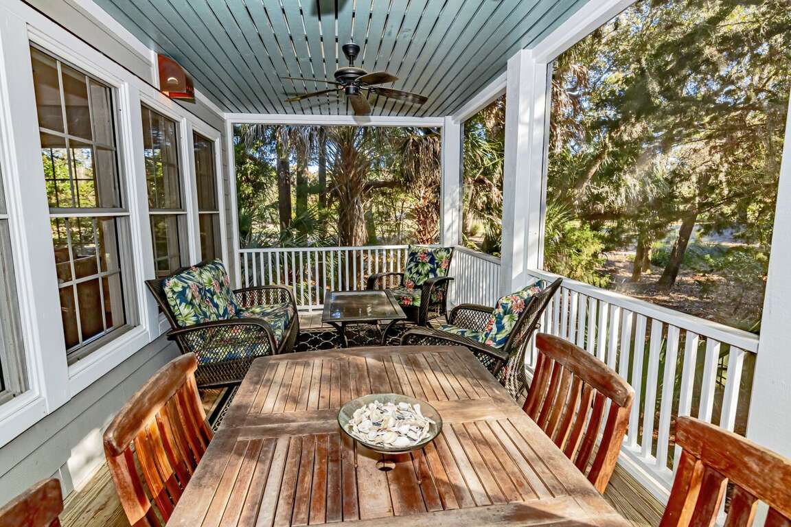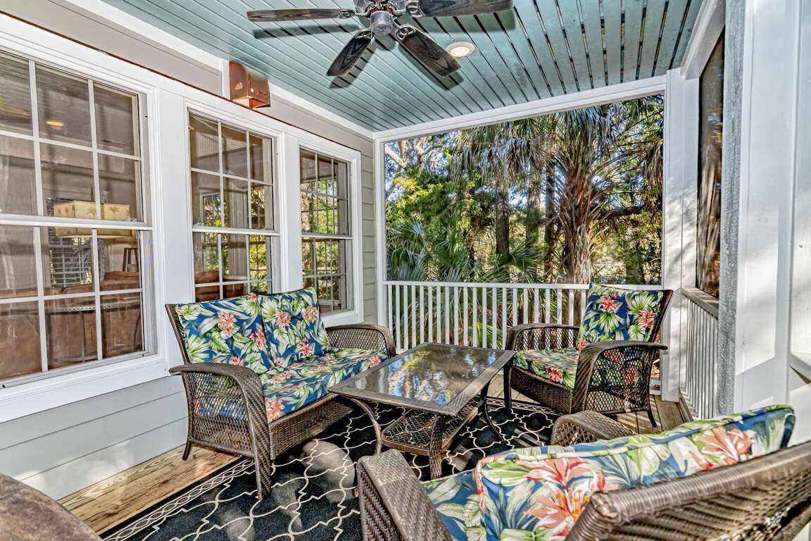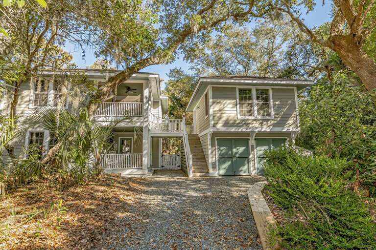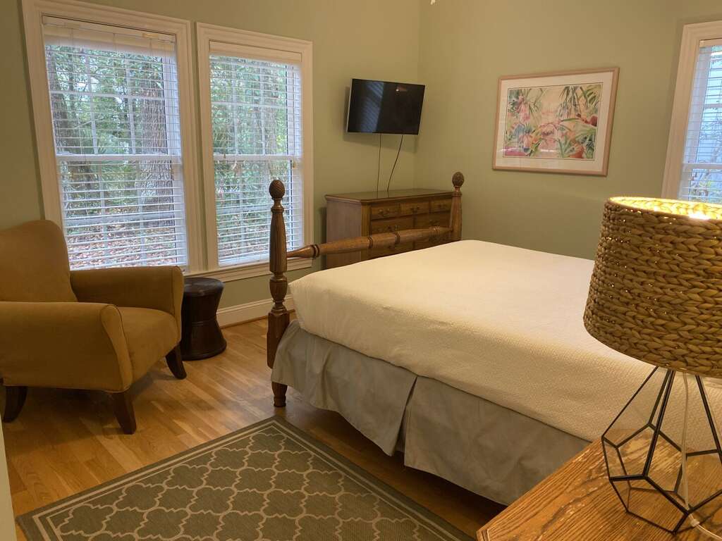 Baldy's Haven offers privacy while being in the center of everything. It's located in the middle of island, close to the beach, the market, the restaurants and the clubs. The house is located on the 12th fairway, and there is plenty of space for everyone. Three bedrooms are in the main house, and one is in the crofter above the garage. Each bedroom has a TV and a full bathroom. The master bedroom suite has a sitting room that is perfect for a morning coffee in the forest or golf course. The large living area can accommodate everyone. The kitchen is spacious and well-stocked. The master bedroom is a king. The second bedroom has a queen. The kids' room has two bunk beds and a trundle. The crofter has a king size bed.
