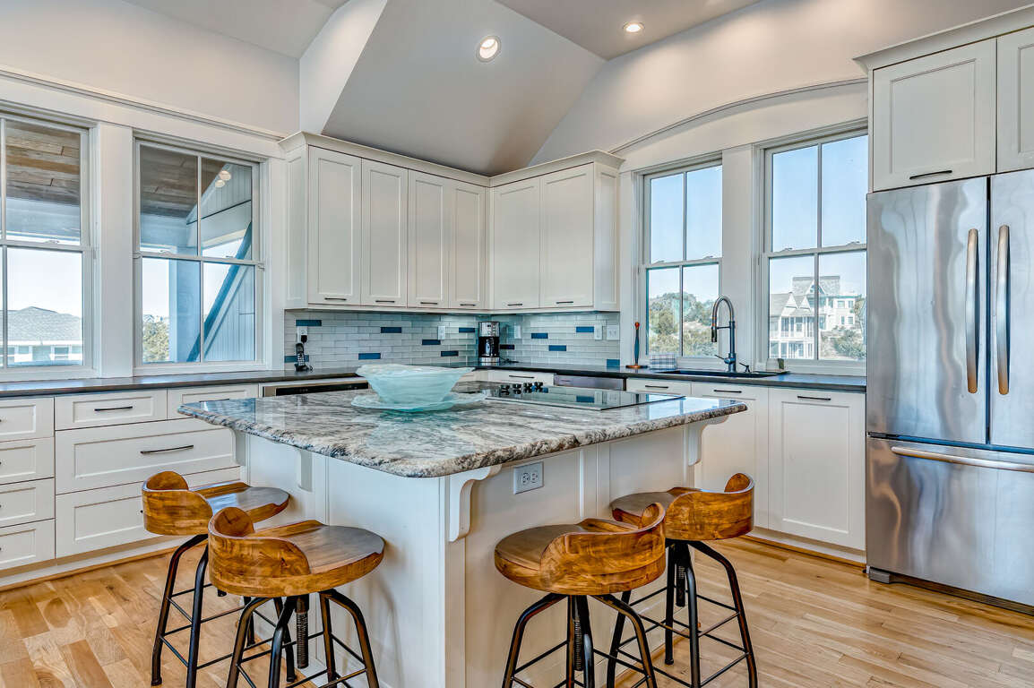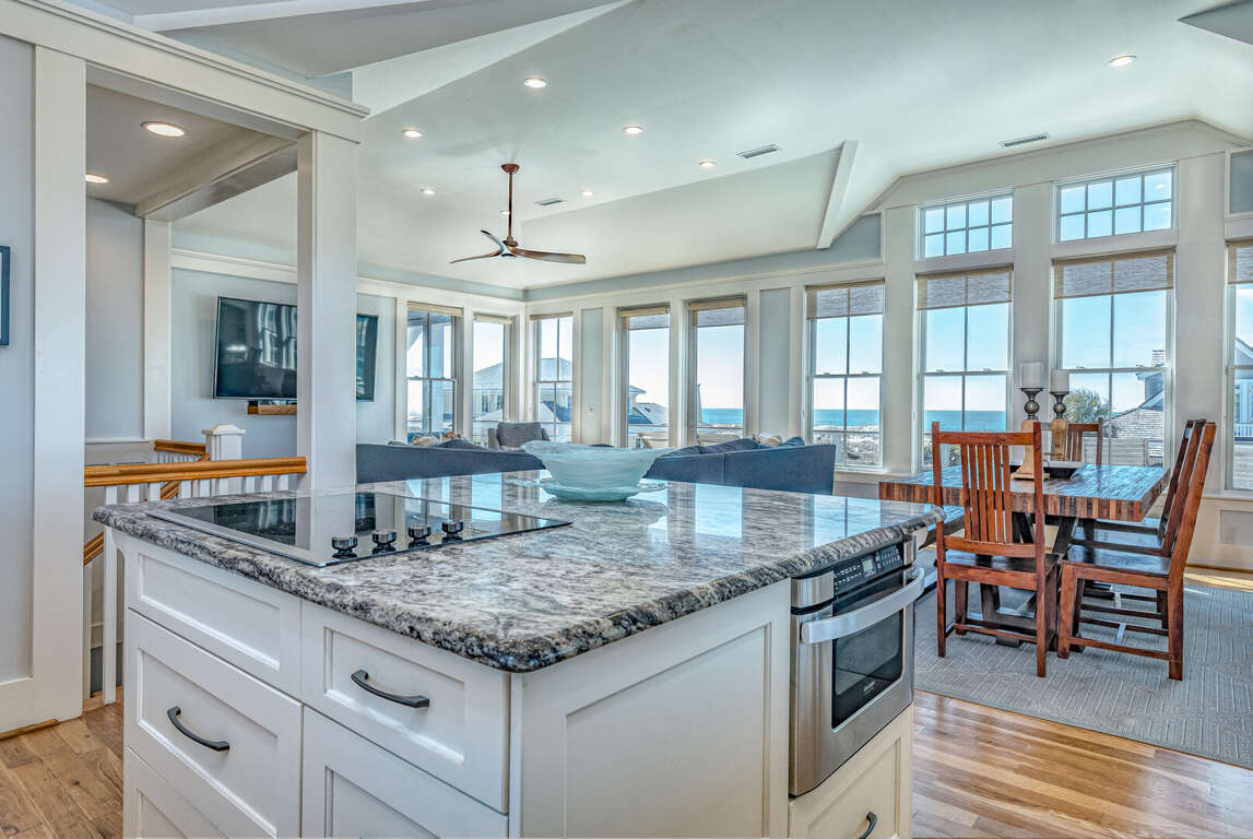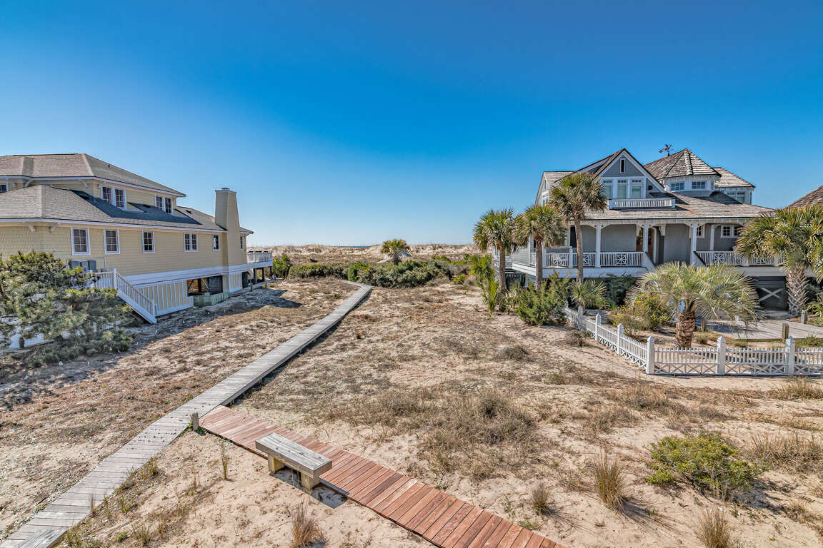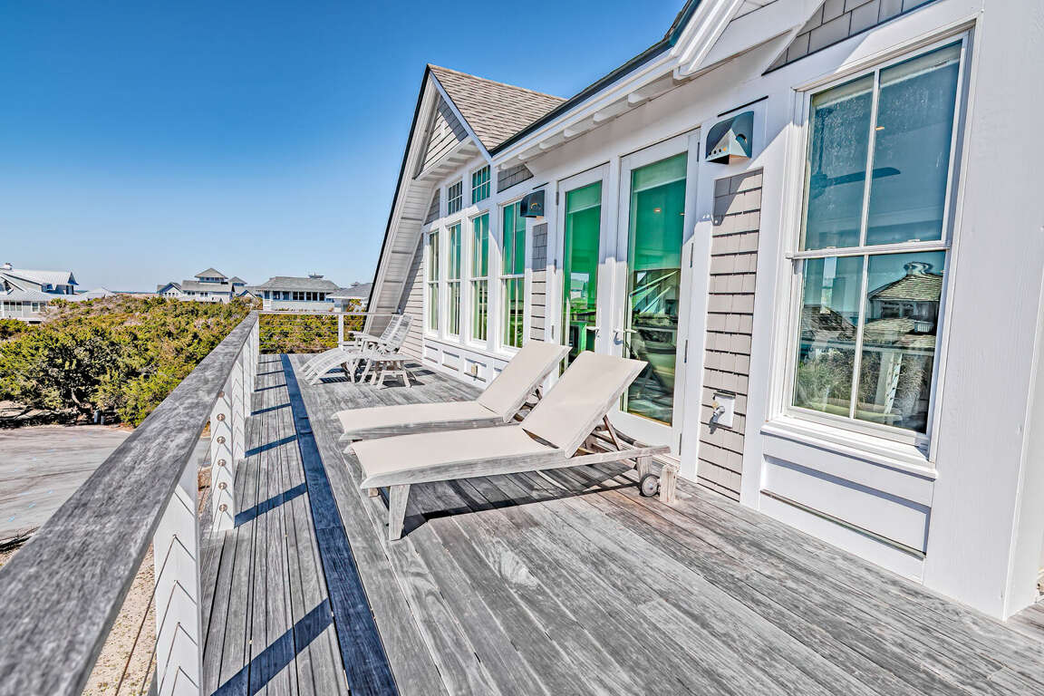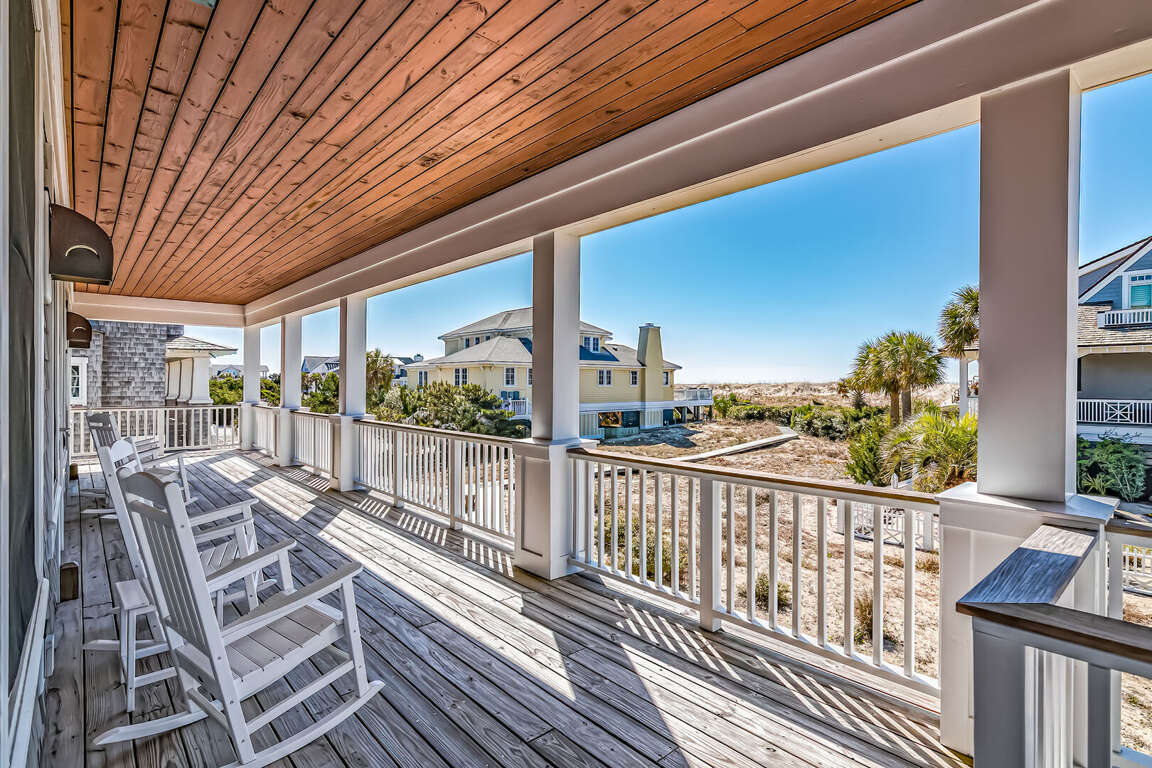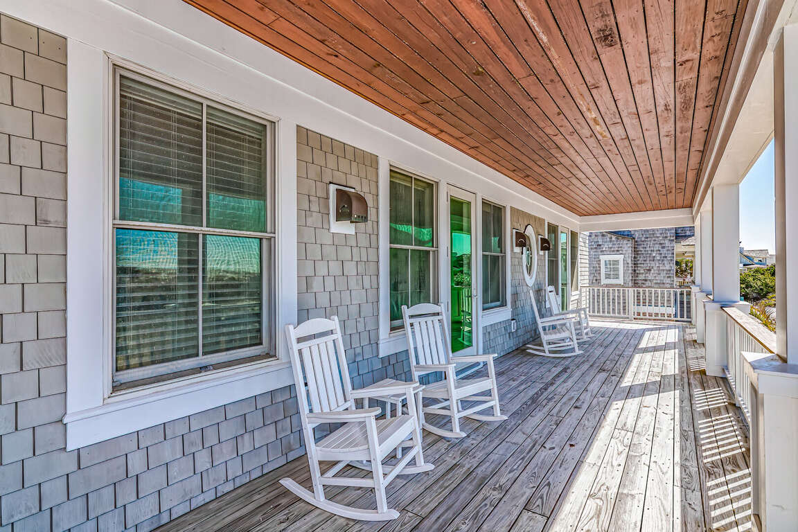 This newly constructed house, located in the Braemar area on the way to East Beach is a second row beauty with great views, and brand new décor. This house probably gets more praise than any other. Top of the range. The best of everything We hear it all. The living room is located on the second level to maximize views. There are many decks and porches to enjoy outdoor living and entertaining. Each bedroom has a full bathroom. There are TVs in each bedroom and a large flat screen in the living area. The downstairs living room has a queen size pullout sofa that can be used for extra sleeping. The kids' rooms have two bunk beds and a flat-screen TV for movies and games. The private walkway that leads to the secluded, only-used-by-neighboring homeowners beach is just a few steps away. You must see this house in person to understand what they mean.