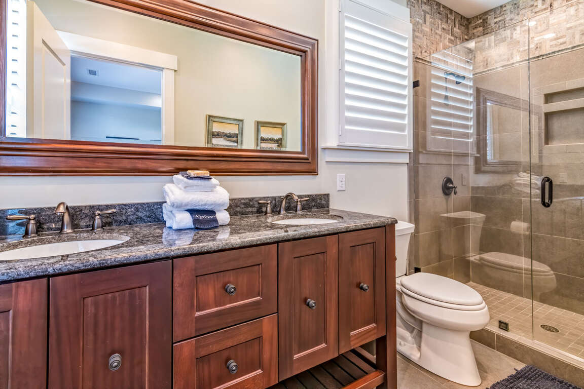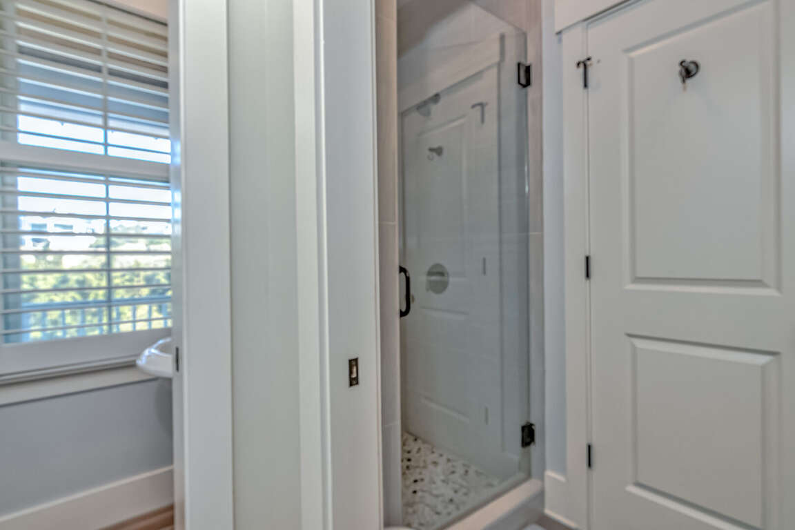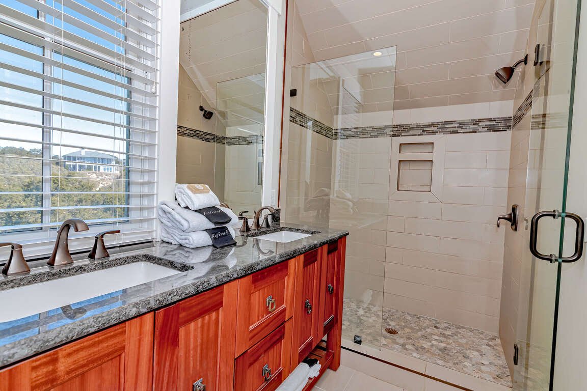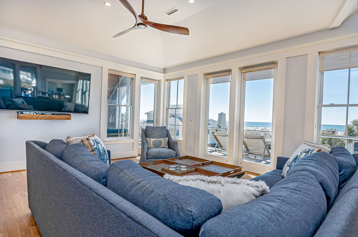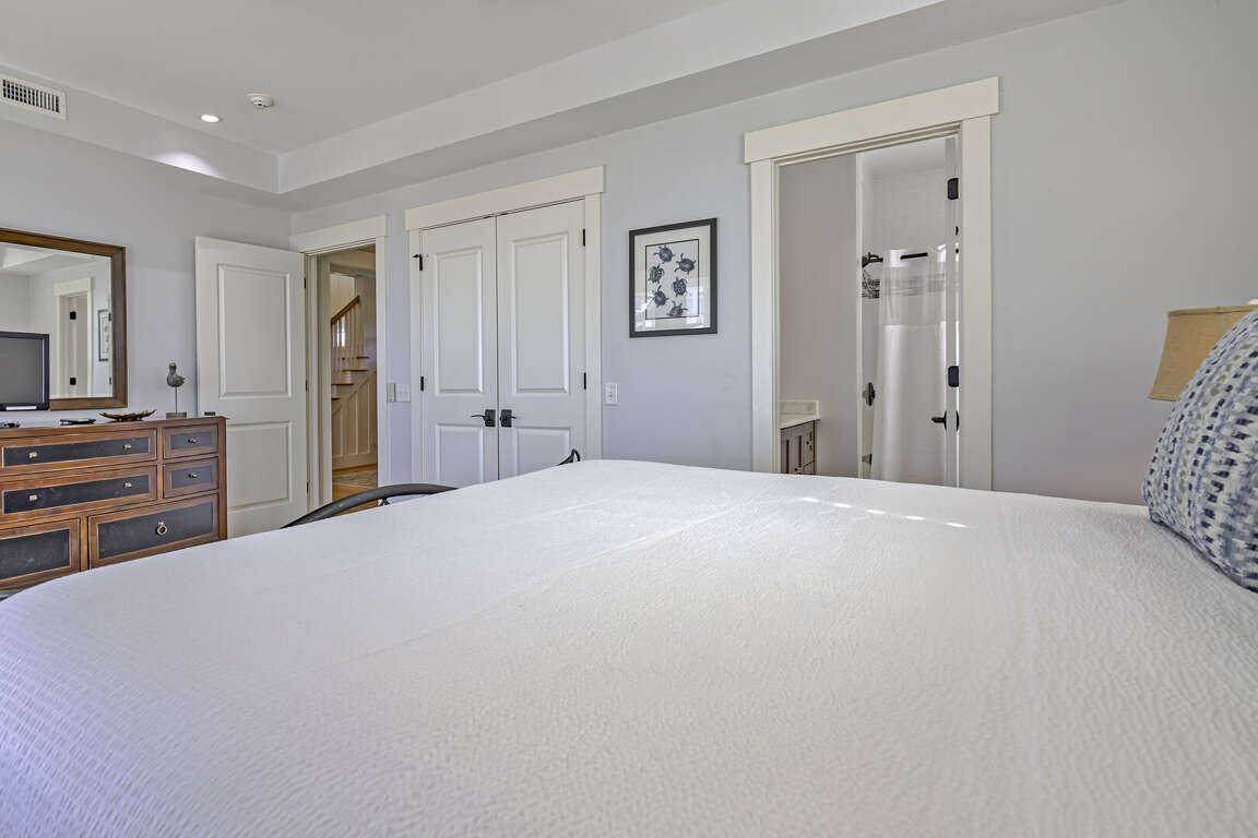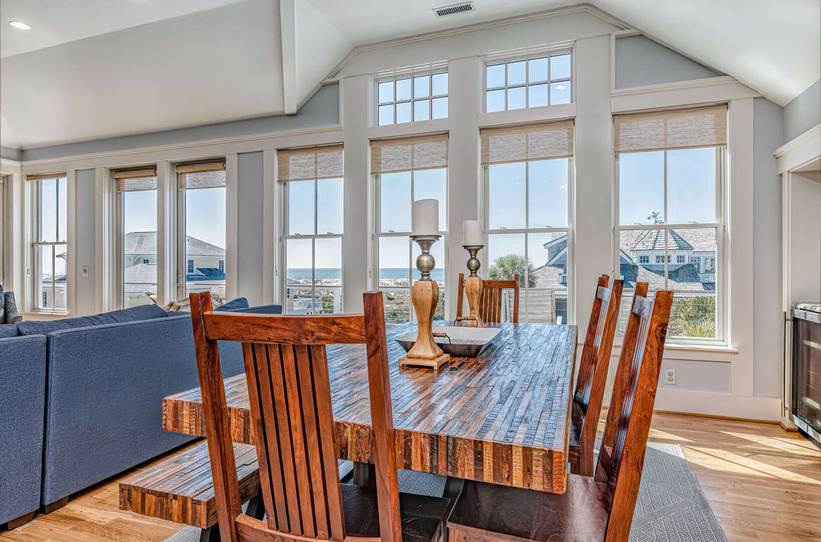 This newly constructed house, located in the Braemar area on the way to East Beach is a second row beauty with great views, and brand new décor. This house probably gets more praise than any other. Top of the range. The best of everything We hear it all. The living room is located on the second level to maximize views. There are many decks and porches to enjoy outdoor living and entertaining. Each bedroom has a full bathroom. There are TVs in each bedroom and a large flat screen in the living area. The downstairs living room has a queen size pullout sofa that can be used for extra sleeping. The kids' rooms have two bunk beds and a flat-screen TV for movies and games. The private walkway that leads to the secluded, only-used-by-neighboring homeowners beach is just a few steps away. You must see this house in person to understand what they mean.