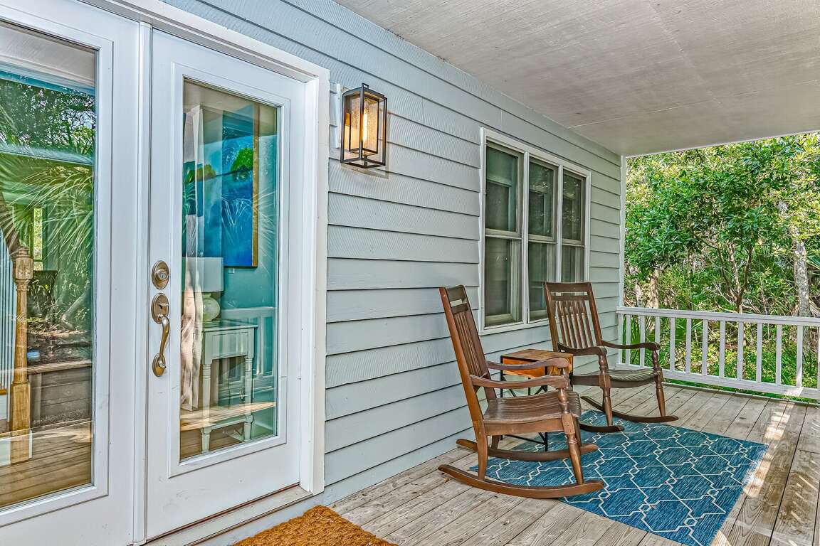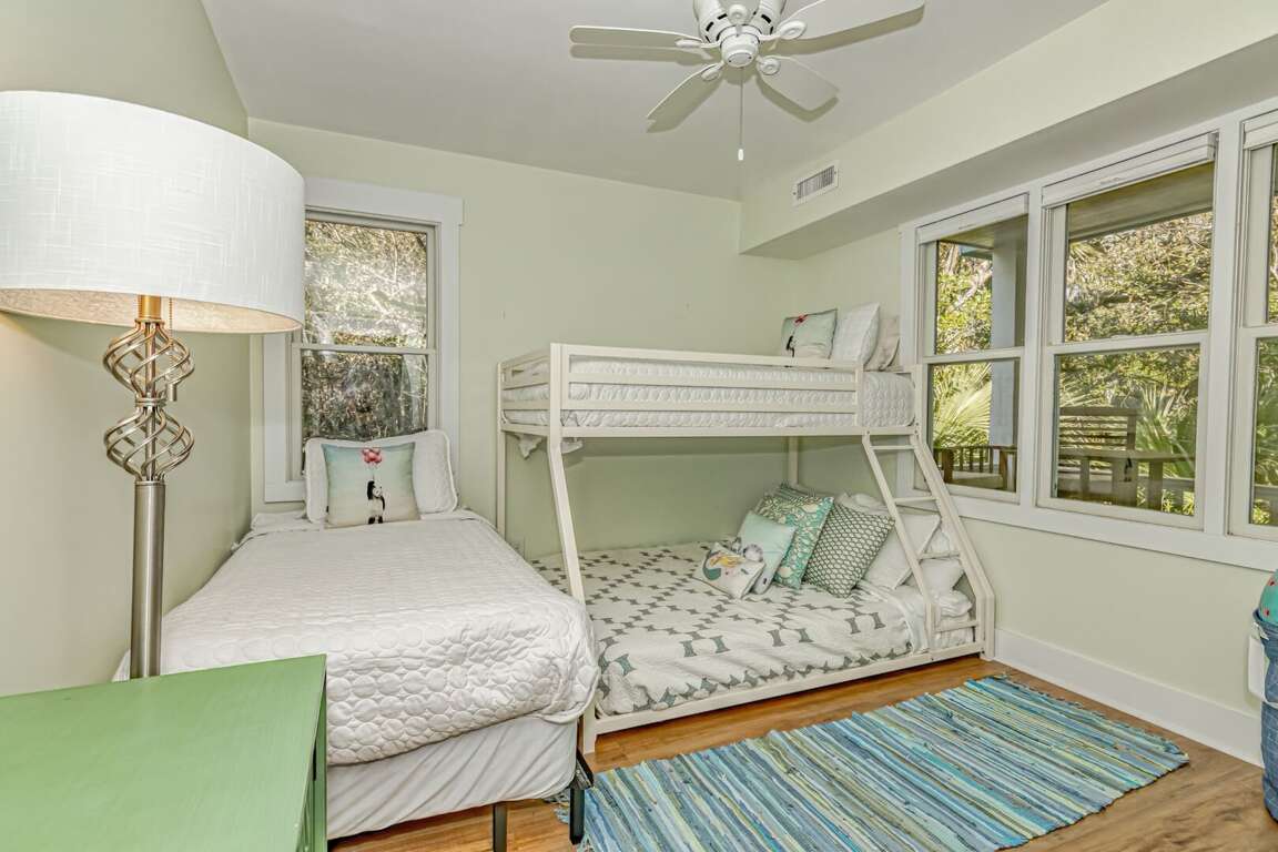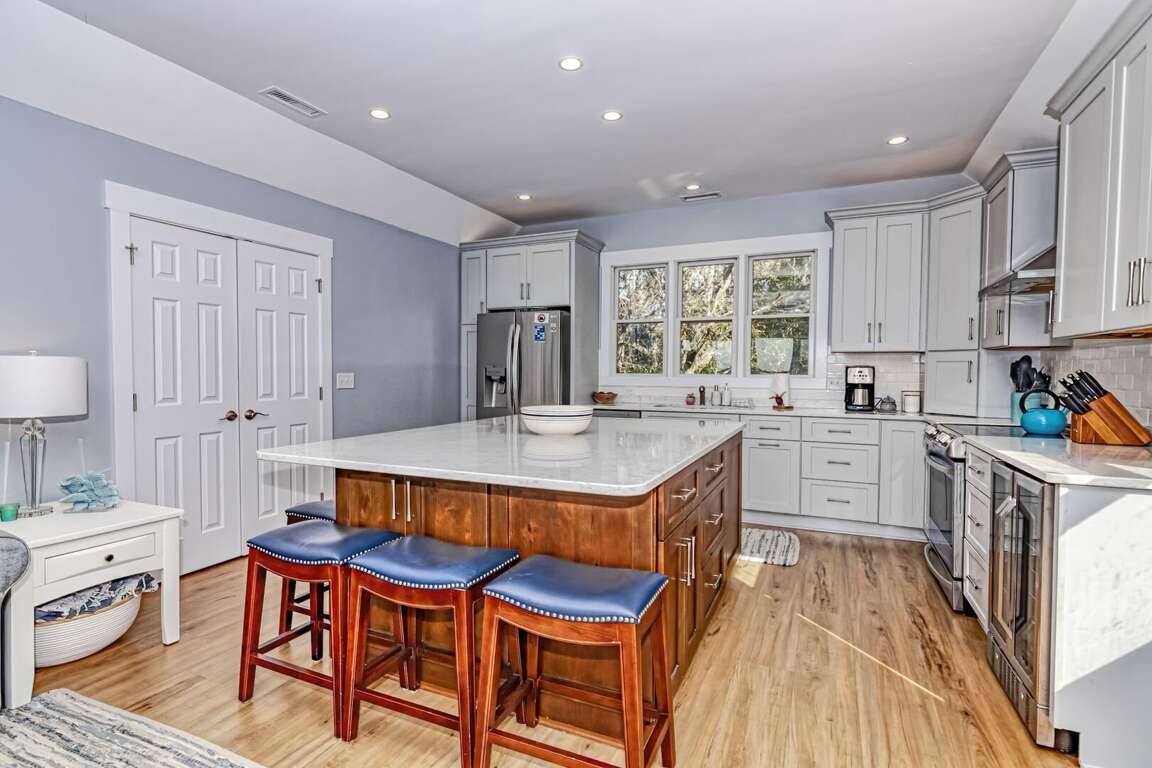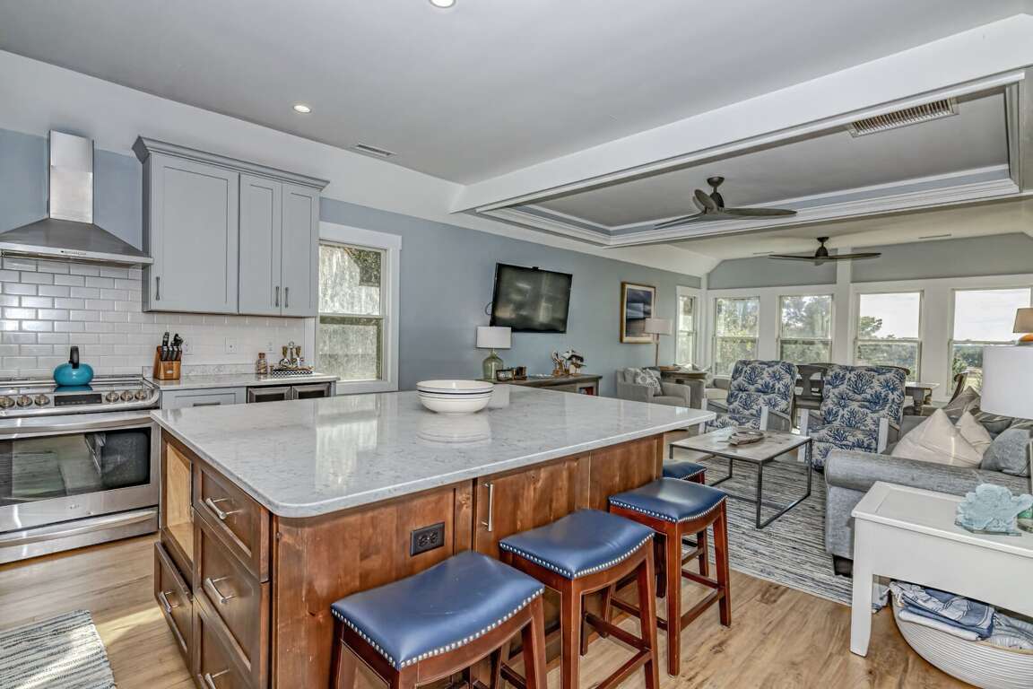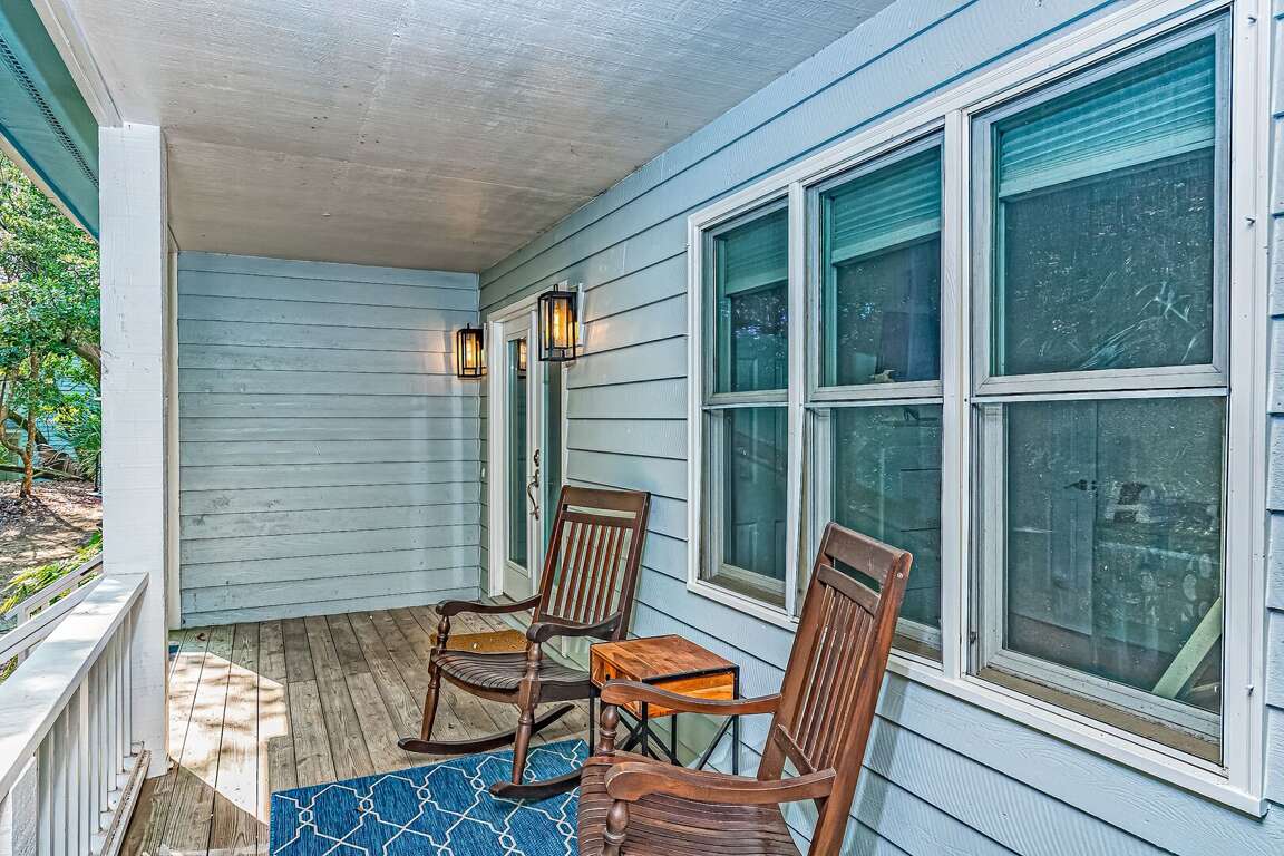 You will find 3 bedrooms on the lower level. The first bedroom is a master queen with a private bathroom. The other two bedrooms have a shared bath. The second bedroom has a queen bed and the third bedroom is a spacious bunk bedroom with 2 twins, a double and a large double bed. The main living area is located upstairs and boasts a stylish kitchen with a well-stocked inventory (including an air fryer & ice cream maker! The main living area is upstairs, with a stylish kitchen (including an ice cream maker & air fryer! ), a dining room, and a view of the golf courses. A cozy screen porch is located just outside the main living space. It's one of our favorite features! It is the best to sip a cup of joe while watching the BHI wildlife walk by your backyard. A large sundeck is located above the screened-in porch, so you can enjoy the sun while enjoying the views. The main level also has a king-size master suite with a double sink vanity and oversized walk-in shower.