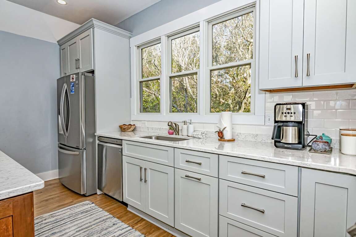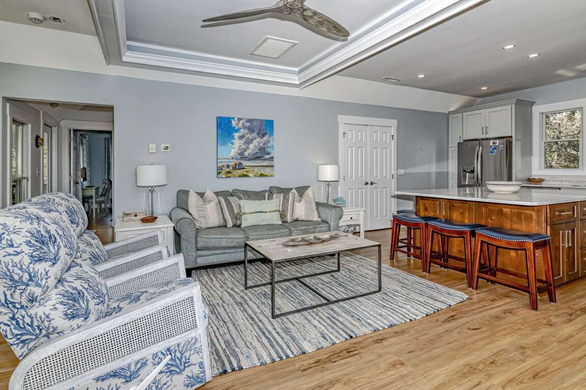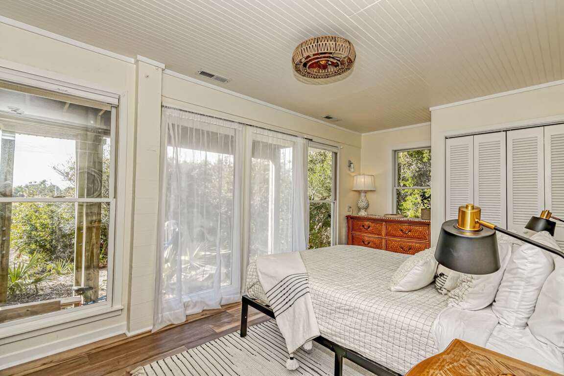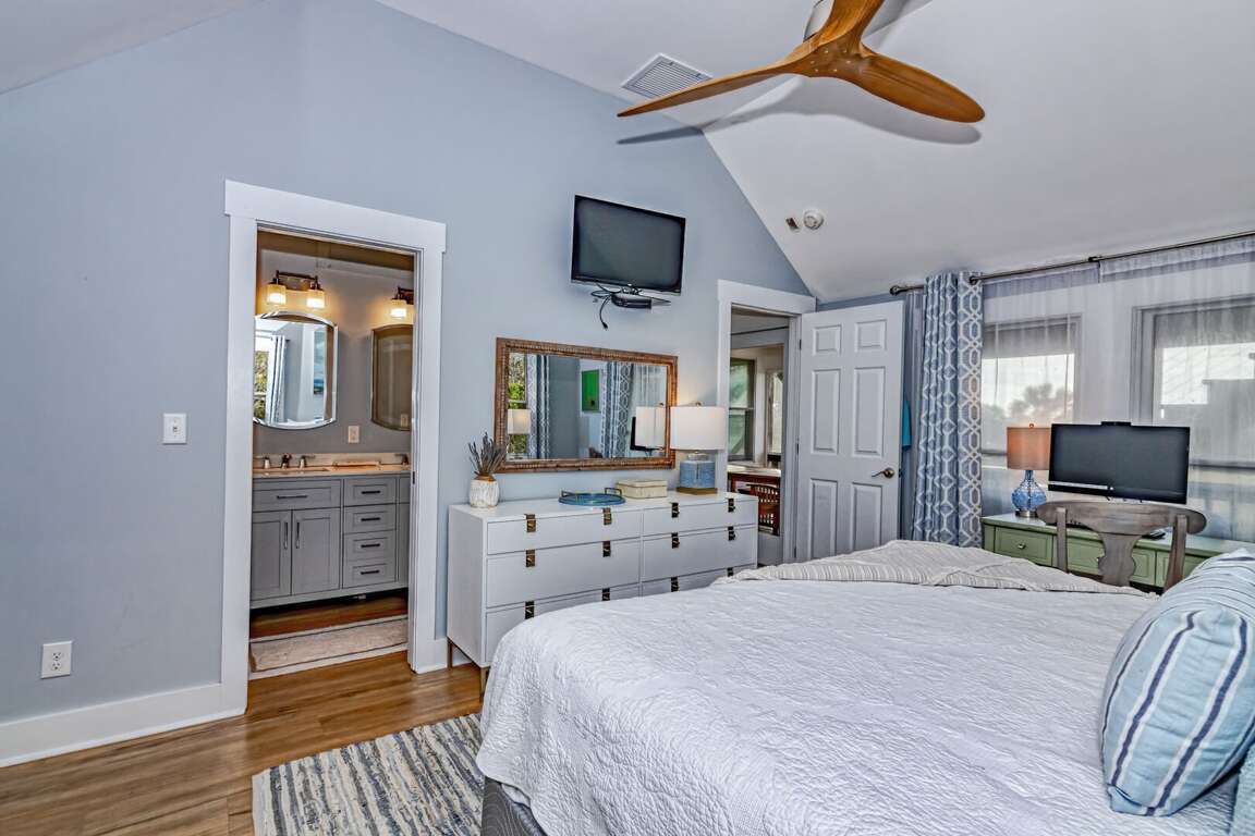 You will find 3 bedrooms on the lower level. The first bedroom is a master queen with a private bathroom. The other two bedrooms have a shared bath. The second bedroom has a queen bed and the third bedroom is a spacious bunk bedroom with 2 twins, a double and a large double bed. The main living area is located upstairs and boasts a stylish kitchen with a well-stocked inventory (including an air fryer & ice cream maker! The main living area is upstairs, with a stylish kitchen (including an ice cream maker & air fryer! ), a dining room, and a view of the golf courses. A cozy screen porch is located just outside the main living space. It's one of our favorite features! It is the best to sip a cup of joe while watching the BHI wildlife walk by your backyard. A large sundeck is located above the screened-in porch, so you can enjoy the sun while enjoying the views. The main level also has a king-size master suite with a double sink vanity and oversized walk-in shower.