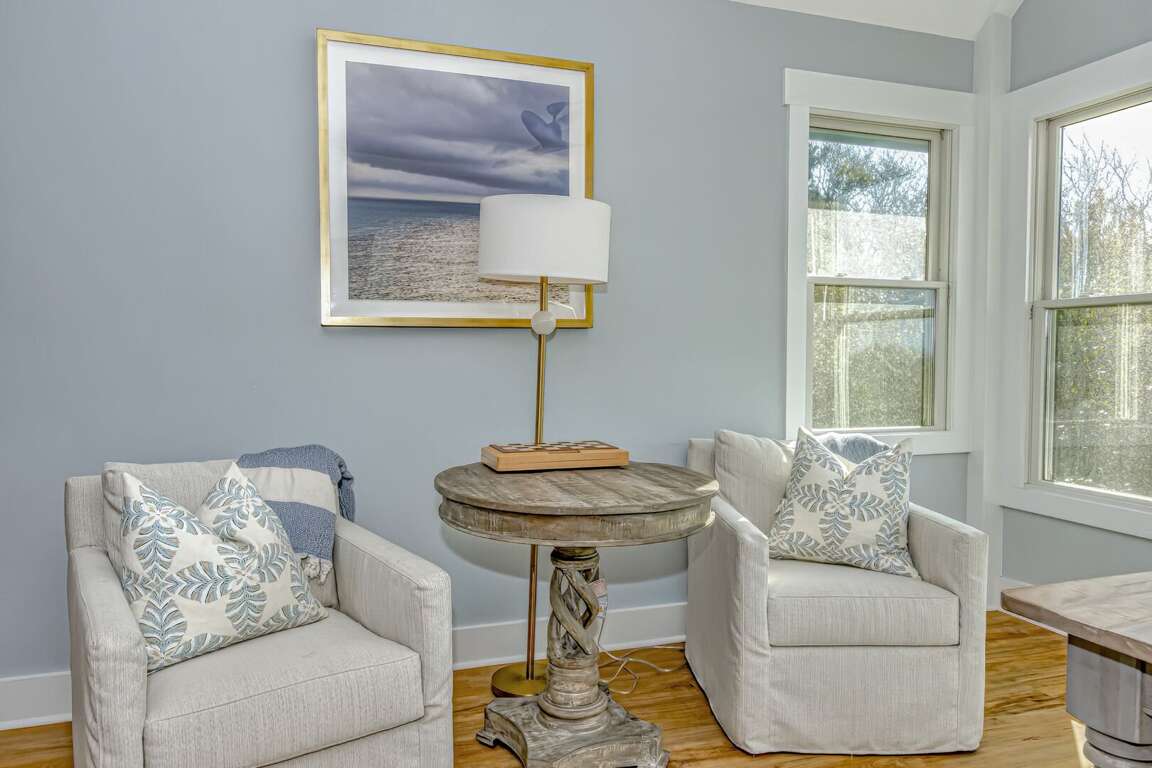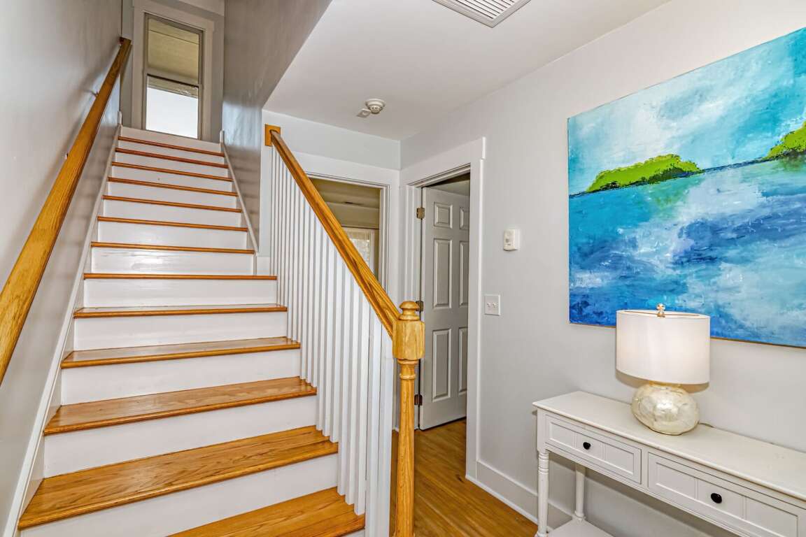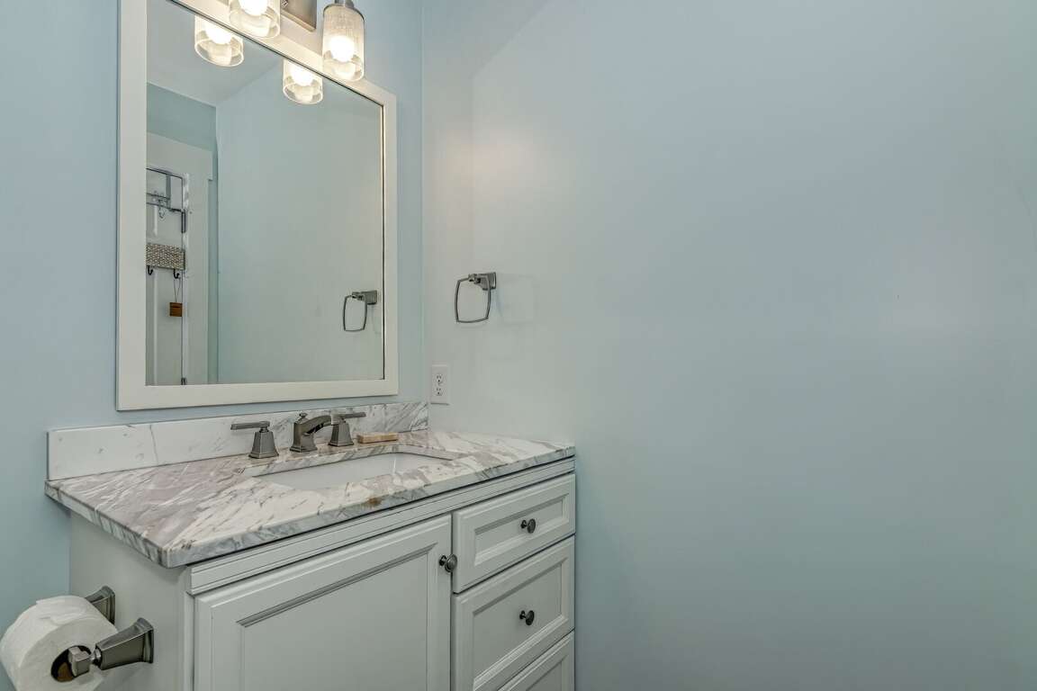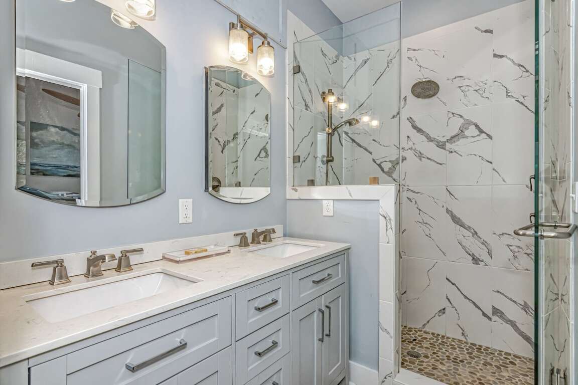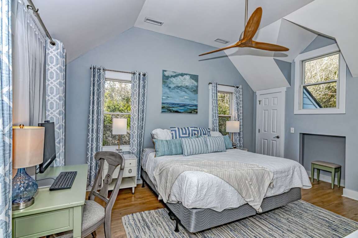 You will find 3 bedrooms on the lower level. The first bedroom is a master queen with a private bathroom. The other two bedrooms have a shared bath. The second bedroom has a queen bed and the third bedroom is a spacious bunk bedroom with 2 twins, a double and a large double bed. The main living area is located upstairs and boasts a stylish kitchen with a well-stocked inventory (including an air fryer & ice cream maker! The main living area is upstairs, with a stylish kitchen (including an ice cream maker & air fryer! ), a dining room, and a view of the golf courses. A cozy screen porch is located just outside the main living space. It's one of our favorite features! It is the best to sip a cup of joe while watching the BHI wildlife walk by your backyard. A large sundeck is located above the screened-in porch, so you can enjoy the sun while enjoying the views. The main level also has a king-size master suite with a double sink vanity and oversized walk-in shower.