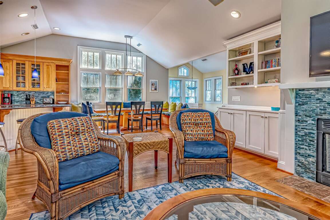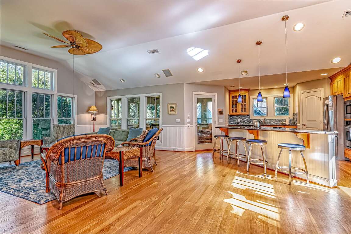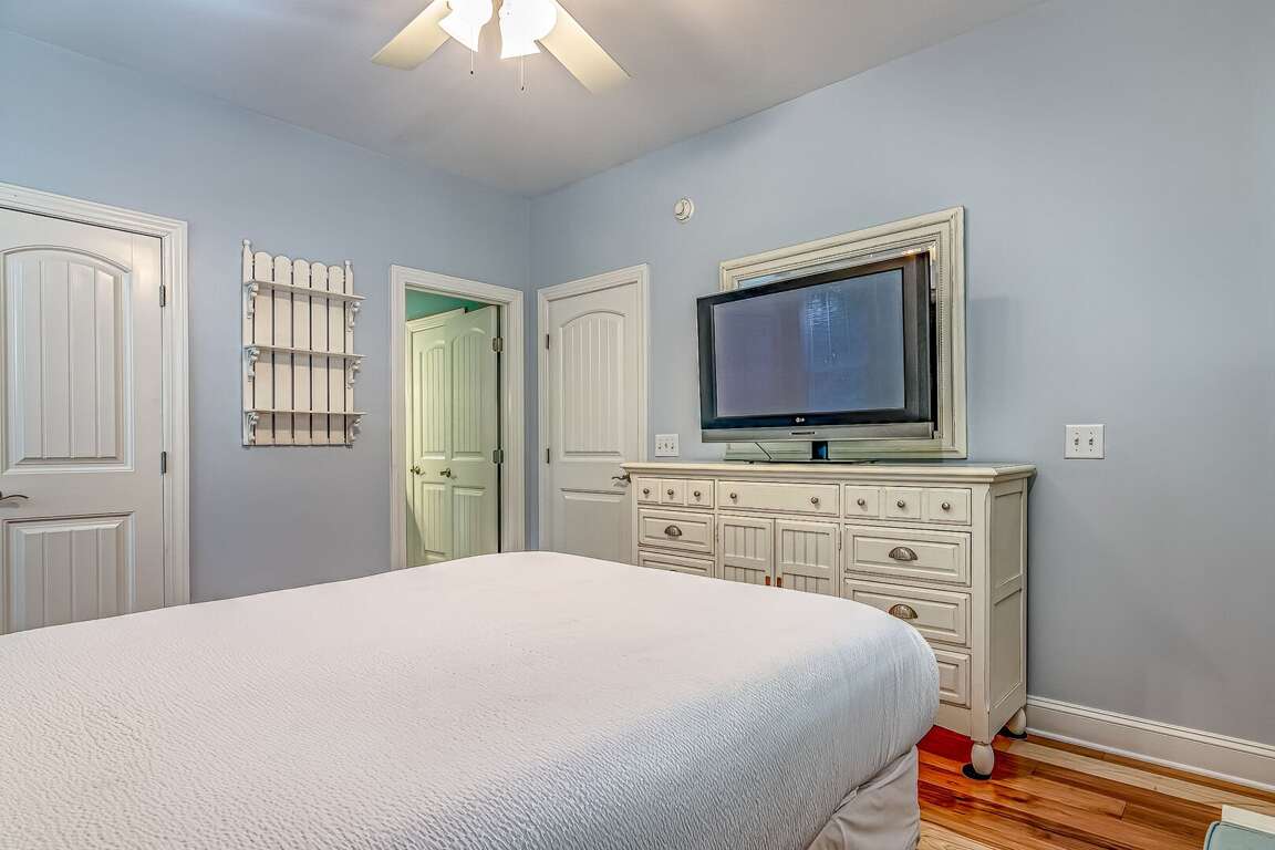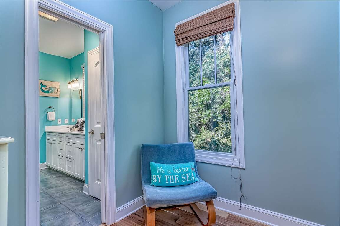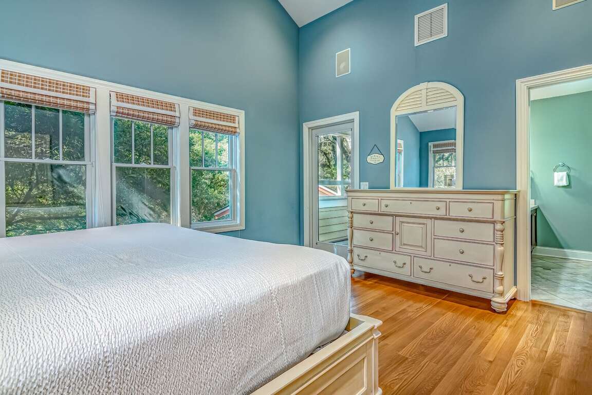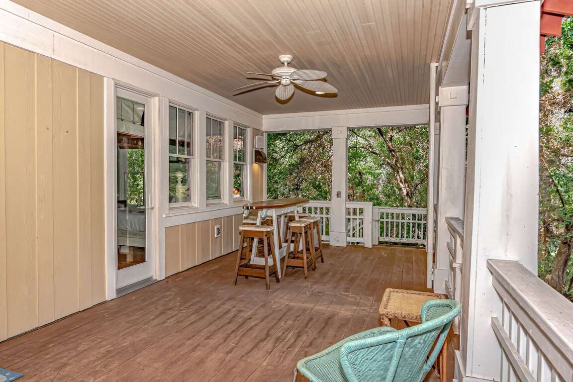 Enjoy the feeling of living on the tops of the live oaks. The reversed floor plan is perfect for entertaining family members. We have a spacious, well-stocked kitchen with plenty of comfortable seating to accommodate the entire family. The king master bedroom is located upstairs, along with a bathroom.