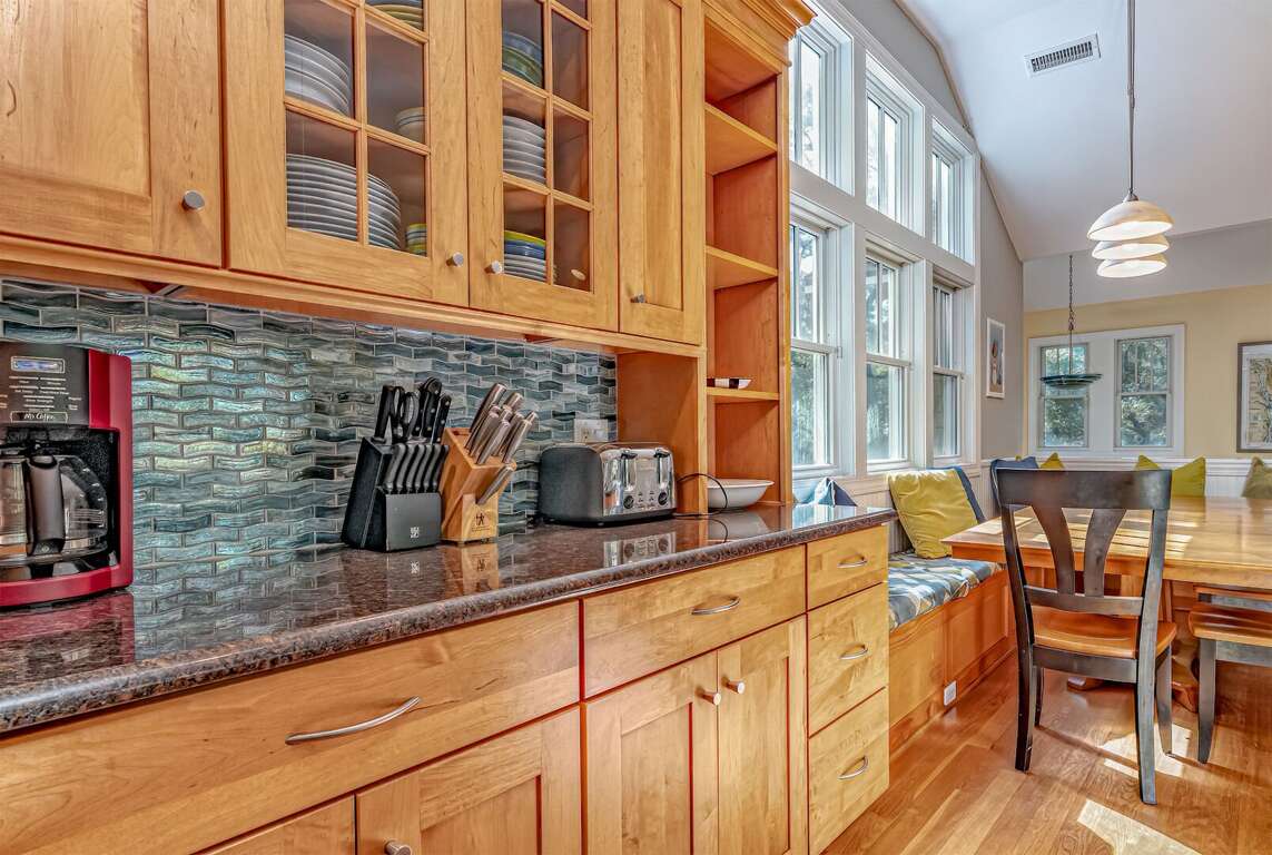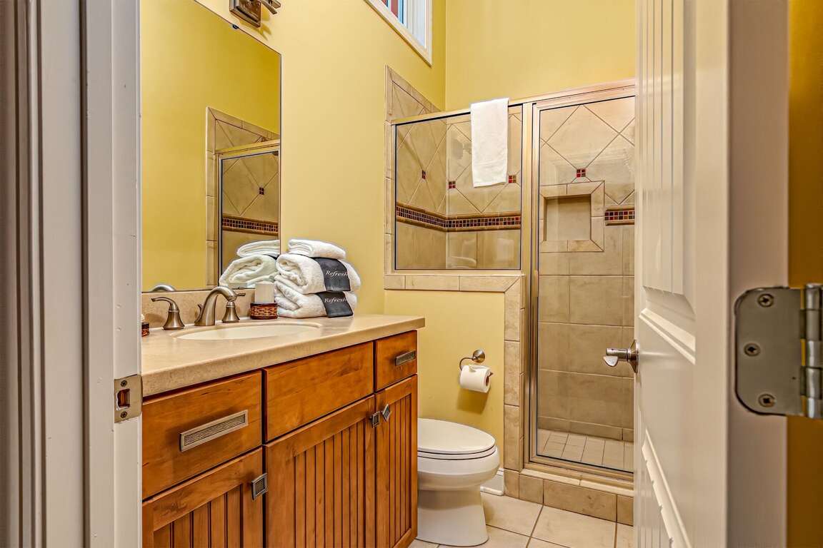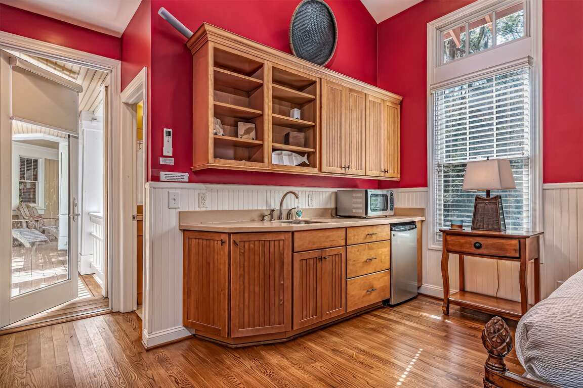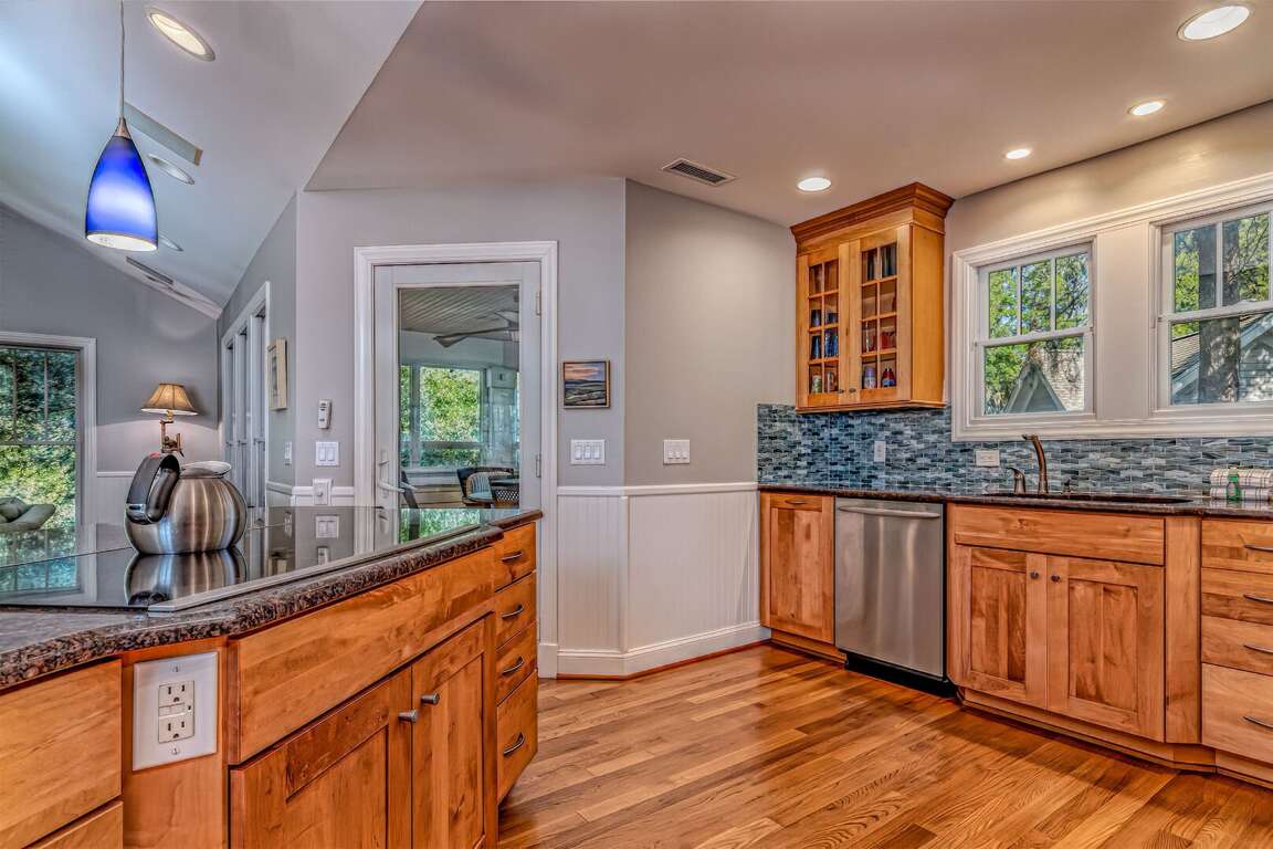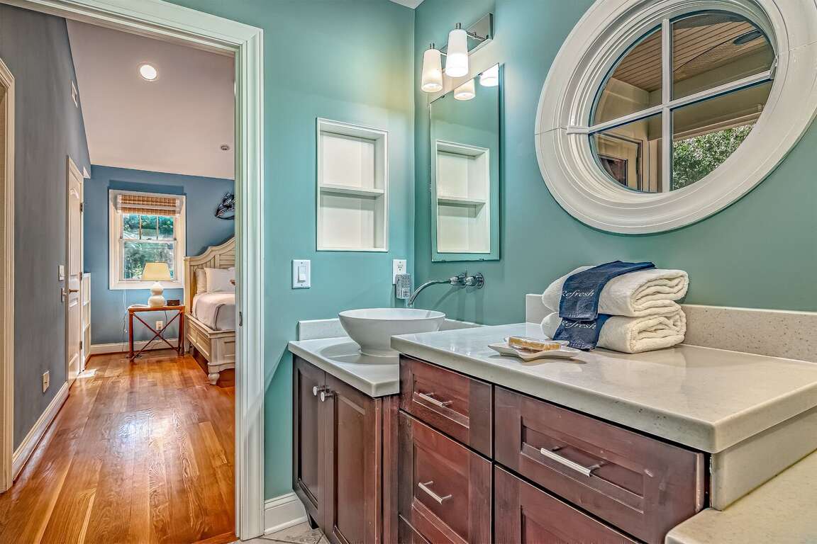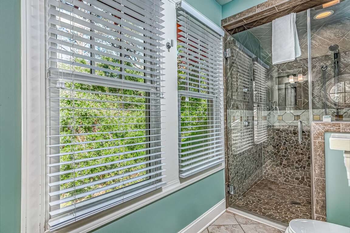Enjoy the feeling of living on the tops of the live oaks. The reversed floor plan is perfect for entertaining family members. We have a spacious, well-stocked kitchen with plenty of comfortable seating to accommodate the entire family. The king master bedroom is located upstairs, along with a bathroom.