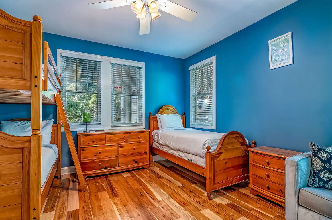 The main floor features a queen master bedroom with a bath in the hall. The second bedroom (queen bed), and the third bedroom (bunk beds & single beds & pull-out twin sofa) share one bath.