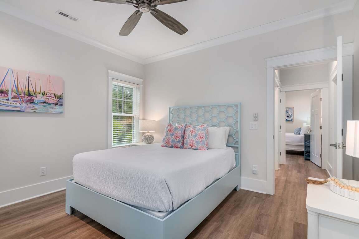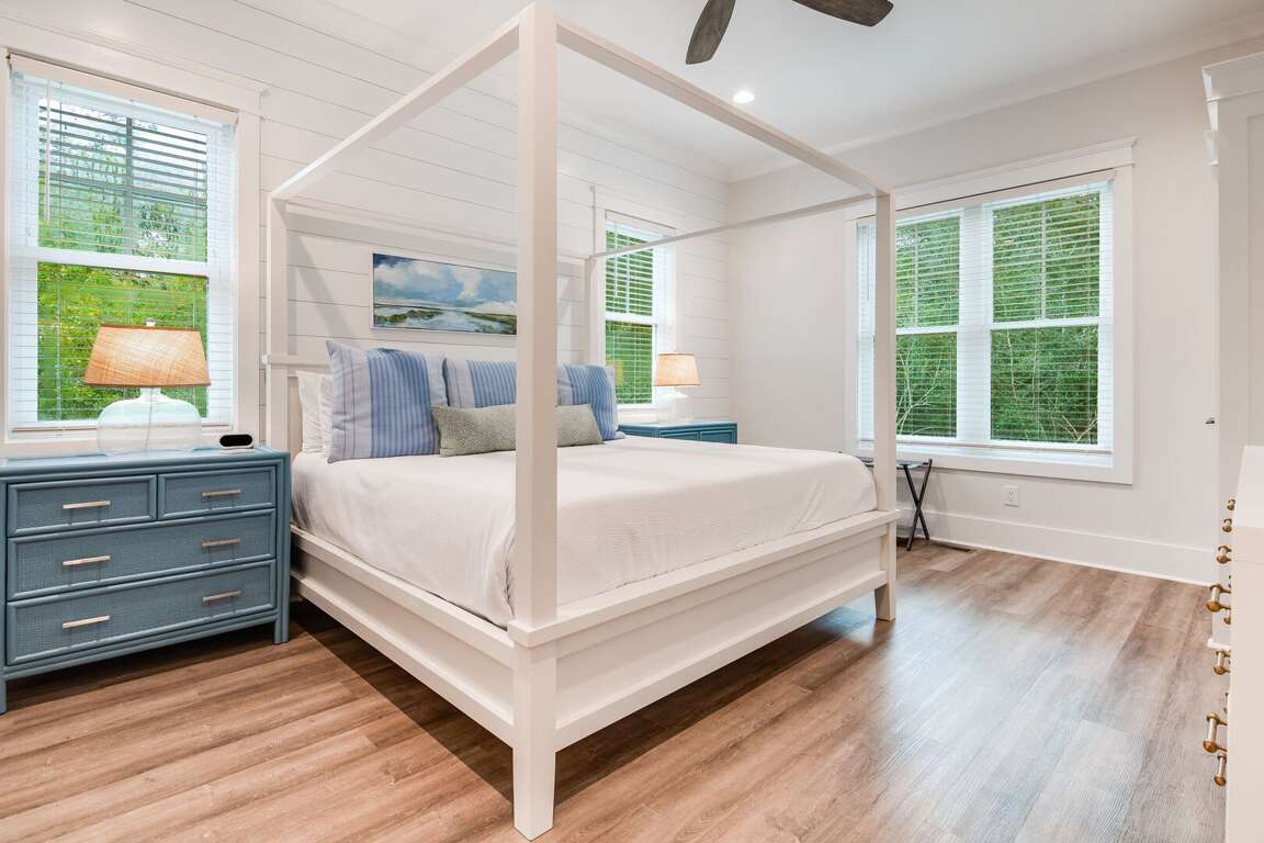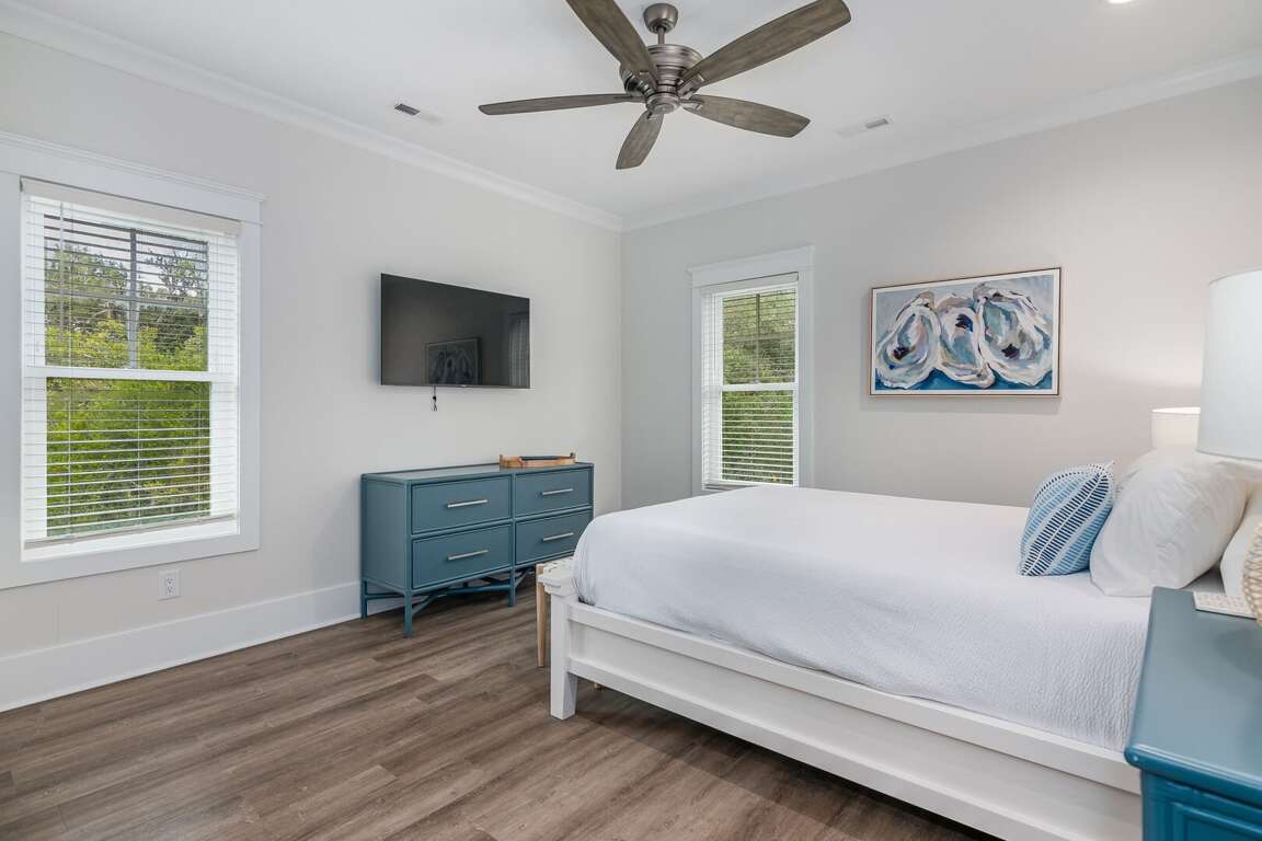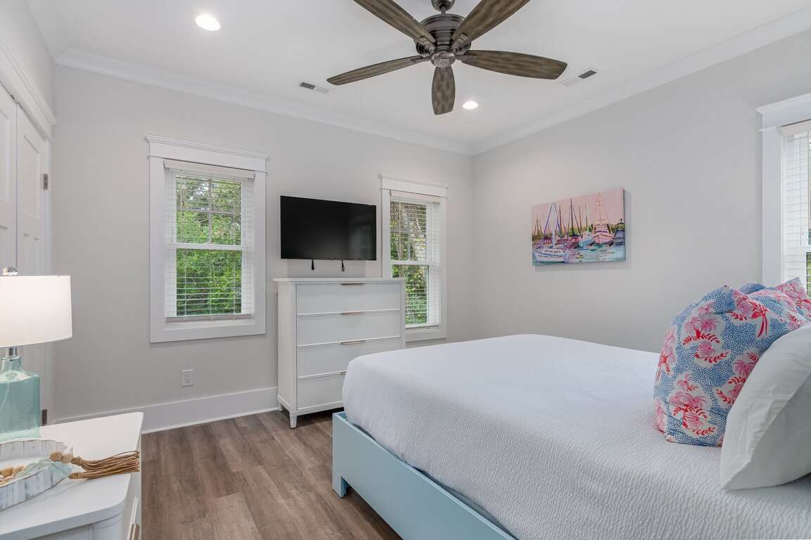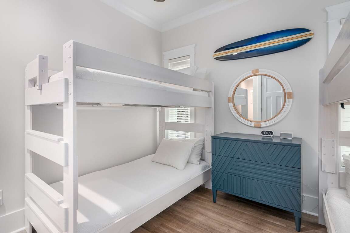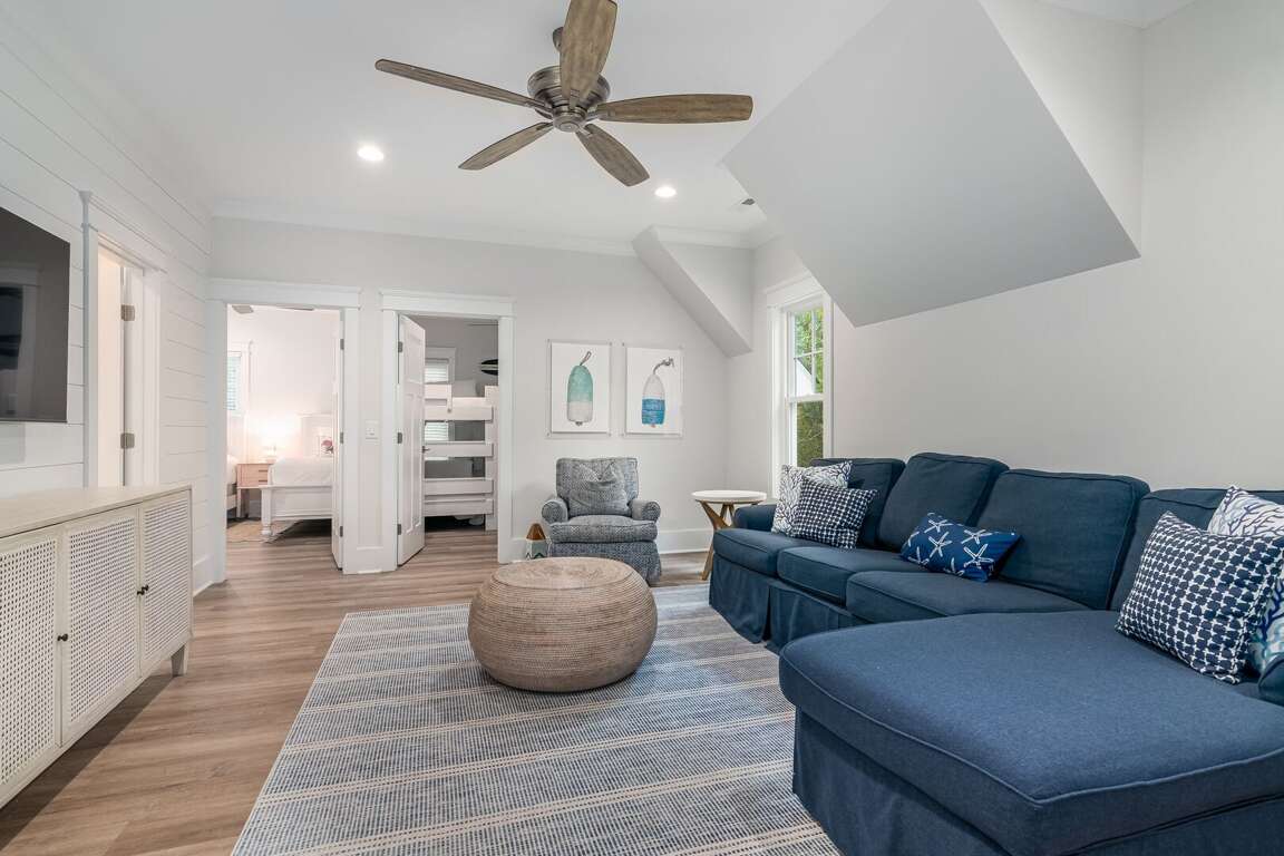 Located in the Live Oaks Forest of the Maritime Forest, this luxury house in Bald Head Island, NC offers a variety of sleeping arrangements to accommodate the needs of different guests. Downstairs, a master king bedroom with its own bathroom provides comfort and privacy. Upstairs, two queen bedrooms share a common bath, ideal for couples or families. For the younger guests, there are two additional bedrooms featuring two twin bunk beds and two singles, creating a space filled with bunk bed fun and kid-friendly spaces. Connected through a breezeway, the kids' living room/playroom adds to the property's family-friendly appeal. This house provides a serene setting for a memorable vacation.