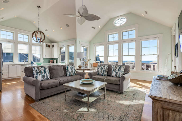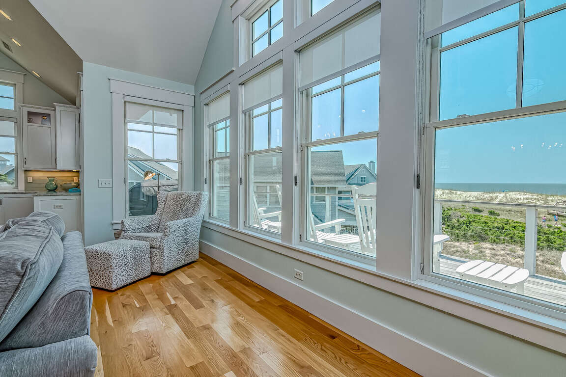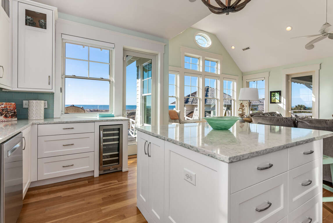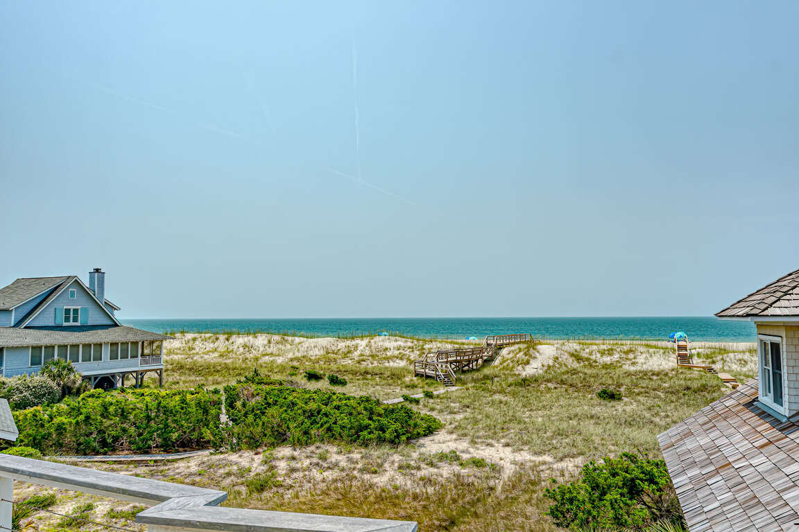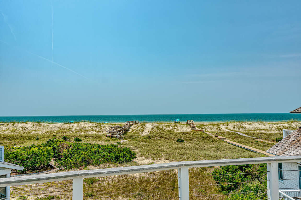Welcome to your dream vacation spot - a beautifully updated five-bedroom home, showcasing breathtaking views of the ocean from Bald Head Island's southern coastline. With a clever reverse floor plan, the house ensures you can relish the serene panorama at all times. On the ground floor, discover four charming bedrooms. The queen suite comes with a walk-in shower, while a fun-filled kids' room boasts two bunk beds and its own living area, perfect for youthful fun. Down the hall, uncover another bathroom with a stand-up shower, and two more queen bedrooms, one of which features a shower/tub combo. Venture upstairs to uncover a cozy living space, complete with an updated kitchen equipped with everything you need for your culinary adventures. The final gem on this level is the master suite with a king bed and an en-suite bathroom featuring a tiled stand-up shower. This room also offers you a private gateway to the expansive deck overlooking the ocean. The true highlight of the home is the large, welcoming back deck, complete with a propane grill, numerous rocking chairs, and a dining table. The deck offers the perfect setting for leisurely meals or relaxation as you soak up the ocean breeze. Feel free to explore the island's outstanding amenities in provided golf carts (one four-passenger and one six-passenger), and consider accessing the BHI or Shoals club for an additional purchase. Your dream vacation awaits!