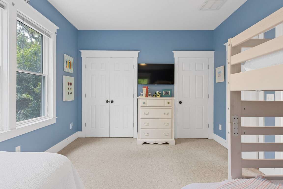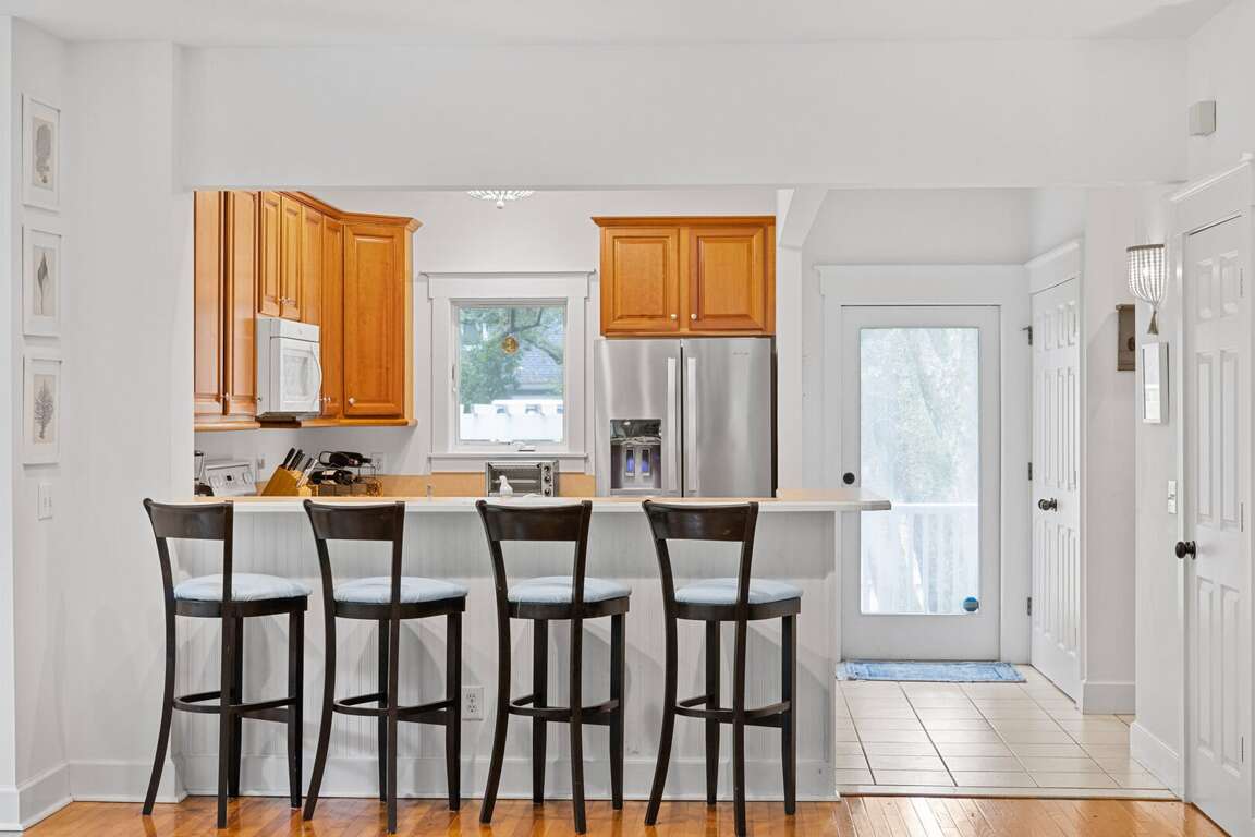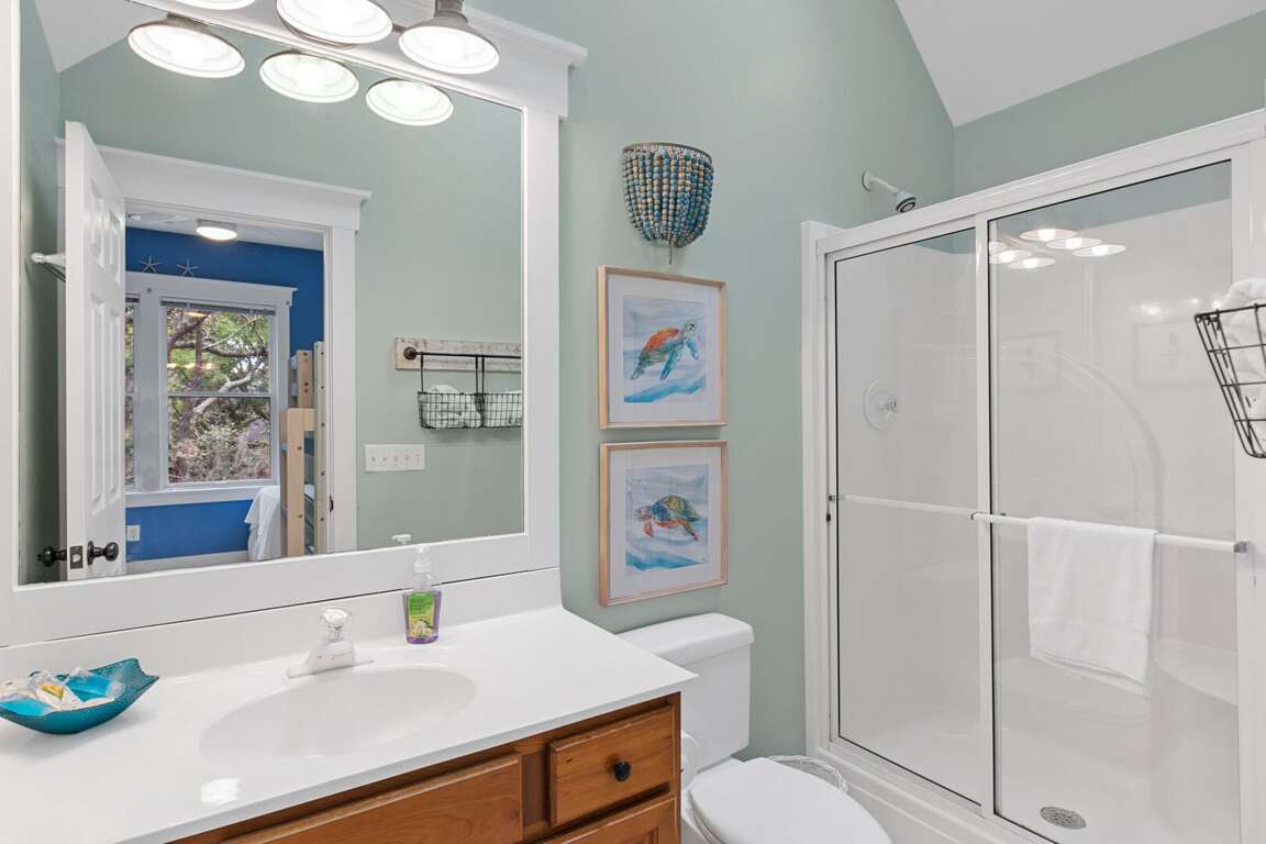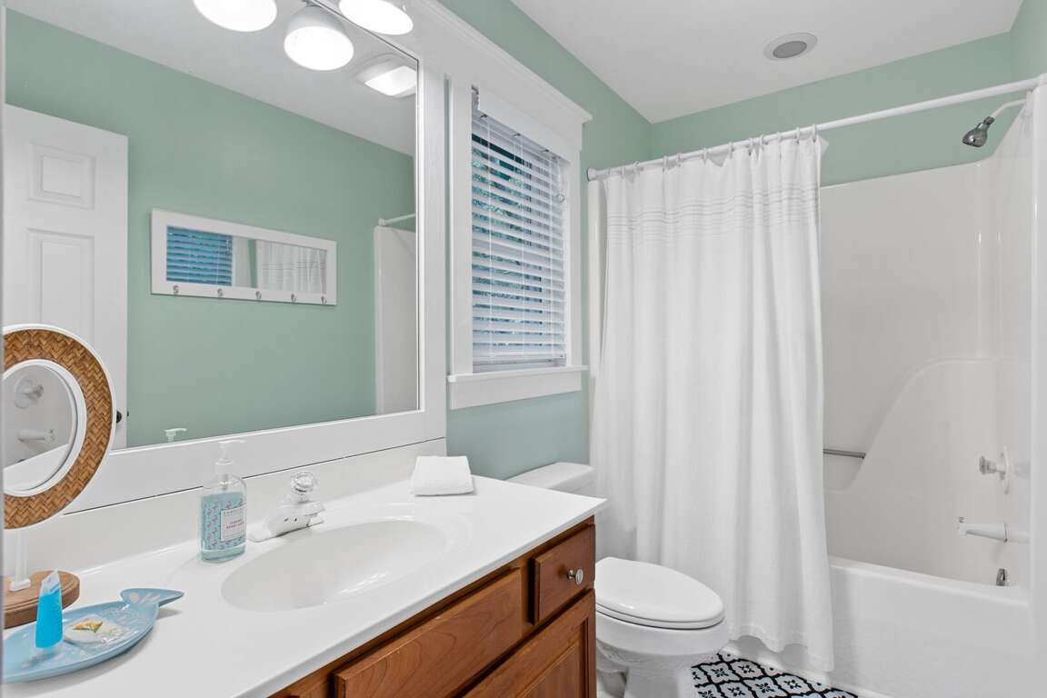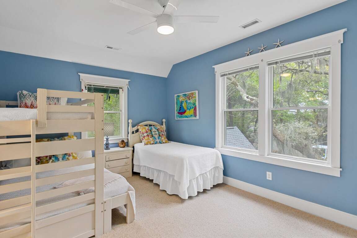 We invite you to experience the tranquility and comfort of our three-bedroom, three-bath home nestled on the lush greens of Bald Head Island's golf course. Each room comes equipped with its own bathroom, ensuring your comfort and privacy. The heart of the house is a spacious open-concept living, dining, and kitchen area on the ground floor. The screened porch is the perfect spot to sip your morning coffee while taking in the stunning course views and local wildlife. One of the bedrooms, featuring a queen bed and an attached bathroom with a tub/shower combo, is located downstairs for easy accessibility. The upper level houses two more bedrooms. One is a perfect haven for kids with a bunk bed and an additional twin bed, while the other boasts a king bed, a generous dual-sink vanity, and a shower tub combo. This master room also has its very own serene balcony with inspiring views of the surrounding greenery. And for a bit of fun, feel free to explore the island using either our 4 or 6 passenger golf cart.