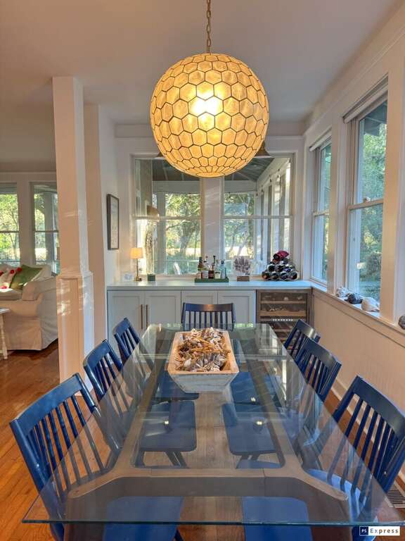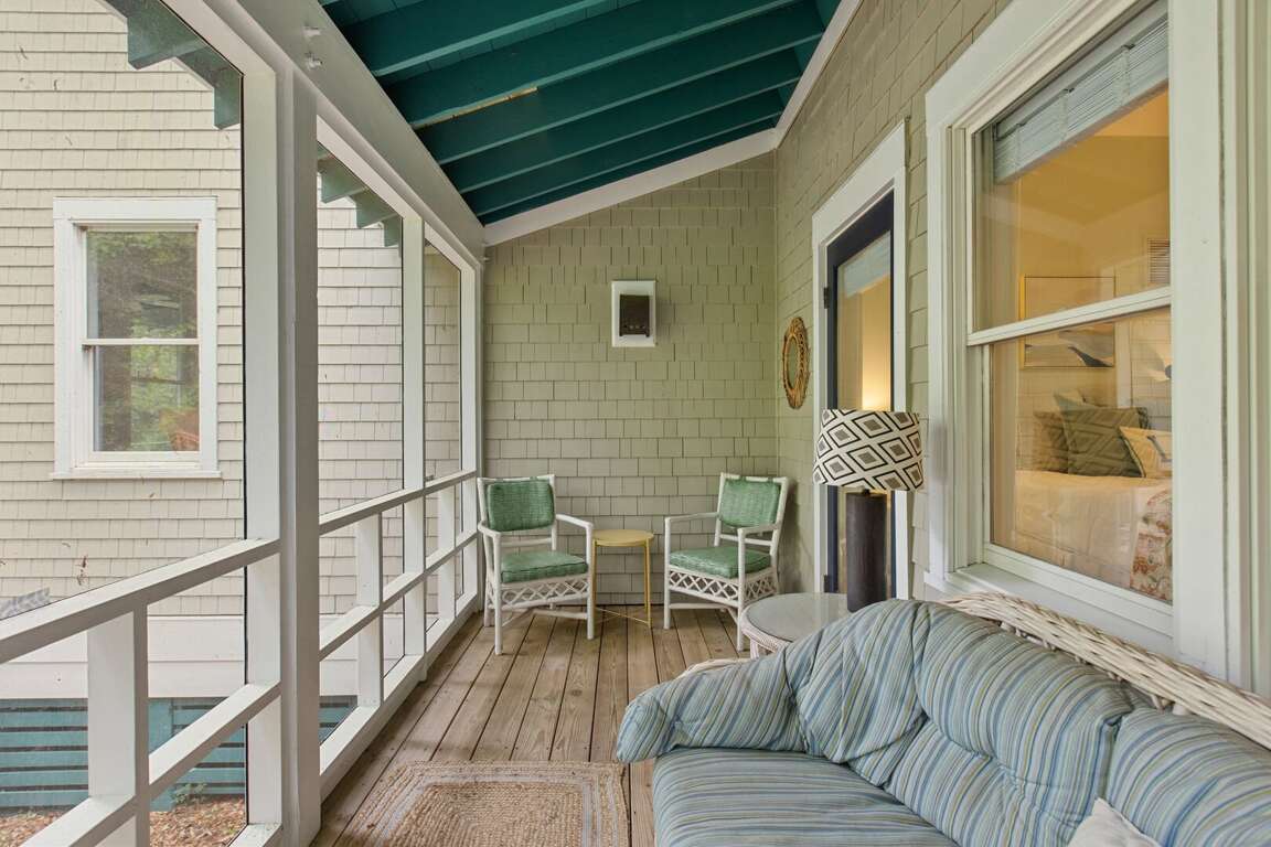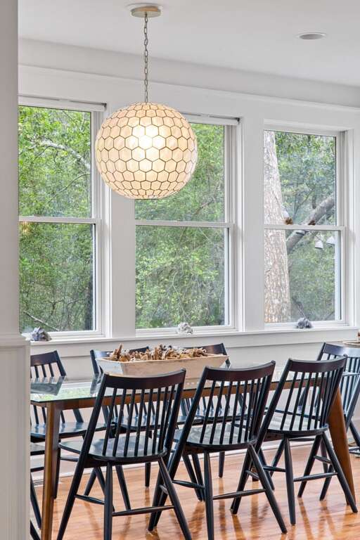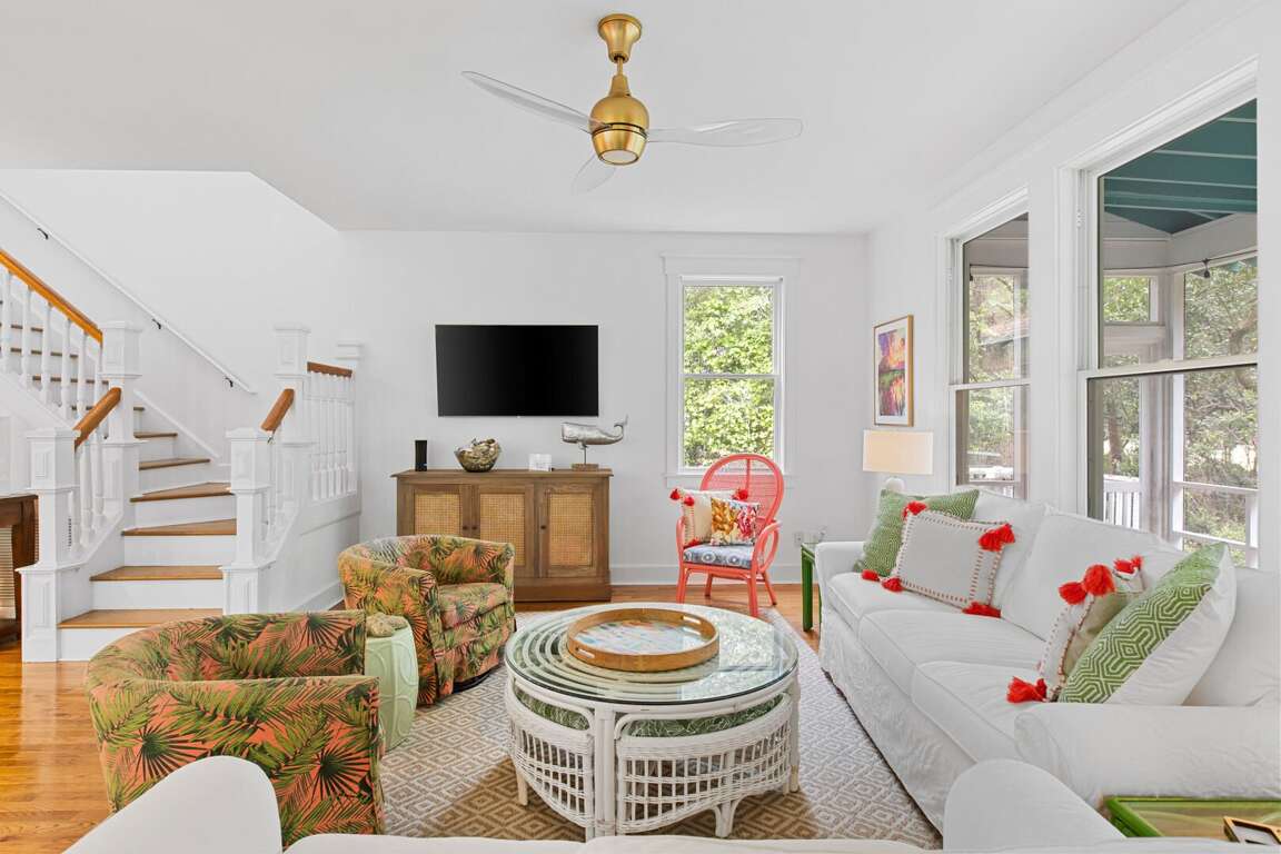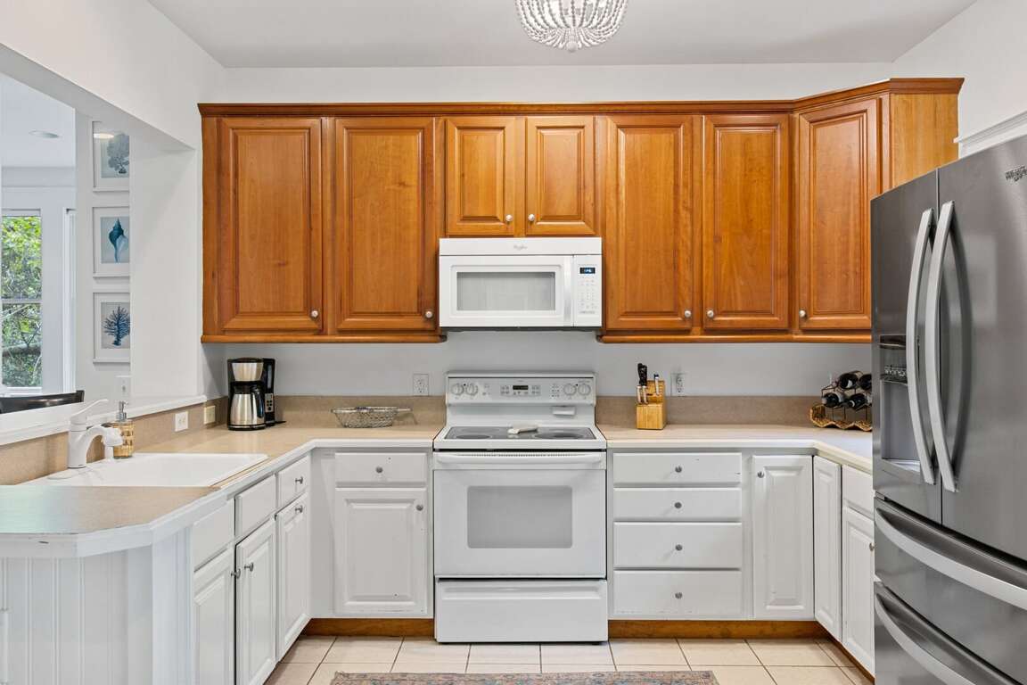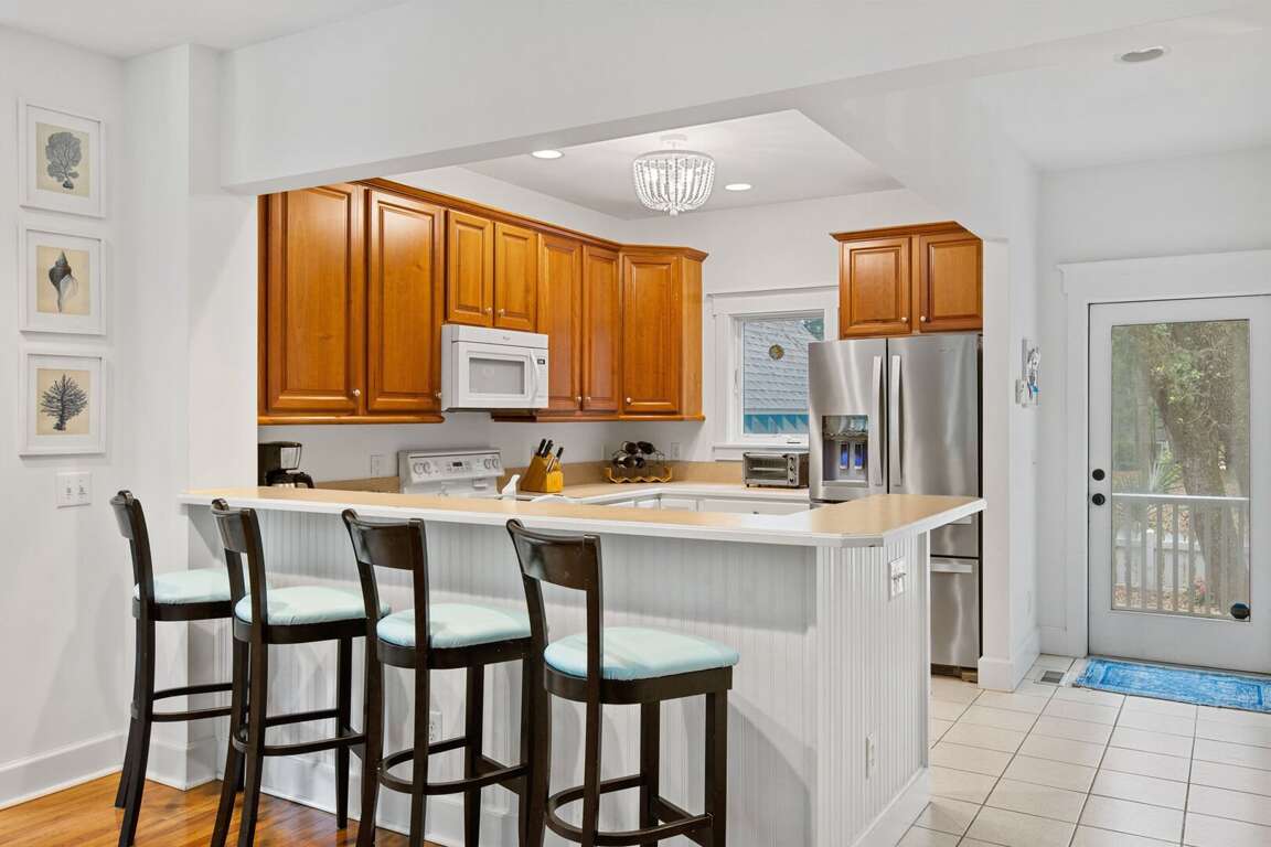 We invite you to experience the tranquility and comfort of our three-bedroom, three-bath home nestled on the lush greens of Bald Head Island's golf course. Each room comes equipped with its own bathroom, ensuring your comfort and privacy. The heart of the house is a spacious open-concept living, dining, and kitchen area on the ground floor. The screened porch is the perfect spot to sip your morning coffee while taking in the stunning course views and local wildlife. One of the bedrooms, featuring a queen bed and an attached bathroom with a tub/shower combo, is located downstairs for easy accessibility. The upper level houses two more bedrooms. One is a perfect haven for kids with a bunk bed and an additional twin bed, while the other boasts a king bed, a generous dual-sink vanity, and a shower tub combo. This master room also has its very own serene balcony with inspiring views of the surrounding greenery. And for a bit of fun, feel free to explore the island using either our 4 or 6 passenger golf cart.