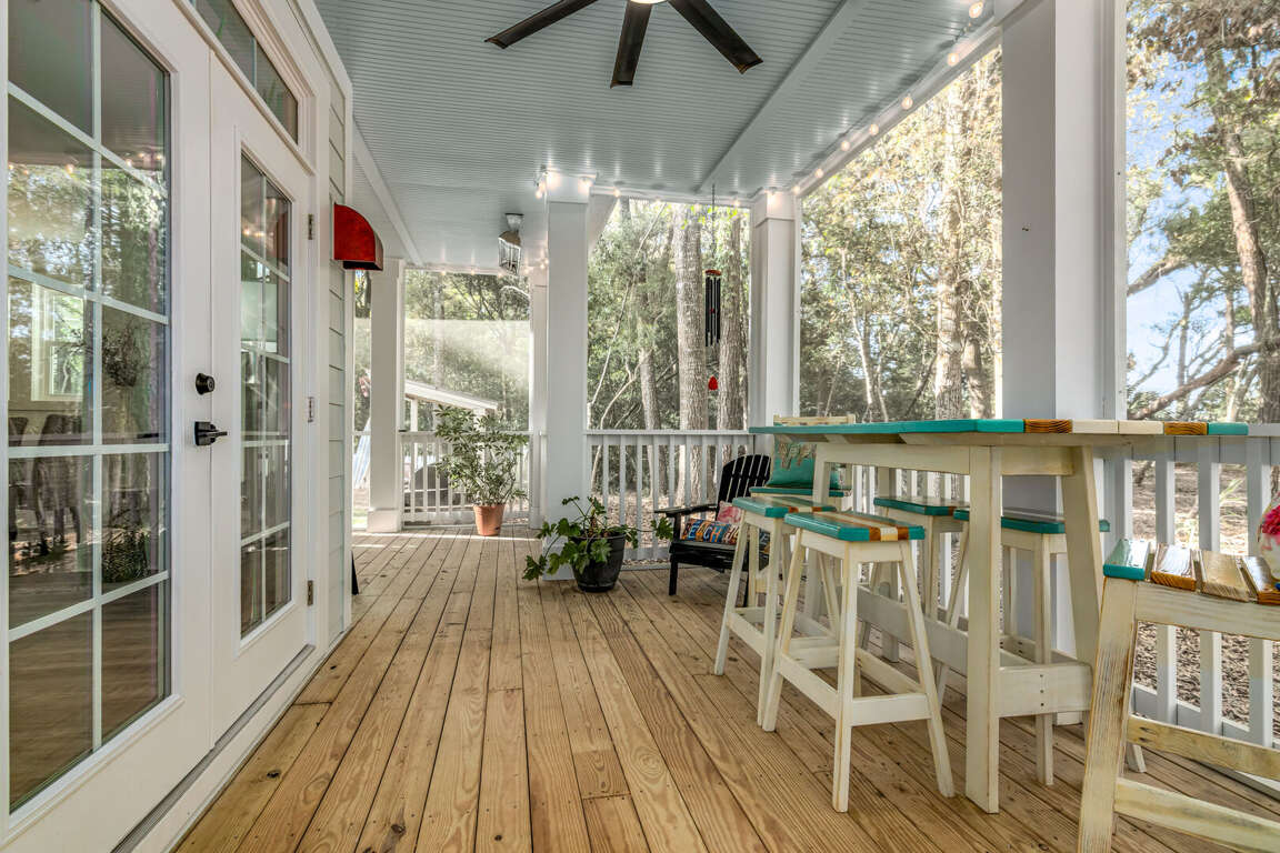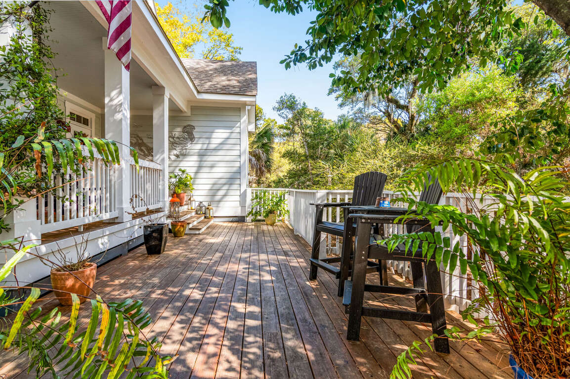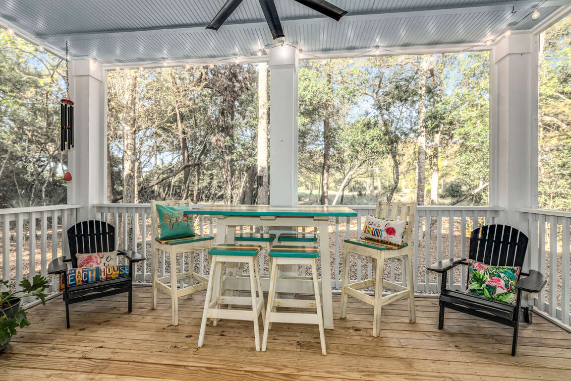 Stay at our cozy five-bedroom home in the heart of Bald Head Island with stunning golf course views. Relax on multiple porches, soaking in the sights and sounds of the maritime forest. The spacious open floor plan downstairs includes a large kitchen with upgraded appliances, a big dining table, and a comfy living area perfect for family time. Step out to the screened-in porch or enjoy the fenced side yard with grilling space, great for your furry friends. The master bedroom is downstairs with a queen bed, a big walk-in shower, and a separate tub for ultimate relaxation. Upstairs, there are four more bedrooms and three bathrooms. Explore the island using our two golf carts and enjoy the BHI club (available for separate purchase).<br />
