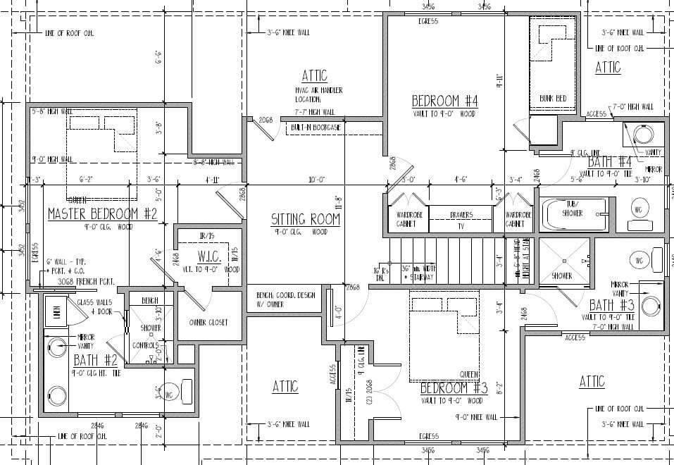 BR4 (up): queen + bunk recess with 2 twins; tub/shower combo<br />
