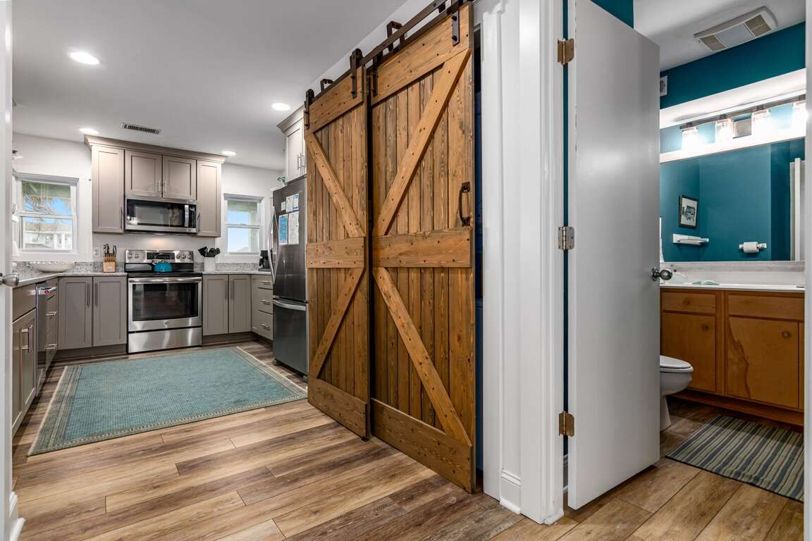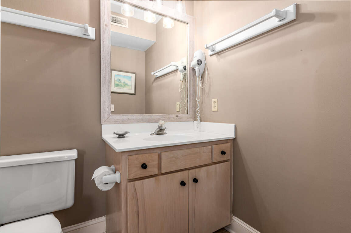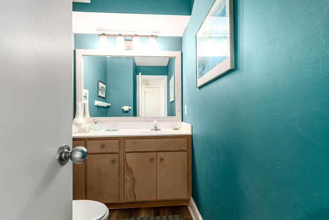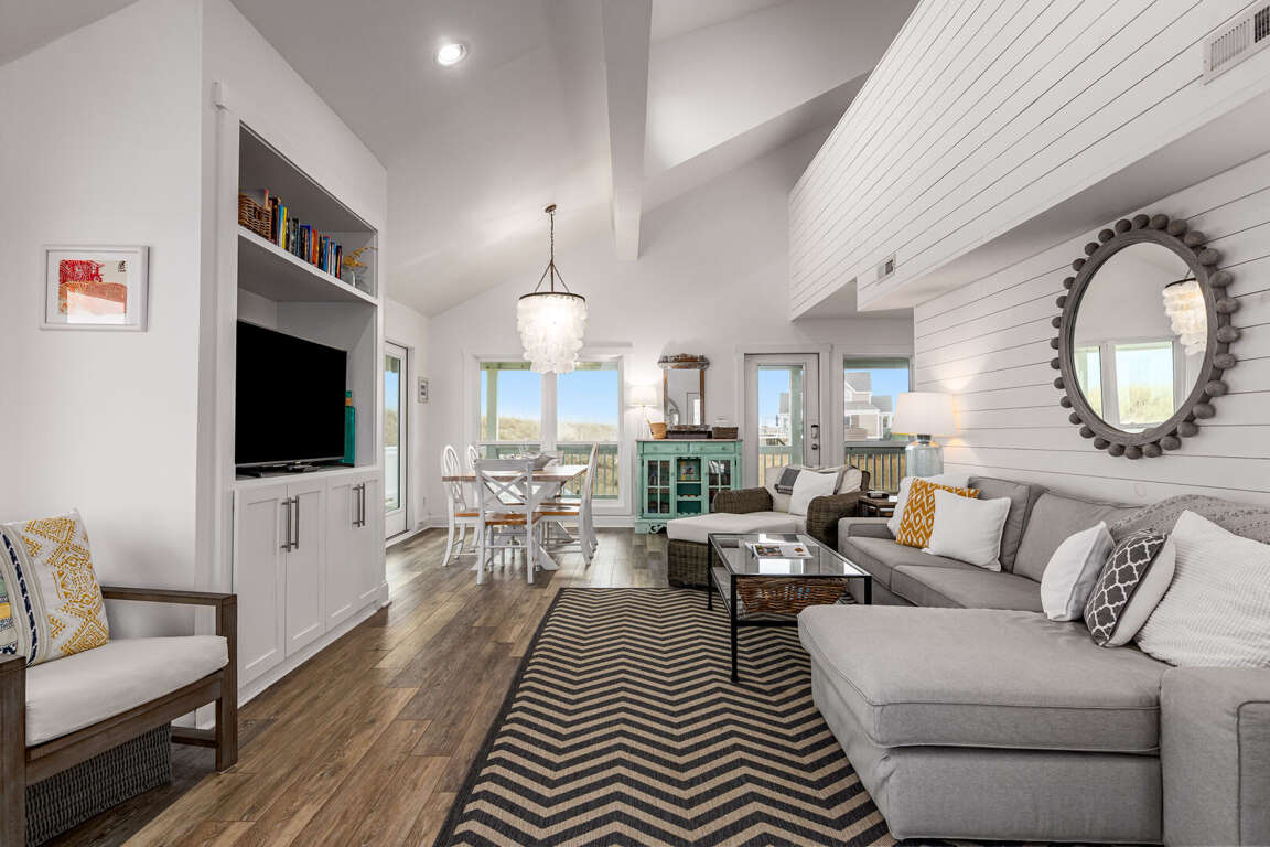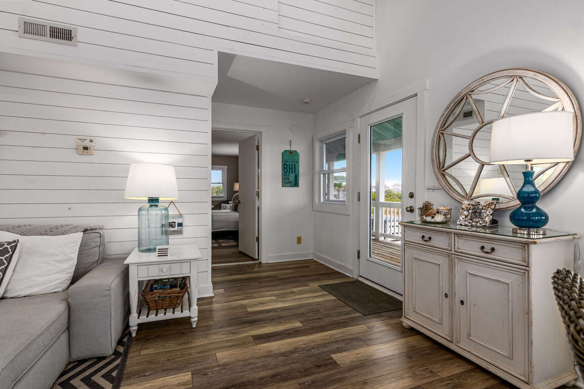 Step into the main living area, where you’ll find a welcoming space with comfortable seating — perfect for relaxing after a day at the beach. The primary suite is conveniently located on this level and features a king bed and a private bathroom with a shower/tub combination. Just off the living area, the kitchen is well-situated for easy access and includes a nearby half bath for added convenience.<br />