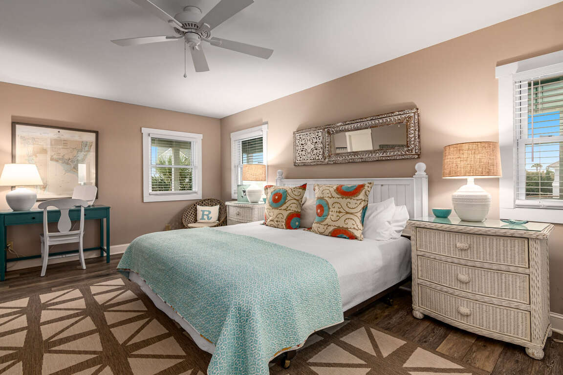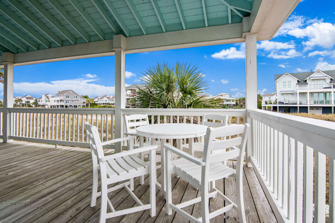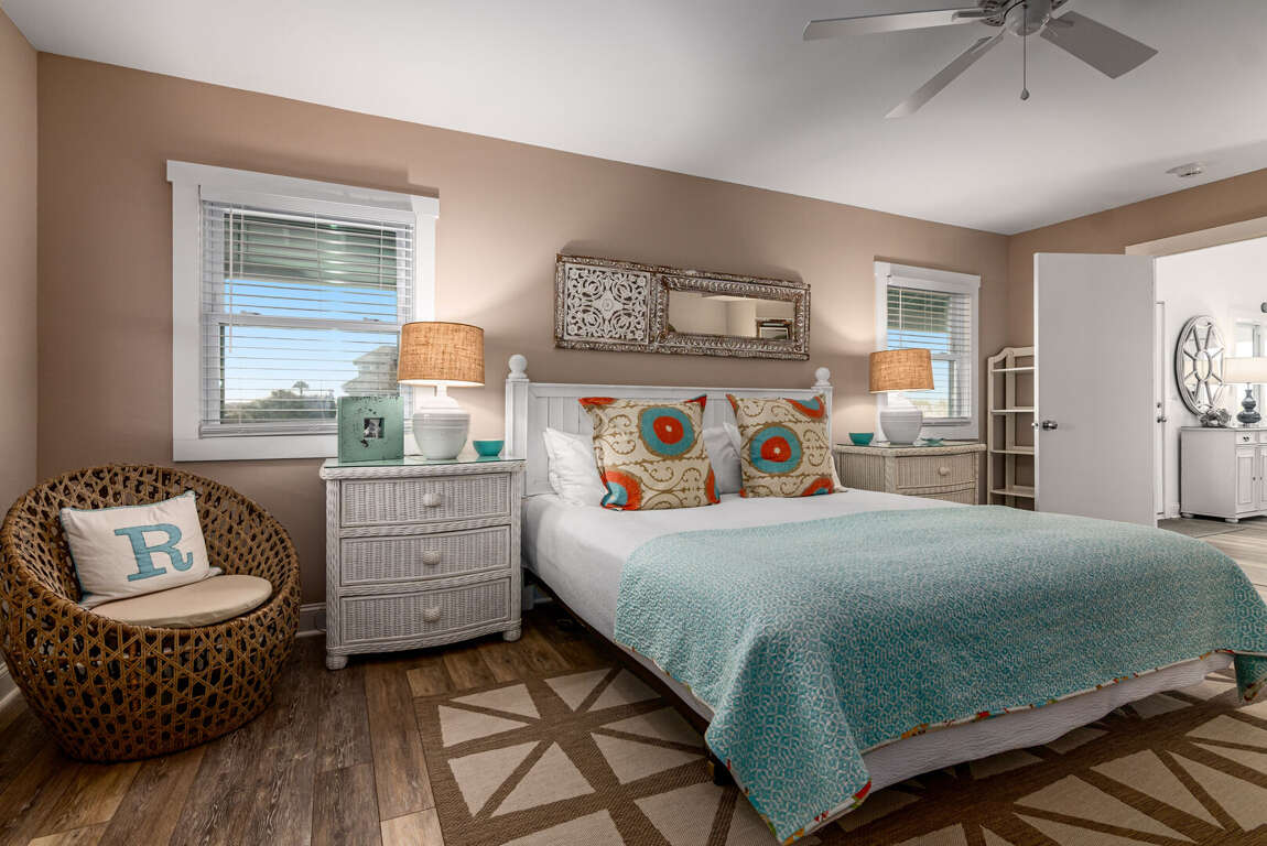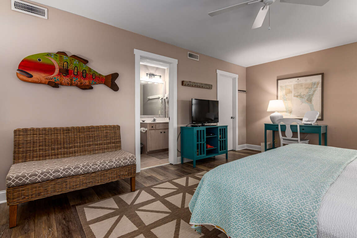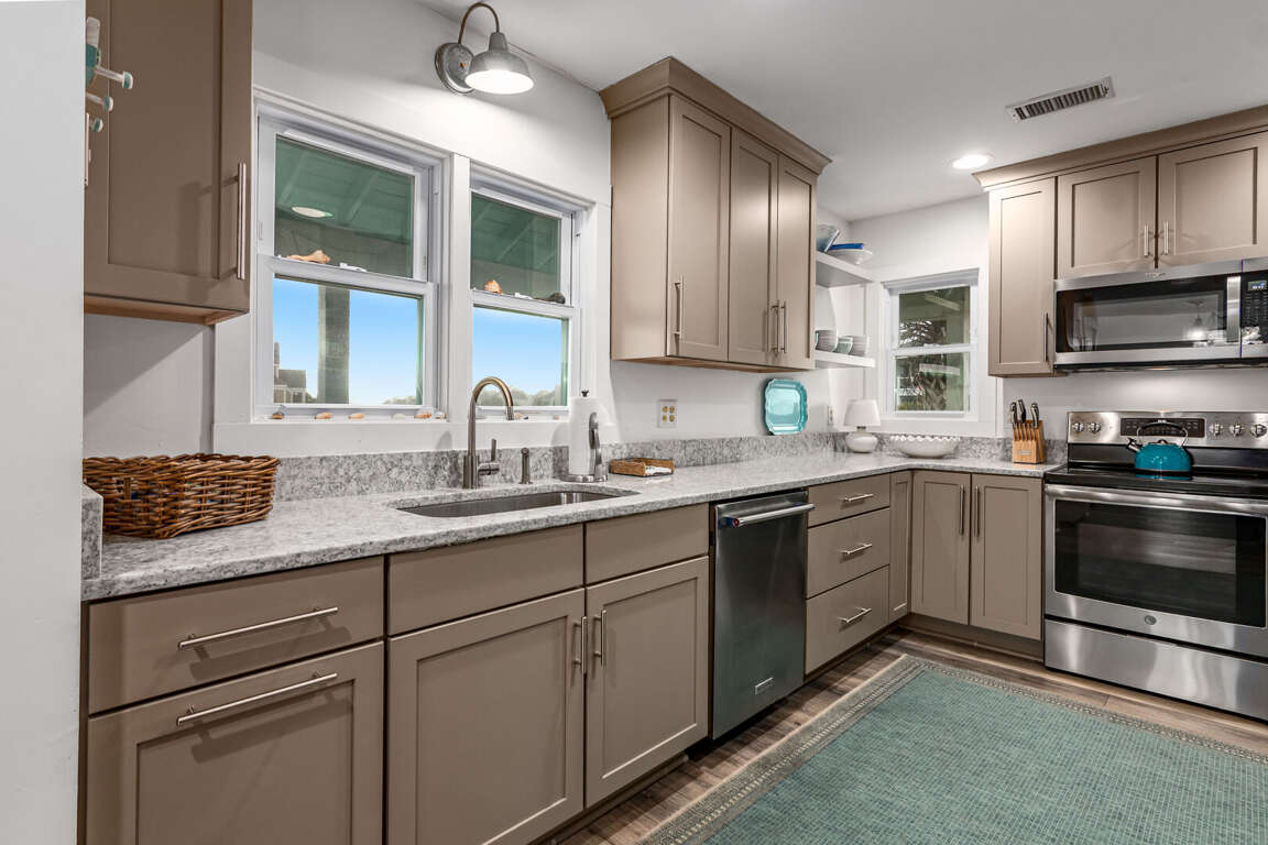 Step into the main living area, where you’ll find a welcoming space with comfortable seating — perfect for relaxing after a day at the beach. The primary suite is conveniently located on this level and features a king bed and a private bathroom with a shower/tub combination. Just off the living area, the kitchen is well-situated for easy access and includes a nearby half bath for added convenience.<br />