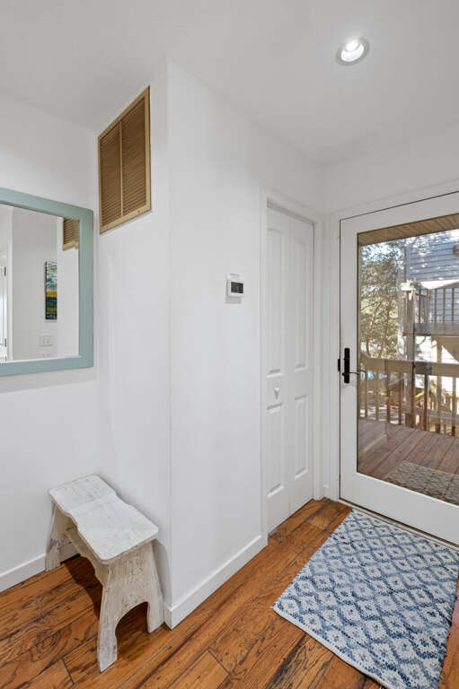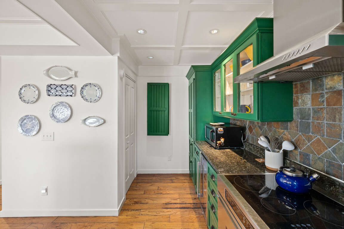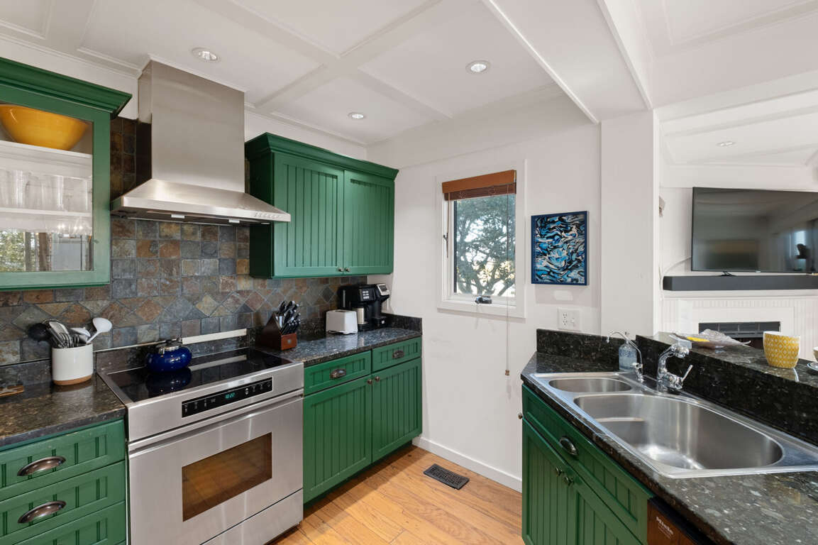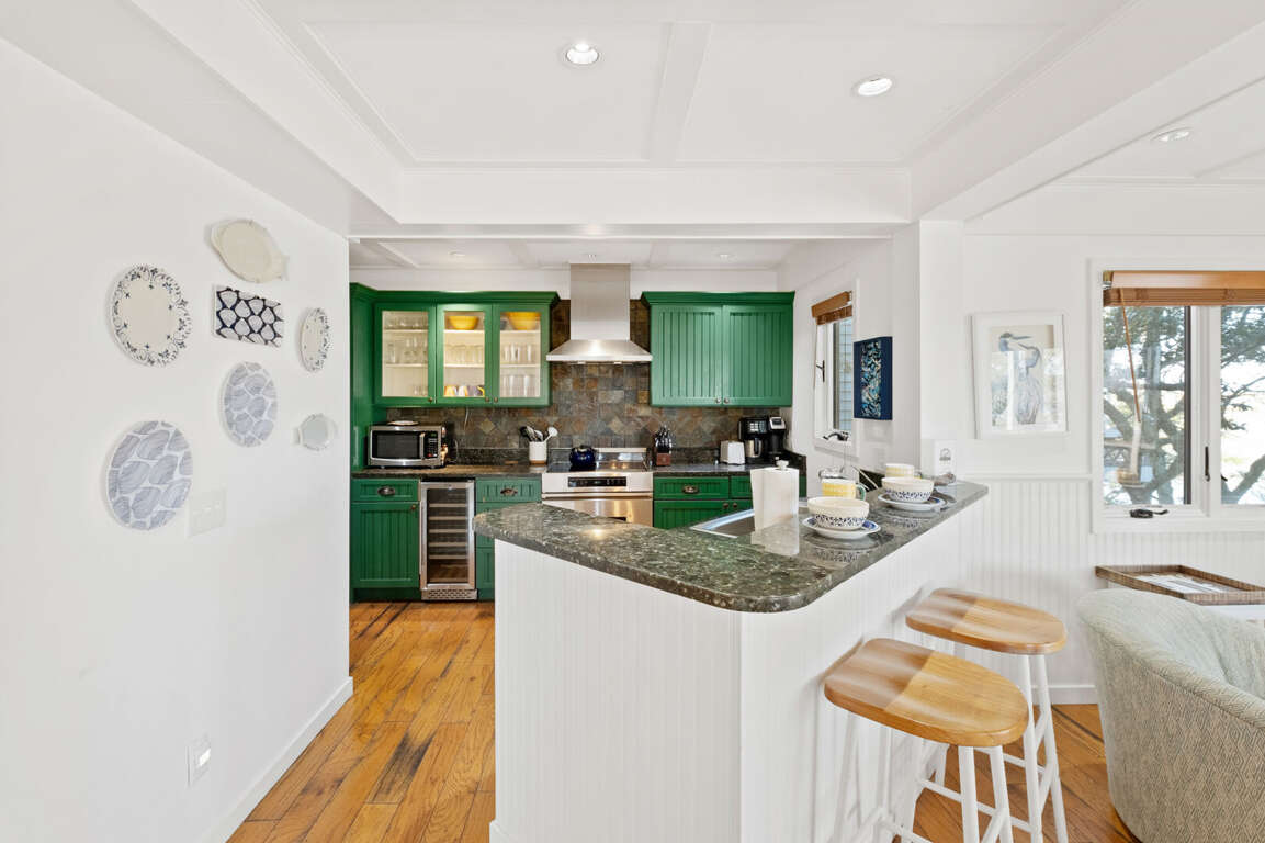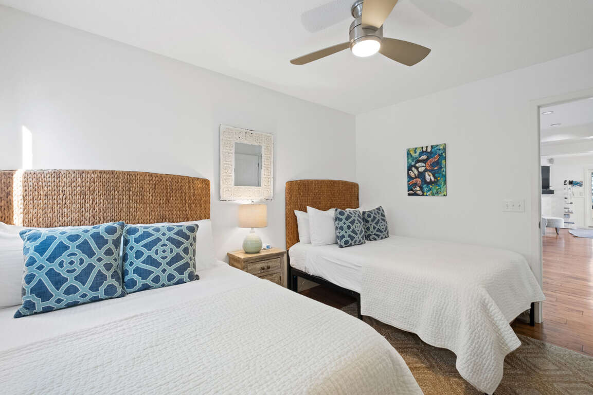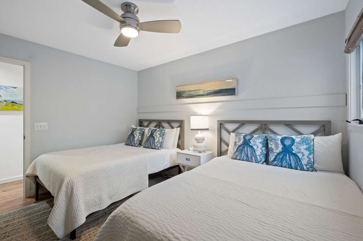 Close by, the ample kitchen features stainless steel appliances (including a wine cooler), high-end cabinetry, plenty of granite counter space for prepping, and a custom tile backsplash. This one-level property has the first two bedrooms, each furnished with two double beds, and share a tiled full bath just across the hall. The roomy king suite, located at the end of the hall for additional privacy, pampers with a private sitting area, a handsomely tiled ensuite, along with a large closet and its own entry to the covered deck, where salt breezes and sunshine grant soothing serenity.<br />