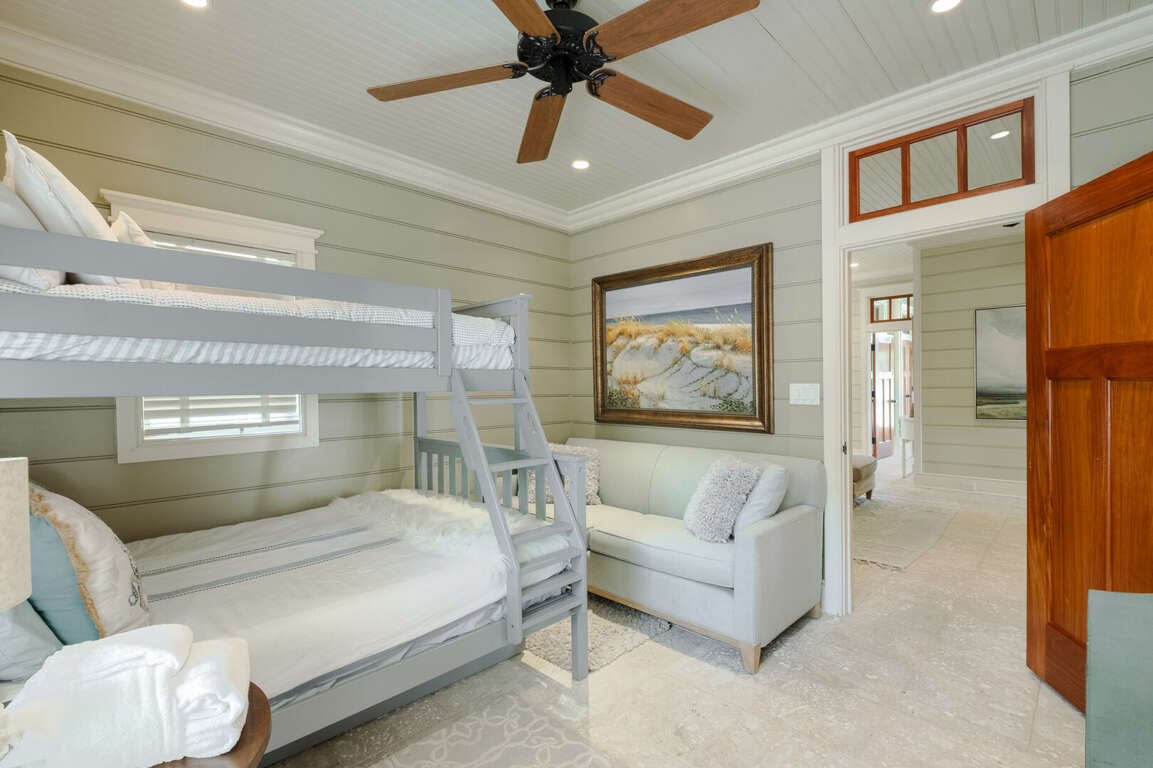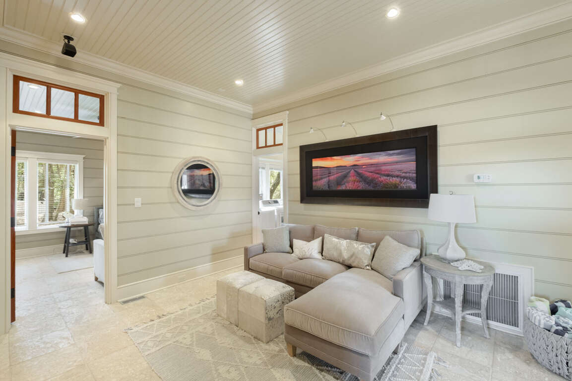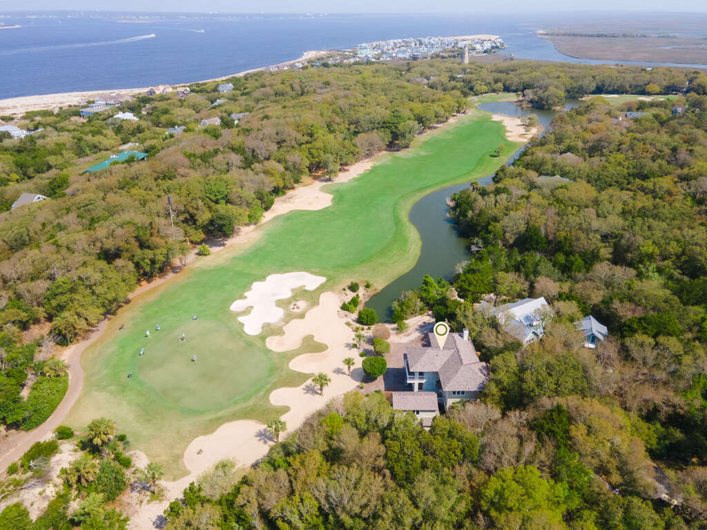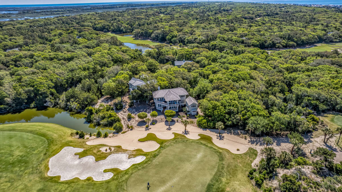 At the end of a winding, wooded road, on a very private double lot under a canopy of Live Oaks, this five-bedroom, five-bath executive sanctuary offers the serenity you seek just minutes from Bald Head Island's beaches, clubs, shops, and restaurants. Overlooking the BHI Club’s seventh green, 7th Heaven's covered front porch welcomes and beckons you to stop, sit, relax, and savor the sounds of ocean and bird song as well as the whispering of breezes through the palms. Alight here or just inside in the bright foyer-furnished for comfy conversation or a quiet read. Around the corner, a central living space with wall-to-ceiling built-ins offers a great alternative to the main living area to play a game or watch a movie. On this level, there are three pampering suites. The first is a sunny corner queen with a large closet, access to the covered back porch, and a beautifully appointed ensuite. The next is a cheery corner king with its own sitting area, a walk-in closet, access to the back porch, and a spa-like ensuite. The third is a bunkroom outfitted with a full and a twin, along with a couch, a large walk-in, and its own bath with a tub. The laundry completes this floor. <br />